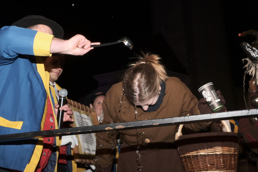 Die Einstimmung auf die neue Fasnet war jedenfalls – trotz des einsetzenden Regens – schon einmal sehr vielversprechend. Nass (gemacht) wurden dann auch die Neu-Narren, die nach dem Schwur auf die Vereinssatzung – zunächst mit einem Spezialgetränk von innen angefeuchtet – noch mit einer Schöpfkelle über das Narrenhaupt geschütteten Wassers ihre Aufnahme in den Kreis der Wurzacher Narren feiern durften.