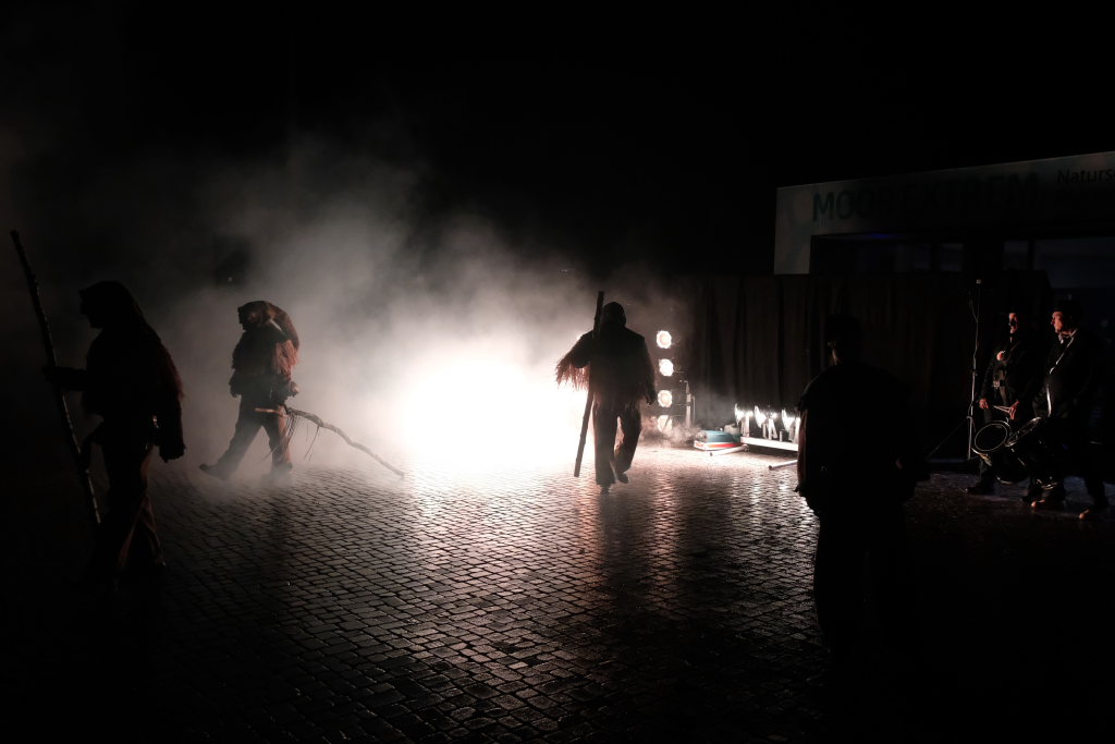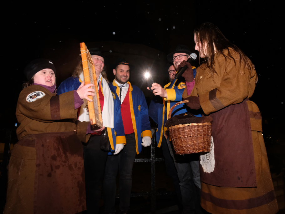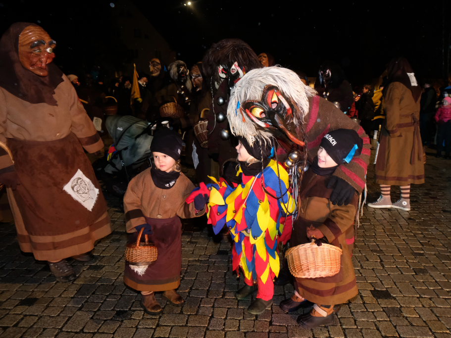 Zunftmeister Dominik Neher trug die traditionellen Geschichten und Sagen zu den einzelnen Narrenfiguren vor, während diese dann durch einen Vorhang aus Stoff und künstlichem Nebel ins Rampenlicht vor die kleine Bühne zu Füßen von St. Verena und Maria Rosengarten traten. Beginnend mit dem Namensgeber der Zunft, dem Riedmeckeler, dem das Moorweibla, die Burgfrau und das Schnepfle in seinem in den Stadtfarben gehaltenen „Federkleid“ folgten. Mit bei den Moorweibla dabei: Die Zunftfahne, auf die später die Täuflinge der Zunft die Treue schwören durften.