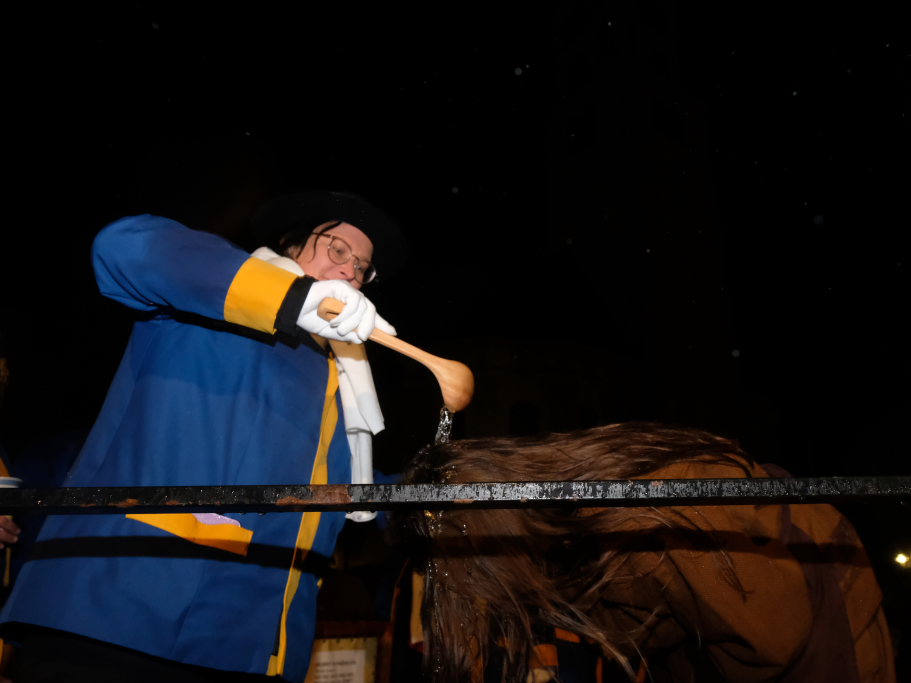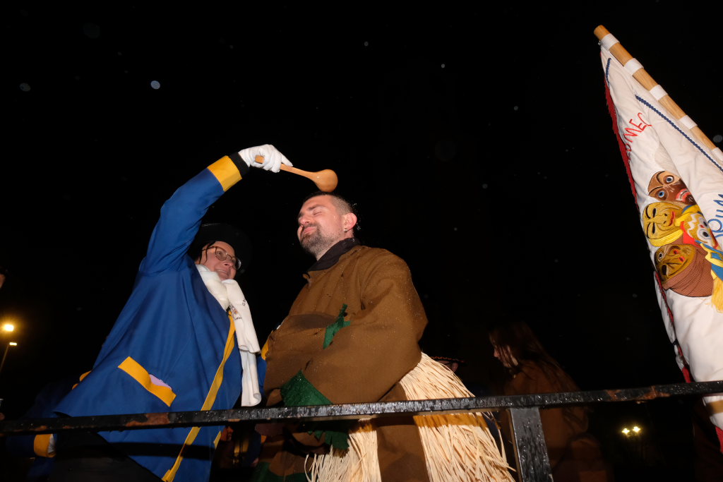 Mona Schwarz, Michael Fuchs und Lucie Schütt waren die diesjährigen Neuaufnahmen. Die Täuflinge bekamen dazu eine Kopfdusche, die in diesem Jahr eigentlich beinahe überflüssig war, mit einem Schöpflöffel aus Holz, aus einem Eimer gefüllt mit feinstem Achwasser. Bevor sie einen kräftigen Schluck eines Spezialgebräus und einen ordentlichen Schluck von einem Hochprozentigen zu sich nehmen durften, mussten sie die Eidesformel auf den Narrenverein schwören. Darin heißt es unter anderem: „Hiermit schwöre ich, dass ich nach bestem Wissen und Gewissen für die Belange der NZ Bad Wurzach einstehe, aktiv am Vereinsleben teilnehme und versuchen werde, ein vorbildliches Mitglied zu sein”. Mit einem Kuss auf die Vereinsfahne wurde ihre Mitgliedschaft endgültig besiegelt.