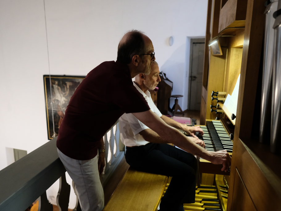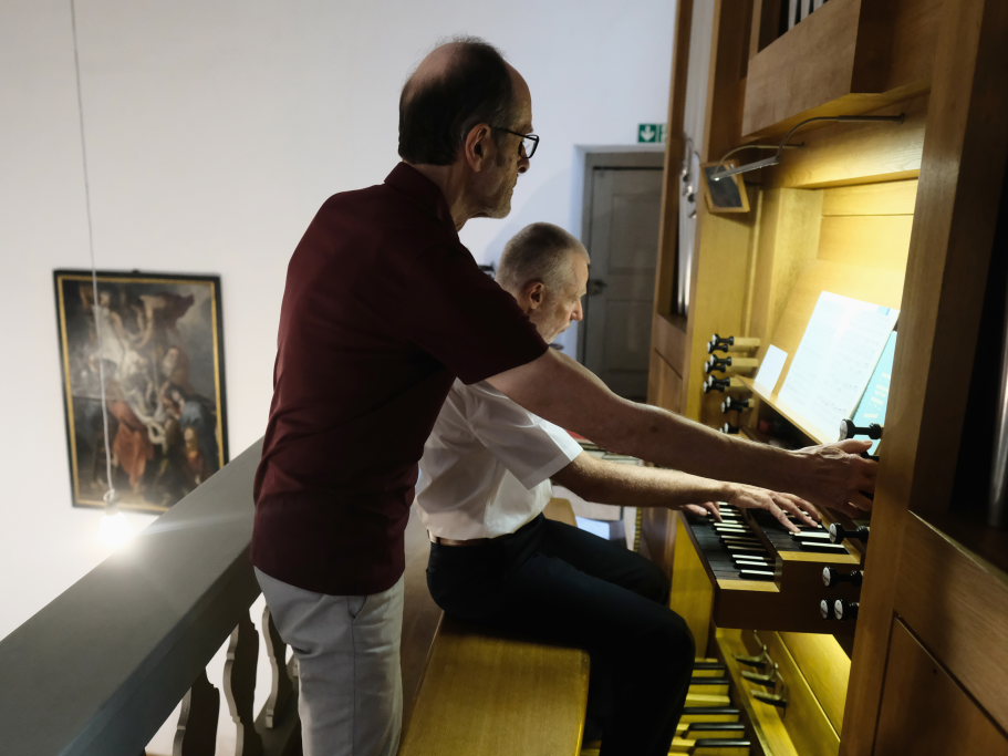 Bad Wurzach – Werke von Bach, Mozart, Liszt und Eben, aber auch von Franz Xaver Schnizer einem in Wurzach geborenen Komponisten, Organisten und Priester aus dem Kloster Ottobeuren, spielte Robert Häusle bei seinem Fiori musicali Orgelkonzert in der Schlosskapelle. An seiner Seite Karl Guter, der ihm die Orgel perfekt registrierte und dabei – wie der Organist – bei einigen Stücken Schwerstarbeit leisten musste.