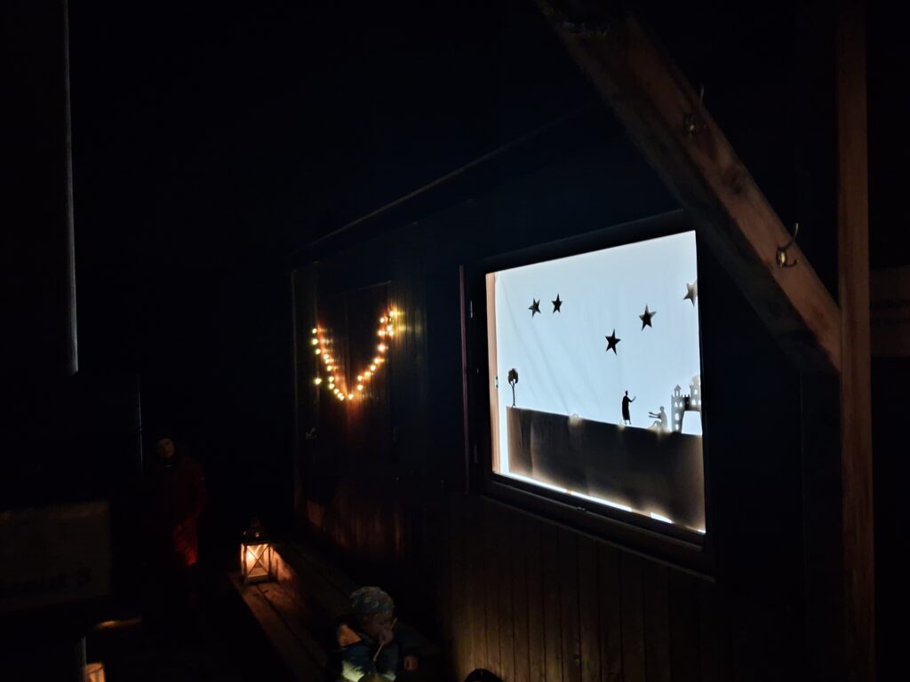 Wieder zurück auf der Waldwiese versammelten sich alle vor einem der Bauwagen. Die Eulen, so werden die Vorschüler genannt, präsentierten ein Schattentheater, das sie in den letzten Wochen vorbereitet und einstudiert hatten. Mit selbst gestalteten Figuren stellten sie die Geschichte von Sankt Martin dar.