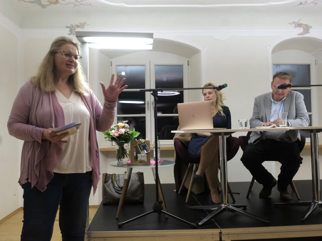 Die Leiterin der Stadtbücherei, Cornelia Merk, erklärte in ihrer Begrüßung, warum das Festival nach dem Zusammenschluss von Allgäuer Literaturfestival und Literaturfestival Nordschwaben nun Literaturfestival Allgäu-Schwaben heißt. Durch den Zusammenschluss habe sich auch ein viel längerer Veranstaltungszeitraum ergeben, weswegen die Veranstaltung in Bad Wurzach nun bereits Anfang März anstatt Anfang Mai stattfand.