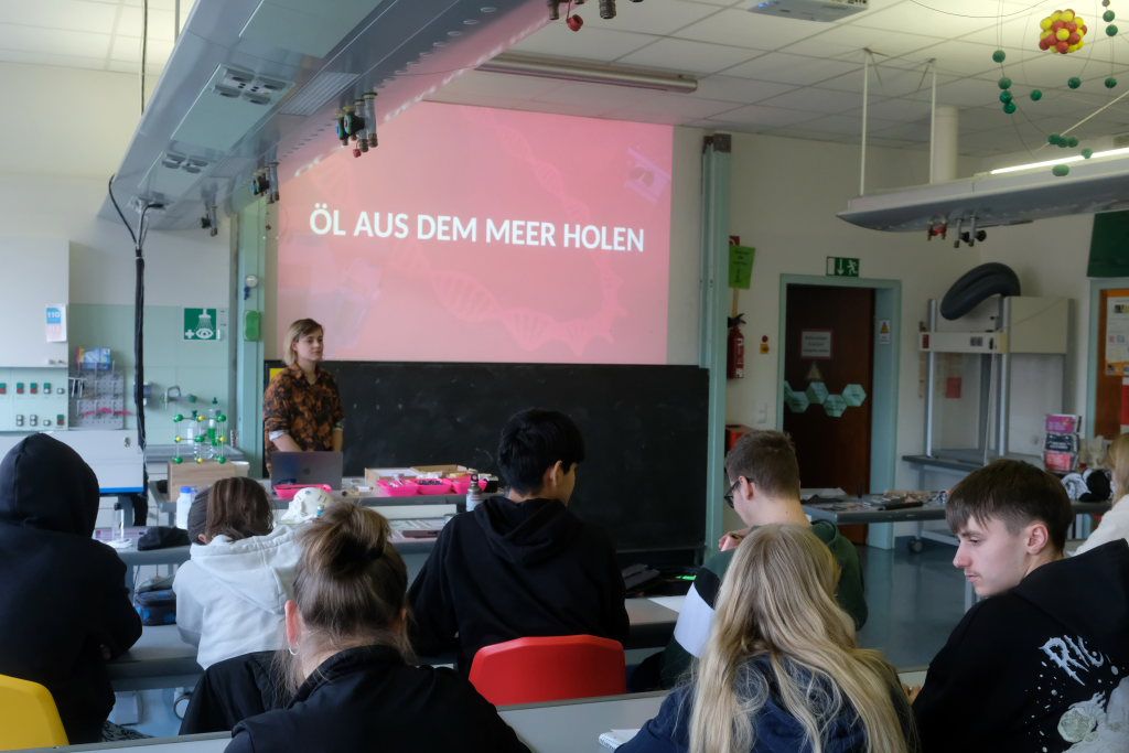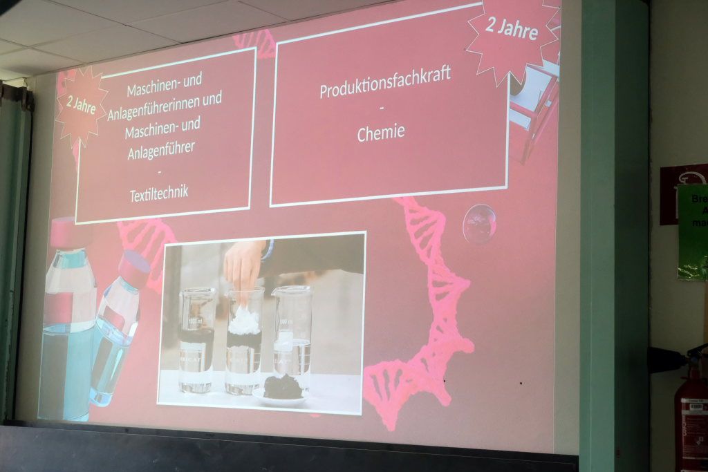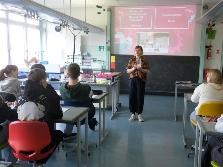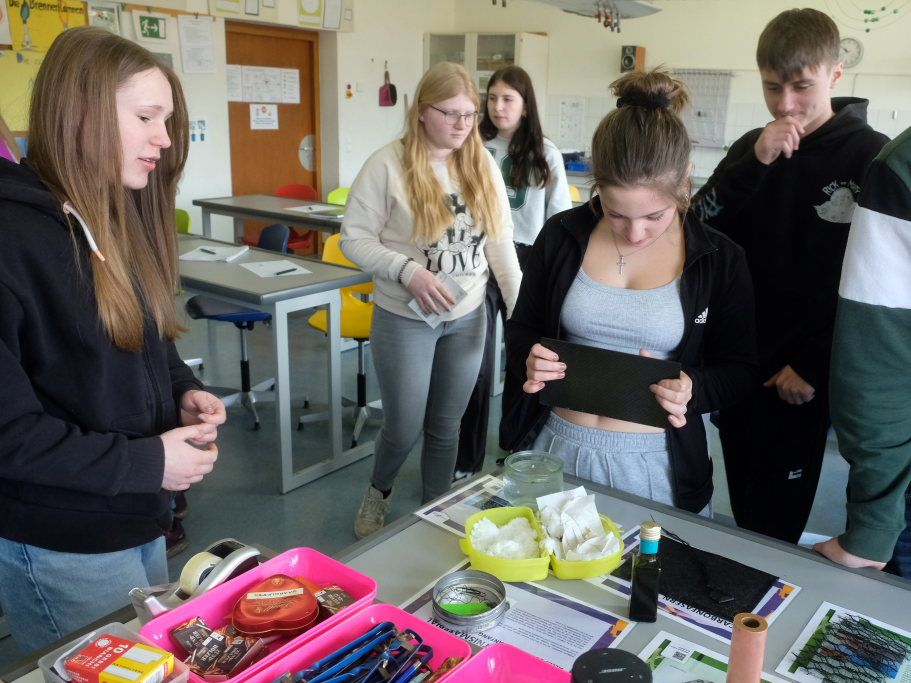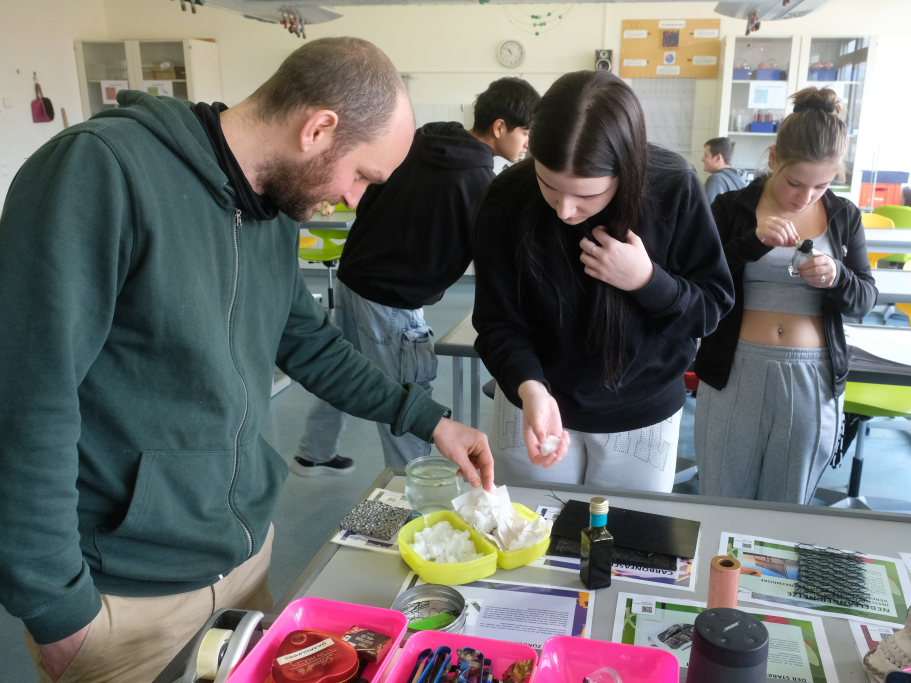 Eines davon spielte auch beim dritten Thema eine Rolle, das die Schüler noch während der Doppelstunde angerissen bekamen, nämlich das Umweltthema „Wie bekomme ich ausgelaufenes Öl aus dem Meer?“ Bisher wurden bei entsprechenden Schiffskatastrophen Barrieren errichtet und dann das Öl kontrolliert abgefackelt. Mit der per Zufall entdeckten Wachswatte lässt sich Öl rückstandsfrei vom Wasser trennen. Die entsprechenden Berufsbilder sind Maschinenführer – etwa in der Textilindustrie – oder Produktionsfachkraft Chemie, die jeweils zwei Jahre lang dauern.