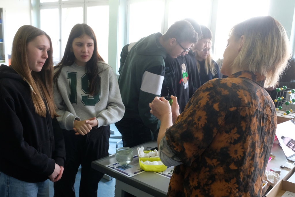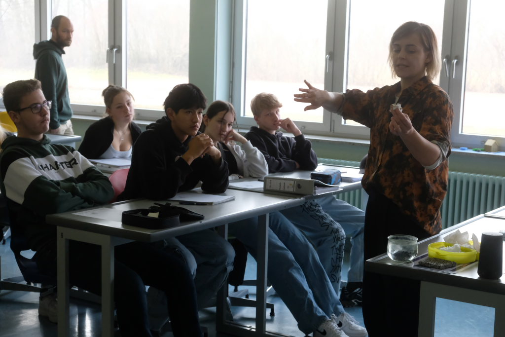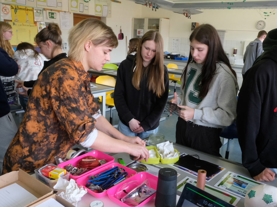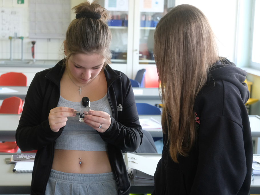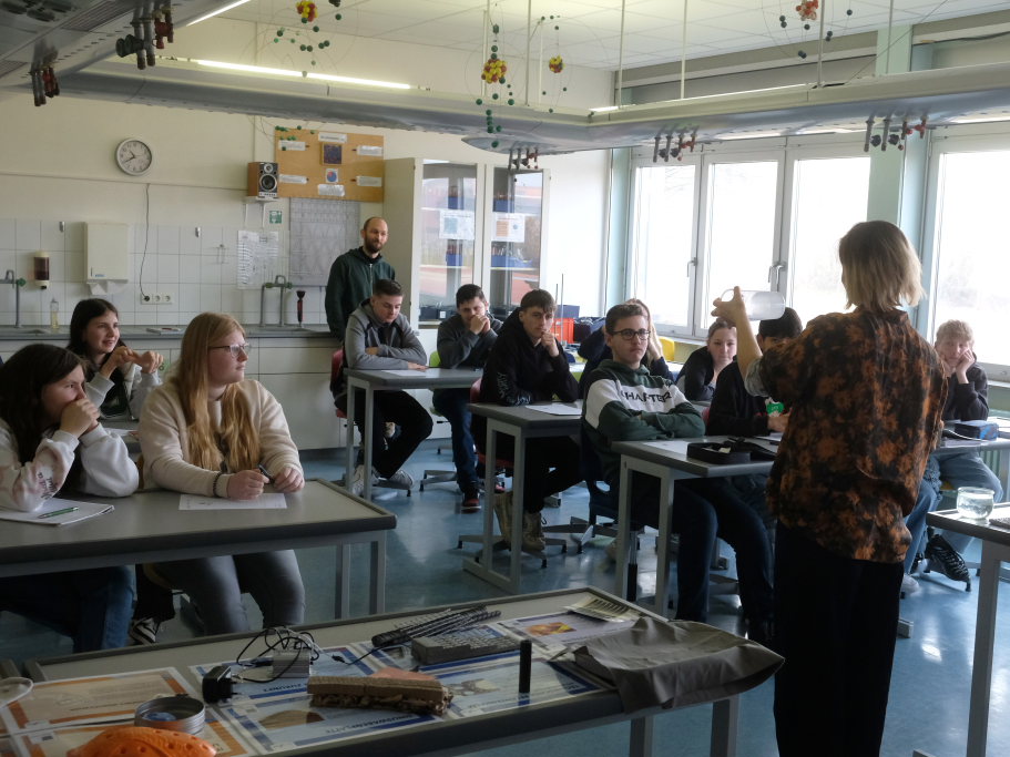 Eines davon spielte auch beim dritten Thema eine Rolle, das die Schüler noch während der Doppelstunde angerissen bekamen, nämlich das Umweltthema „Wie bekomme ich ausgelaufenes Öl aus dem Meer?“ Bisher wurden bei entsprechenden Schiffskatastrophen Barrieren errichtet und dann das Öl kontrolliert abgefackelt. Mit der per Zufall entdeckten Wachswatte lässt sich Öl rückstandsfrei vom Wasser trennen. Die entsprechenden Berufsbilder sind Maschinenführer – etwa in der Textilindustrie – oder Produktionsfachkraft Chemie, die jeweils zwei Jahre lang dauern.