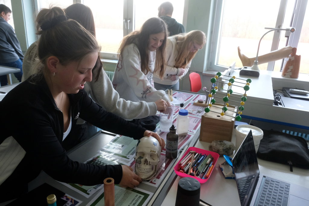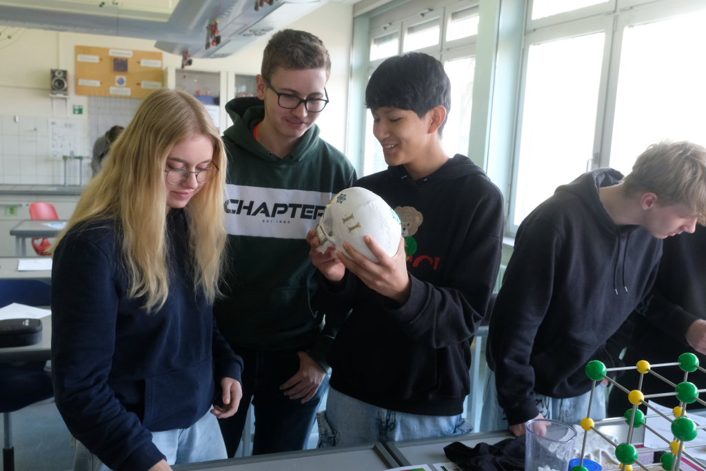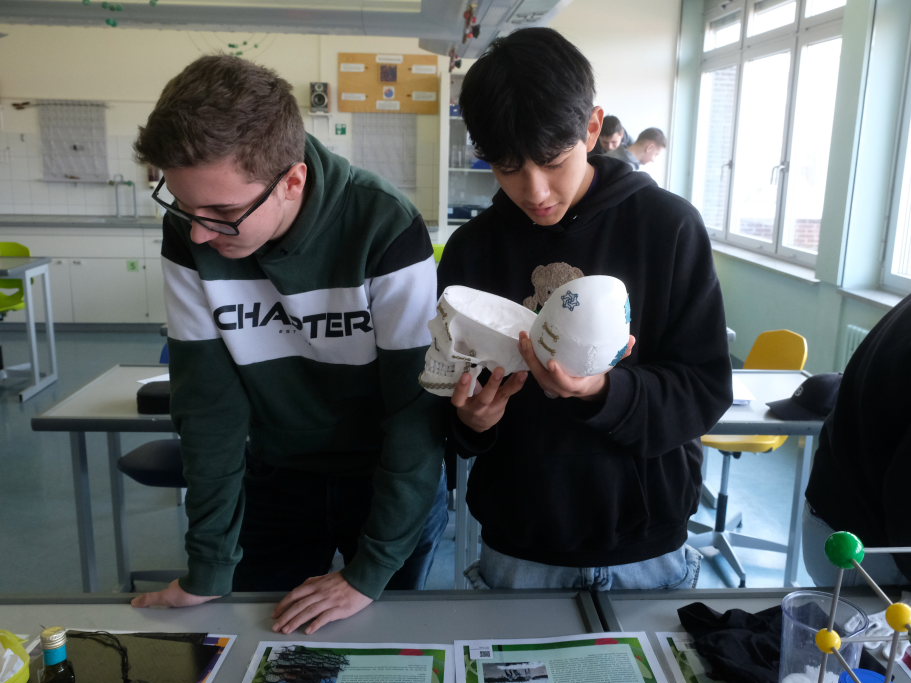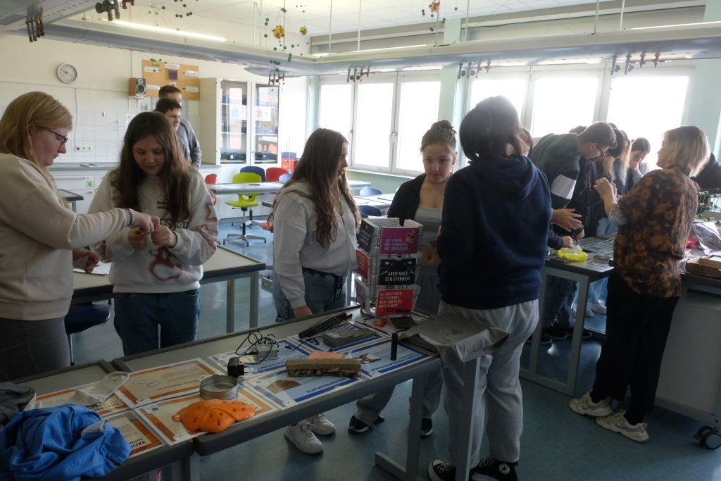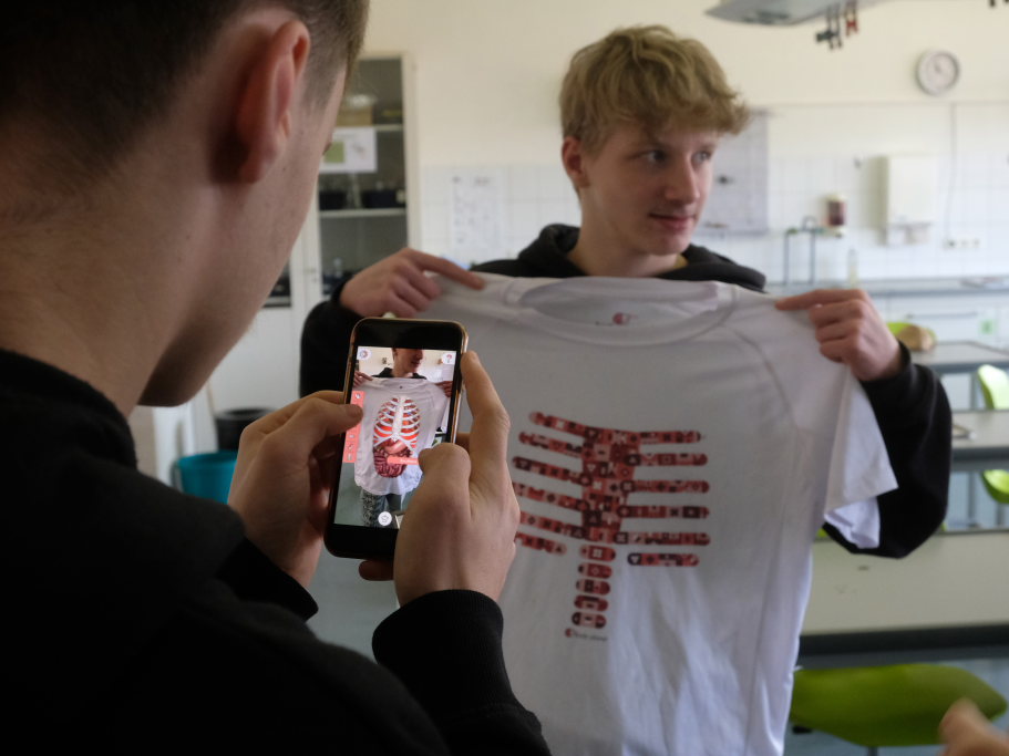 Am Schluss hatten die Schüler noch Gelegenheit, die mitgebrachten Exponaten genauer anzuschauen. Besondere Aufmerksamkeit genoss dabei das spezielle T-Shirt, das per Handy-Röntgenblick Einsichten in die Organwelt des Menschen bot.