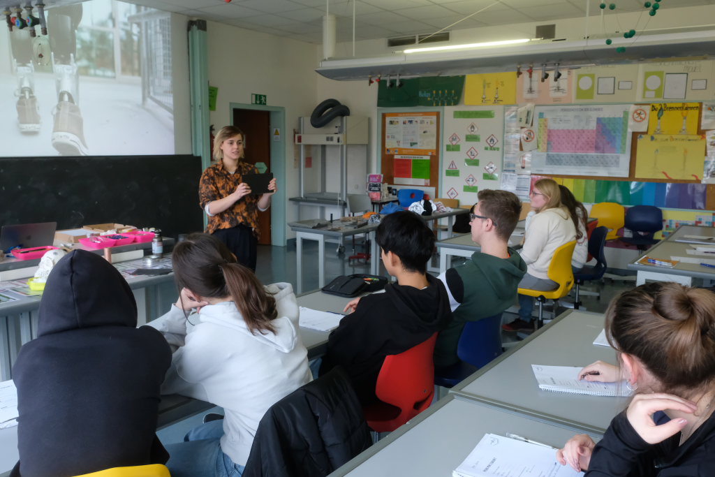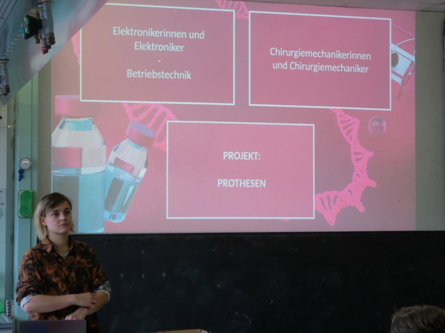 Beim Thema Mensch brachte die Coachin auch eine soziale Komponente ein: Wenn Menschen durch Krankheit oder Unfall eine Gliedmaße verlieren, ist ein ganzes Heer an Berufsbildern damit beschäftigt, durch den Bau einer Prothese diese zu ersetzen. Da wären zum einen die Orthopädietechniker und-mechaniker, die die einzelnen Komponenten zu einem funktionierenden Ganzen zusammenfügen. Zuvor werden die Komponenten aus verschiedenen Materialien wie Carbon, Titan und Aluminium individuell nach Maß angefertigt. In modernen Prothesen steckt – im Gegensatz zum mechanischen „Holzbein“, von dem Godel ein Besipiel mitgebracht hatte – auch viel Elektronik.