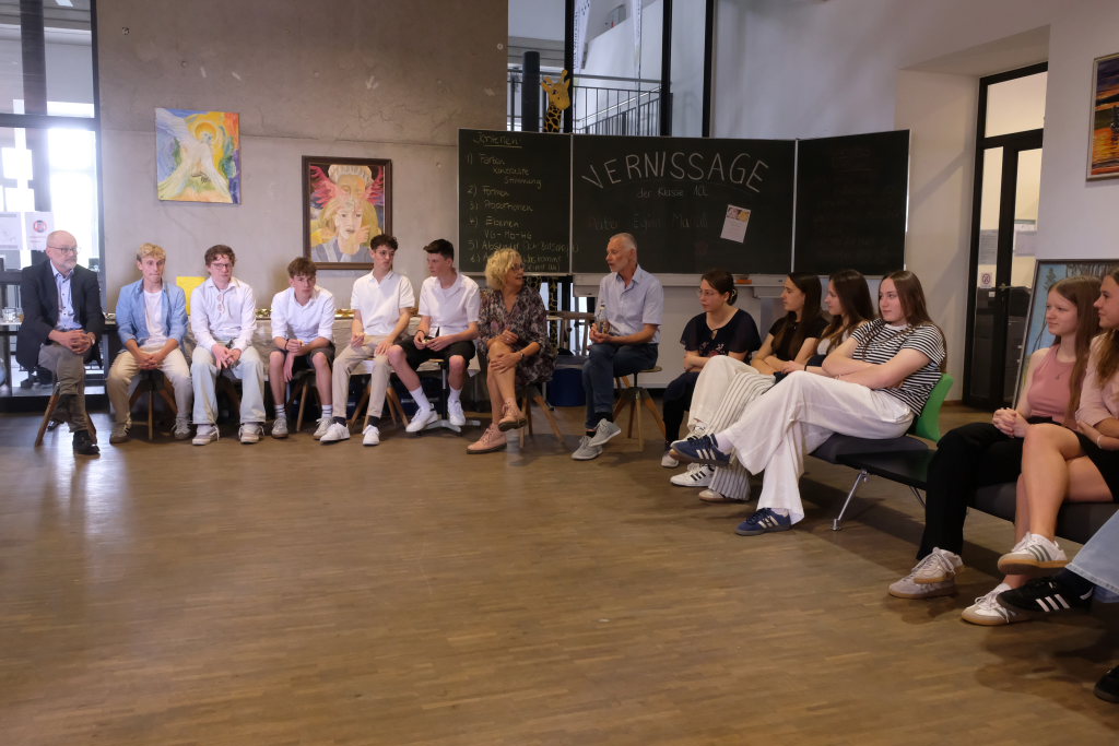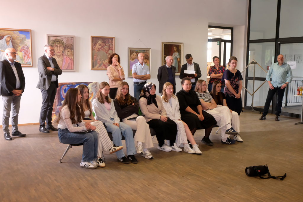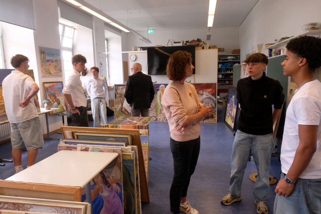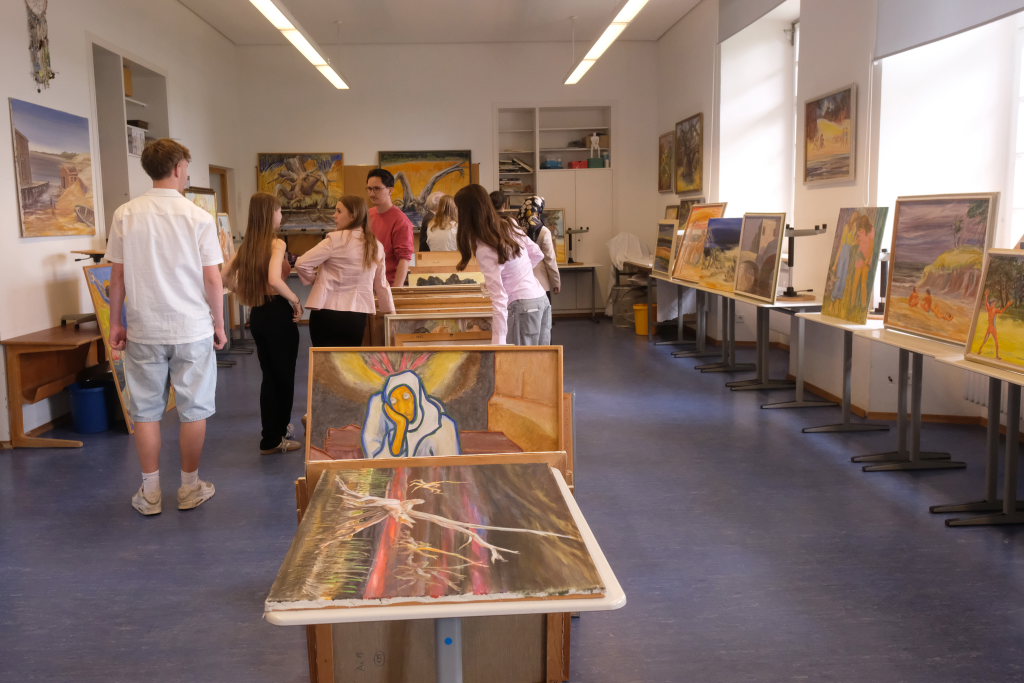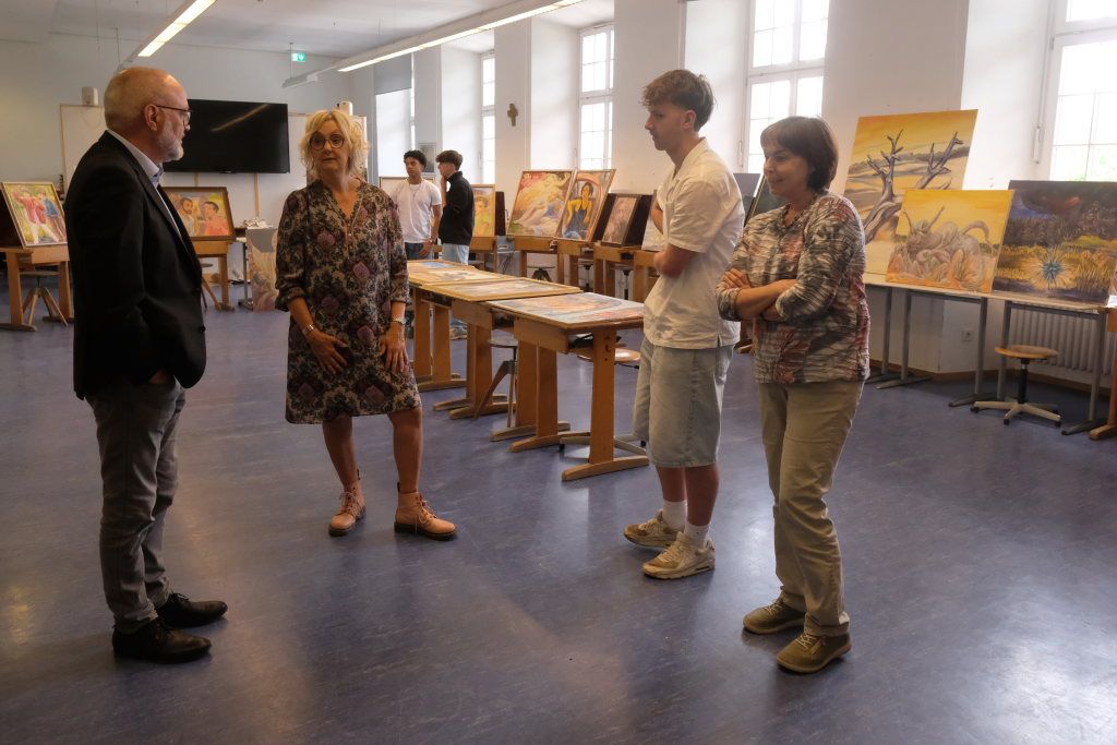 Nachdem einige Schülerinnen und Schüler über ihre sehr positiven Erfahrungen während des Projektes berichtet hatten, ging es in Kleingruppen noch einmal in die einzelnen Räume. Die Auswahl im Foyer der Kunsträume, in denen die Vernissage stattfand, waren die unumstrittenen Werke. Im ersten Kunstsaal waren die Menschen-Bilder von Pater Egino versammelt. Und im dritten Raum waren diejenigen Werke, die laut den Schülern nicht den Prüfkriterien standhielten. Dass ihre Einschätzung auch den salvatorianischen und Schulleiterblicken standhielten, zeigte sich nach dem Rundgang. Die Auswahl erfuhr bei den Gästen große Zustimmung.