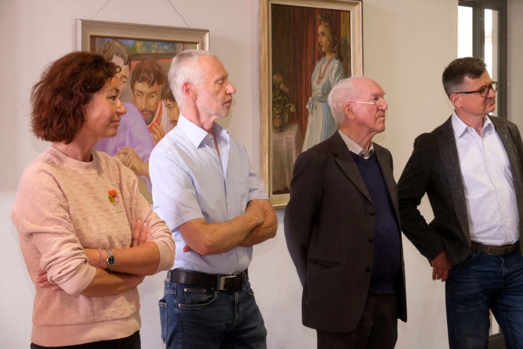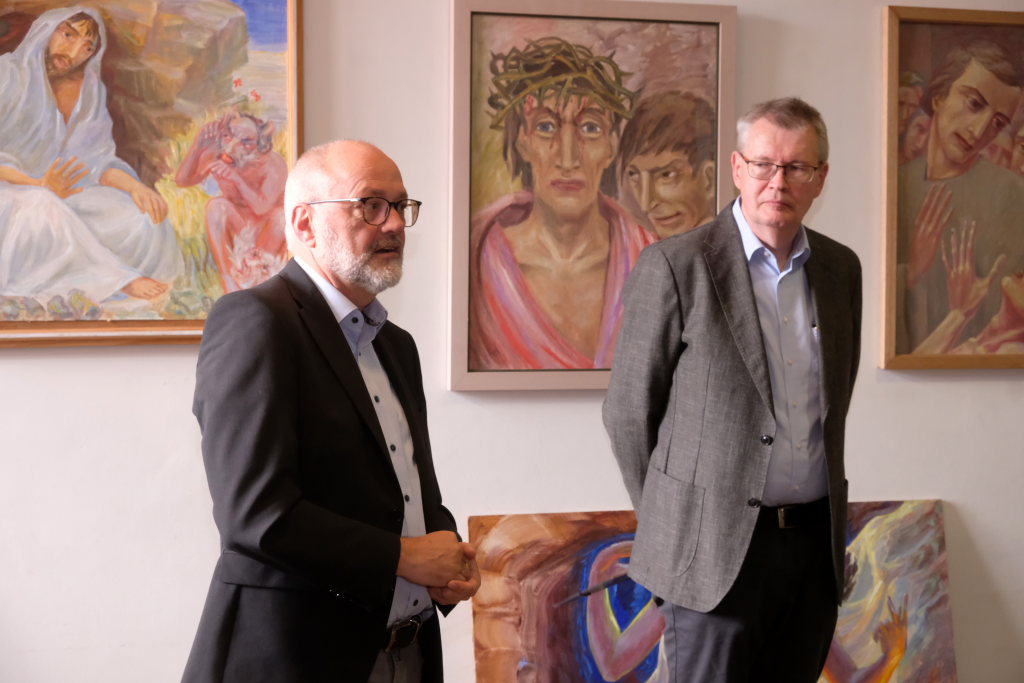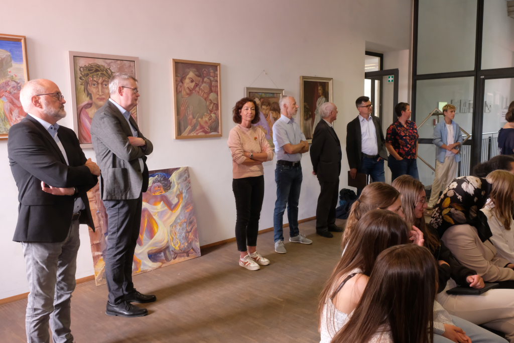An diesem Donnerstagnachmittag (15.05.2025) nun präsentierten die Schüler bei einer Art Vernissage mit Getränken und Häppchen ihre Auswahl in drei verschiedenen Räumen einigen prominenten Gästen. An der Spitze Provinzial Pater Friedrich Emde, seine Vorgänger Pater Leonhard Berchtold, der schon seit Jahren eine erste Ordnung in den Nachlass gebracht hatte, mit Robert Häusle ein ehemaliger und Klaus Amann der aktuelle Schulleiter des Salvatorkollegs sowie mit Pater Mariusz Kowalski, der Schulseelsorger. Ebenfalls mit dabei war die Großnichte des Künstlerpaters Egino, die mit einem Interview-Mitschnitt den Pater selbst zu Wort kommen ließ. Dabei ging es auch darum, sich die Auswahl quasi von den Ordensoberen bestätigen zu lassen. Ute Schubert und diese waren sich darin einig, dass mehr Augen auch mehr sehen.