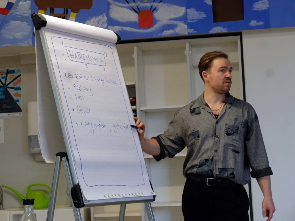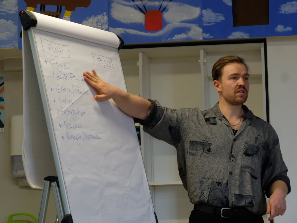 Paul Marx benutzte für die Erklärung der Positionen zwei Begriffe aus dem Fitnessbereich – Push und Pull – um zu verdeutlichen, wie der Prozess der Radikalisierung vonstatten geht. Dabei unterscheidet er drei Ebenen: Die Personen, die Gruppen und die Gesellschaft. Ihm war dabei wichtig, dass die Schüler als Erkenntnisse mitnehmen: zu unterscheiden, was in einer Gruppe Normalität ist, aber was für Gesellschaft und Einzelpersonen gut und richtig ist. Zu unterscheiden, wie der Umgang mit anderen stattfindet und wie über andere geredet wird.