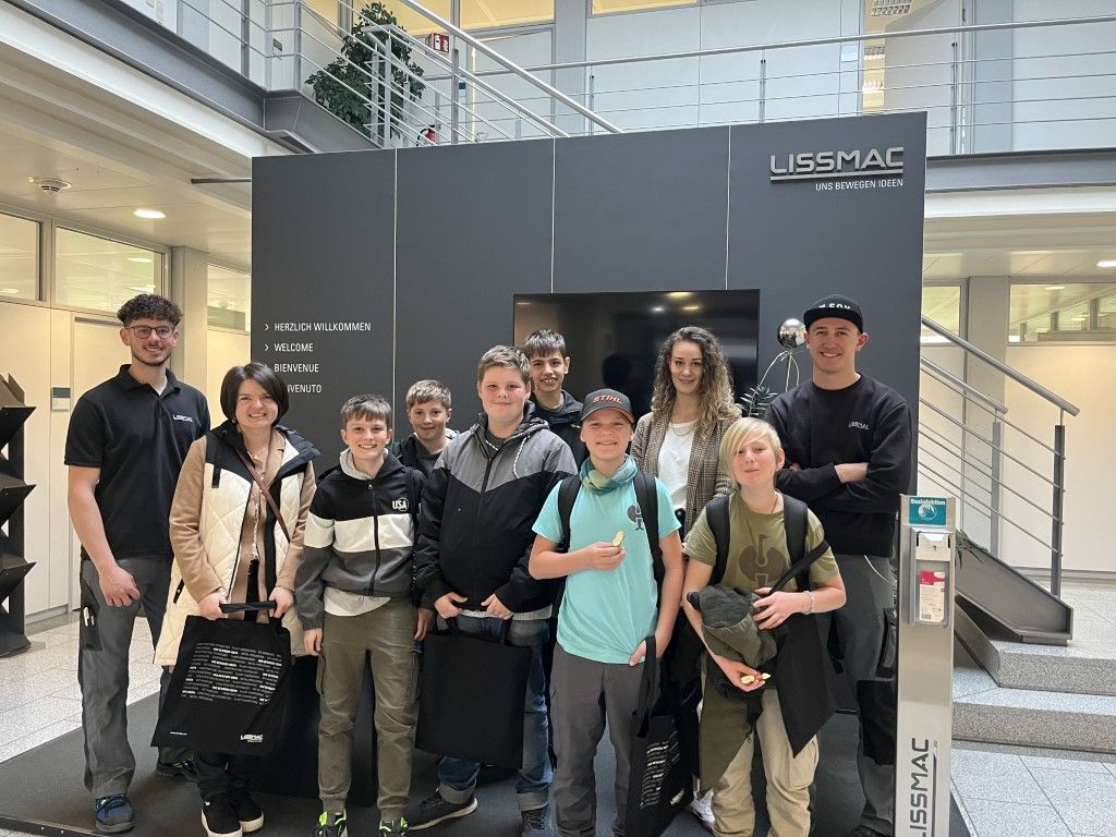 Bei der Firma Lissmac Maschinenbau GmbH wurden unsere Schüler/innen (Bild nachstehend) von Ausbildungsleiter Herrn Gindele und Auszubildenden durch die Betriebsstätten geführt. Dort erfuhren die Jugendlichen die Basics für die Ausbildungsberufe Industriemechaniker, Zerspanungsmechaniker und Elektroniker. Als praktisches Werkstück durften die Schüler ein Metallfahrzeug zusammenfalten, welches aus einer einzigen Metallplatte herausgefräst war und als Stiftehalter dient.