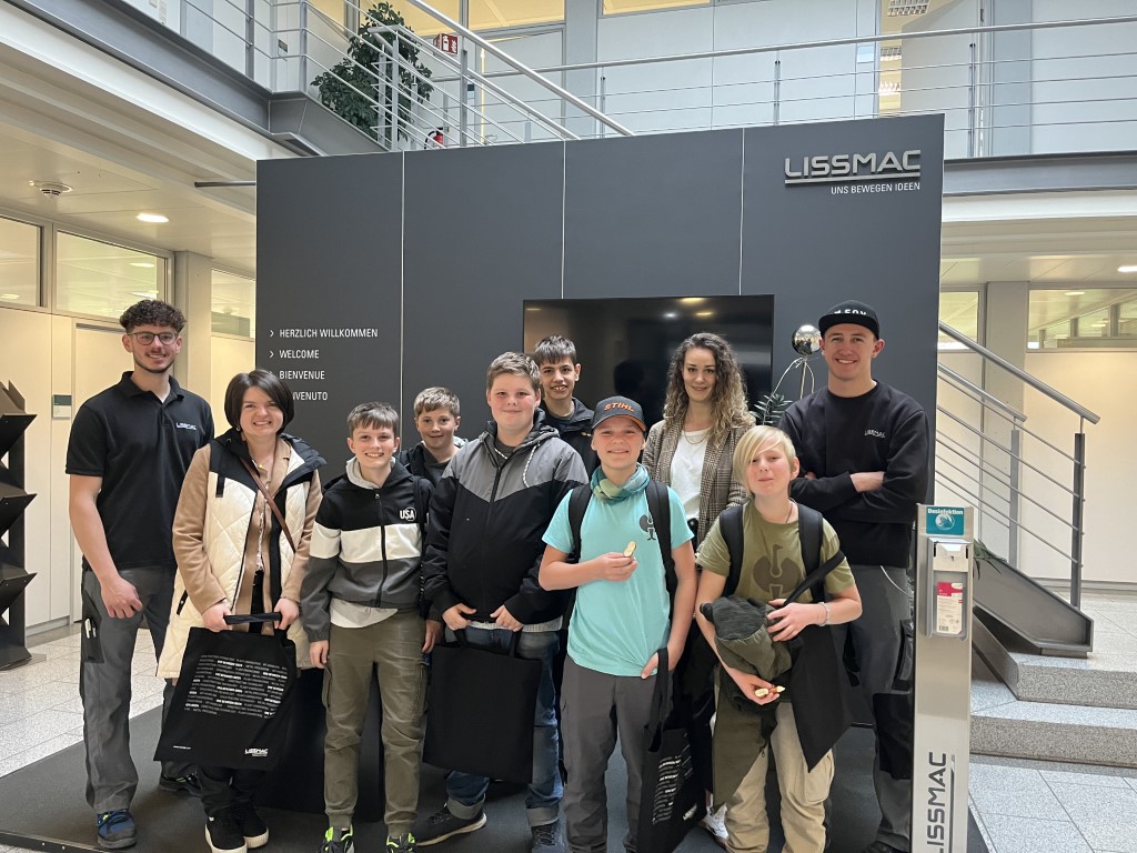 Bei der Firma Lissmac Maschinenbau GmbH wurden unsere Schüler/innen (Bild nachstehend) von Ausbildungsleiter Herrn Gindele und Auszubildenden durch die Betriebsstätten geführt. Dort erfuhren die Jugendlichen die Basics für die Ausbildungsberufe Industriemechaniker, Zerspanungsmechaniker und Elektroniker. Als praktisches Werkstück durften die Schüler ein Metallfahrzeug zusammenfalten, welches aus einer einzigen Metallplatte herausgefräst war und als Stiftehalter dient.