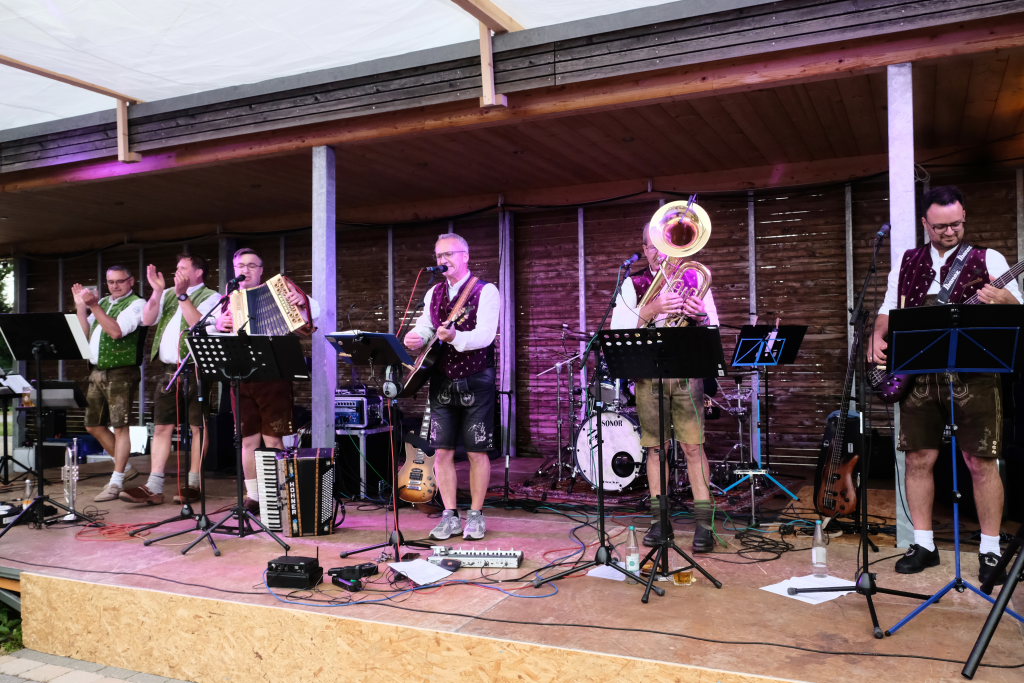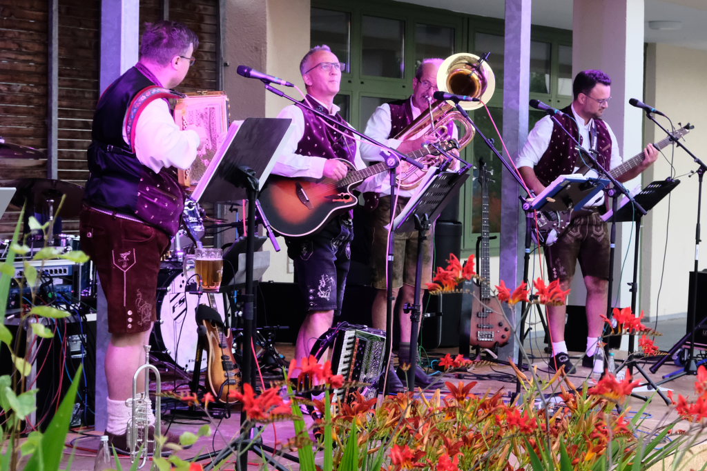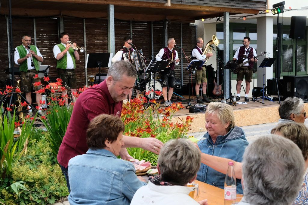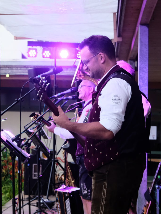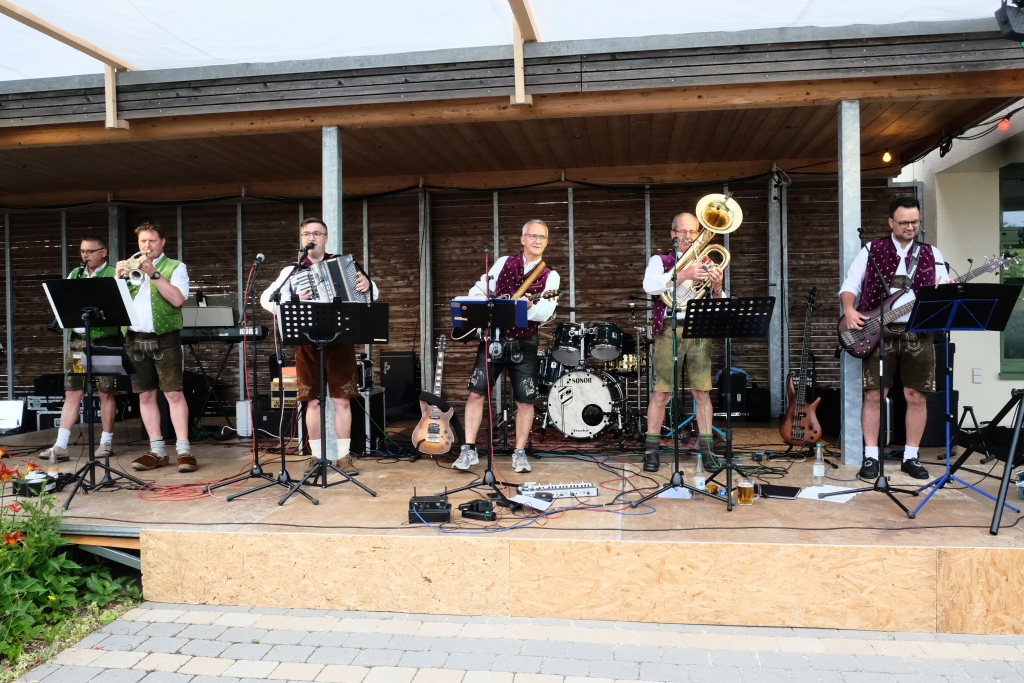 Am Samstagabend spielte das Sextett Allgäu-Sound zum Dämmerschoppen auf dem Festgelände bei Schule und Festhalle neben fetziger Oberkrainermusik auch Schlager und Rockmusik aus vielen Jahrzehnten. Dazu servierten die Musiker des Musikvereines den Besuchern zu den diversen Kaltgetränken Vesperbrettla und Wurstsalat. In der Weinlaube gab es gute Weine, aber auch sommerlich-erfrischende Mixgetränke. Und weil auch das Wetter einigermaßen mitspielte, wurde es ein gemütlicher Sommerabend für die ganze Familie mit vielen netten Gesprächen.