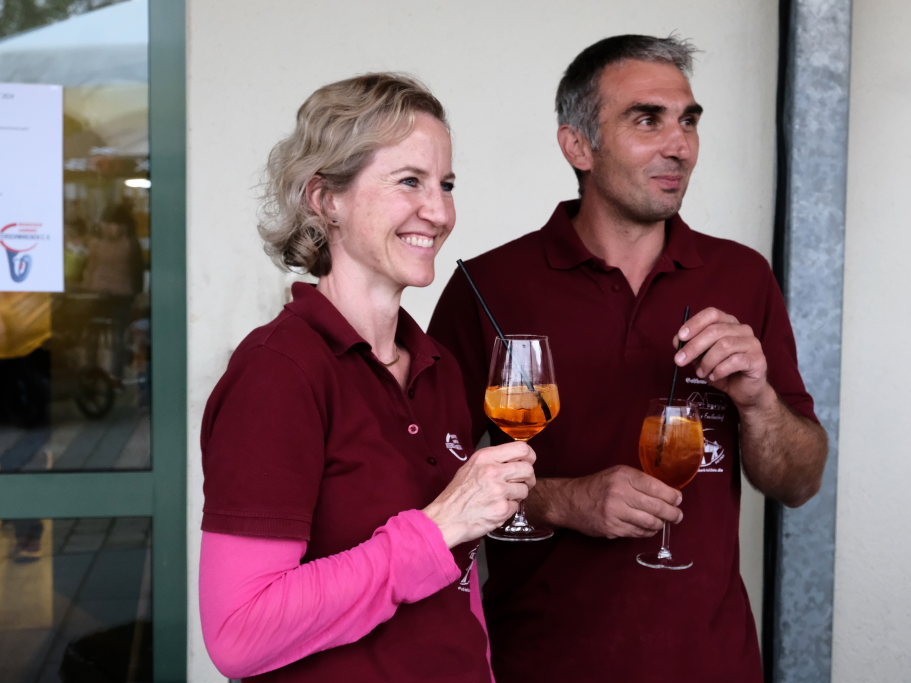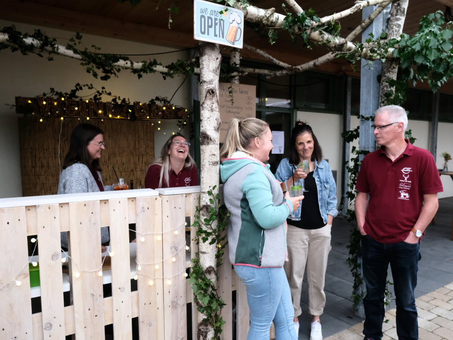 Doch Küche und Service waren ja nicht die einzigen Hotspots: Da waren zum einen die freundlichen Bedienungen, die Essen und Trinken an den Platz brachten. Dann musste auch der Getränkestand personell immer gut besetzt sein. Und die Weinlaube hatte sich über Nacht in eine Kaffee- und Kuchentheke verwandelt. Und zusätzlich gab es daneben noch eine Eisbar, wo flinke Hände neben Eisbechern auch noch einen wunderbaren Eiskaffee schufen. Und damit die Erwachsenen sich all diesen lukullischen Köstlichkeiten in Ruhe widmen konnten, gab es für die Kleinen ein umfangreiches Programm an Spielen oder sie konnten sich auf dem Spielplatz an den verschiedenen Geräten austoben.