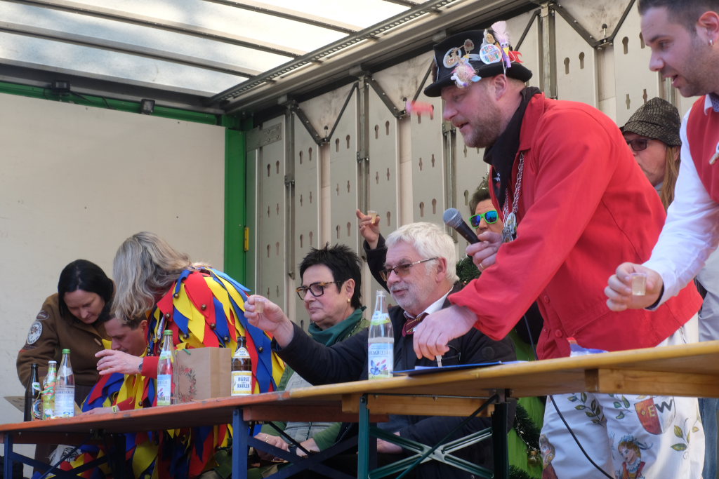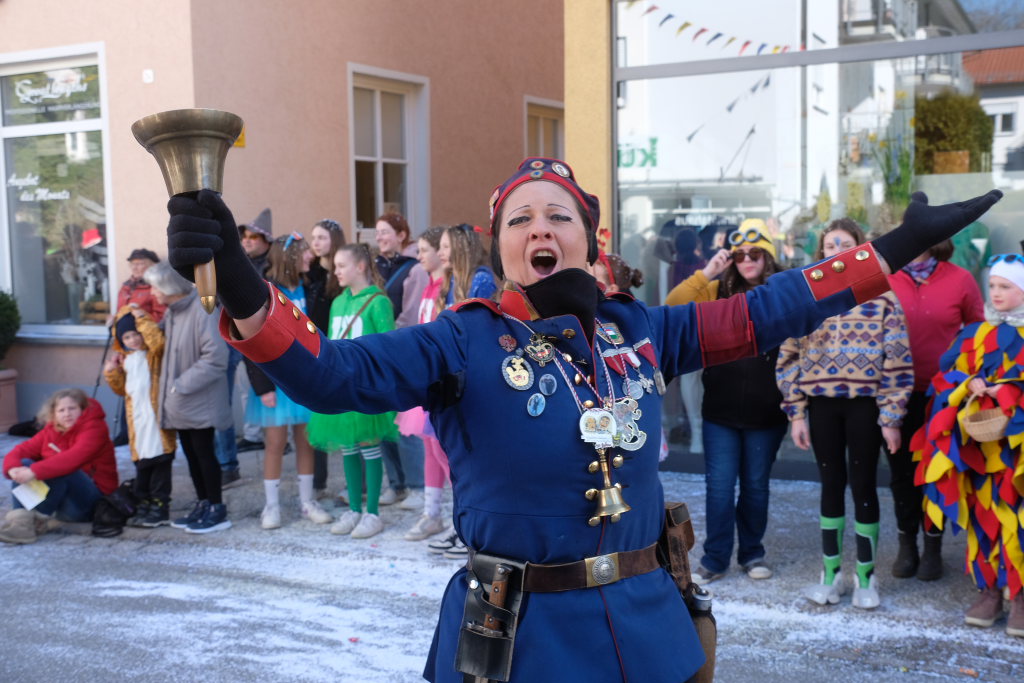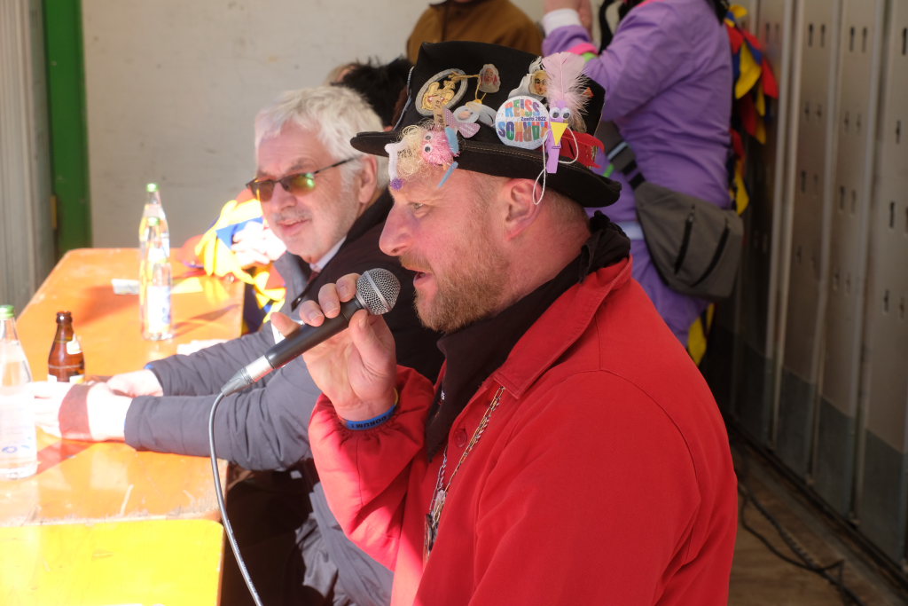 Die 83 Gruppen – davon zwölf Musikgruppen – wurden an den drei Ansager-Positionen in der Marktstraße, beim Rathaus und in der Herrenstraße von fachkundigen Zunftmeistern wie Daniel Wassner von den Haidgauern Chadaloh oder Willi „Willi-Bu““ Butscher von der Seibranzern Langjuppen, vorgestellt. Das Revier von Willi-Bu und seinem Kollegen von den Bellamonter Budelhond war die Schlossstraße, wo sich auf einem LKW die Ehrengasttribüne befand, auf der sich neben den Zunftoberen die politische Prominenz wie Bürgermeisterin und Gemeinderäte tummelten. Die beiden Zunftmeister betätigten sich als männliche Sonja Schreckleins und waren dabei immer mitten im Geschehen.