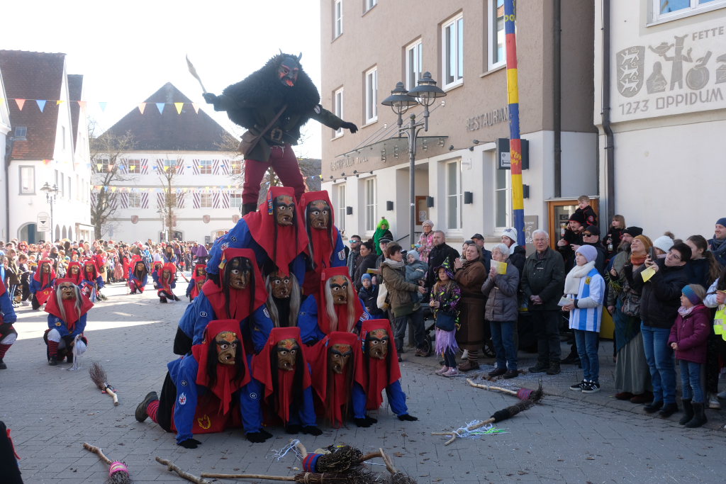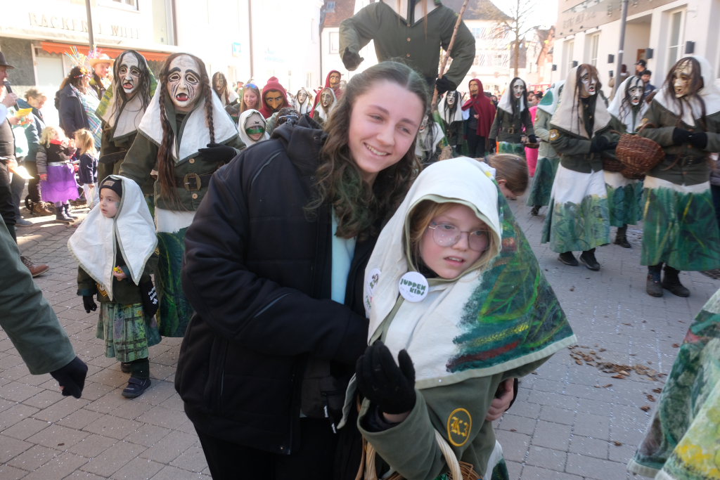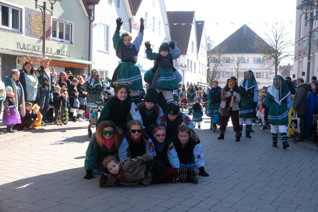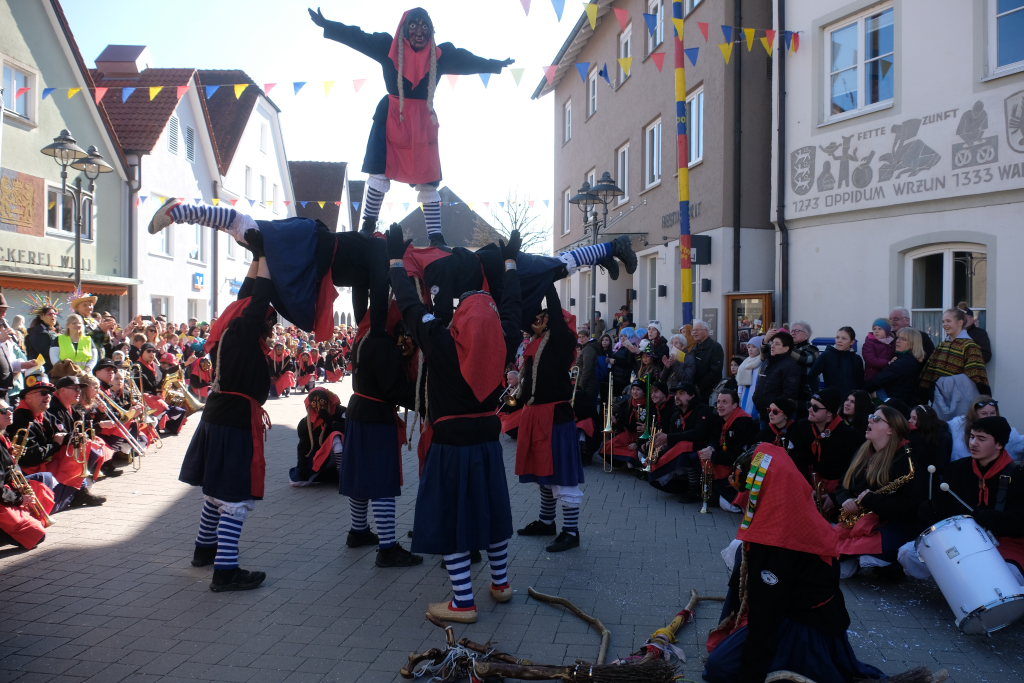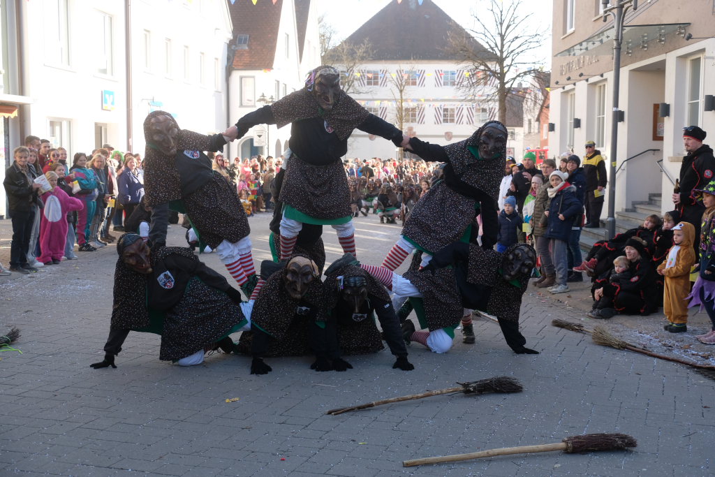 Vor allem die Hexengruppen zeigten ihre akrobatischen Fähigkeiten: Hexen-Pyramiden und -Karusselle gab es zuhauf, einige Gruppen waren da sehr kreativ. Und was die Großen können, das können die Kleinen schon lange: Auch der Narrensamen der verschiedenen Zünfte war immer dabei, wenn die zuständigen Narrenmeister das Zeichen dafür gaben.
