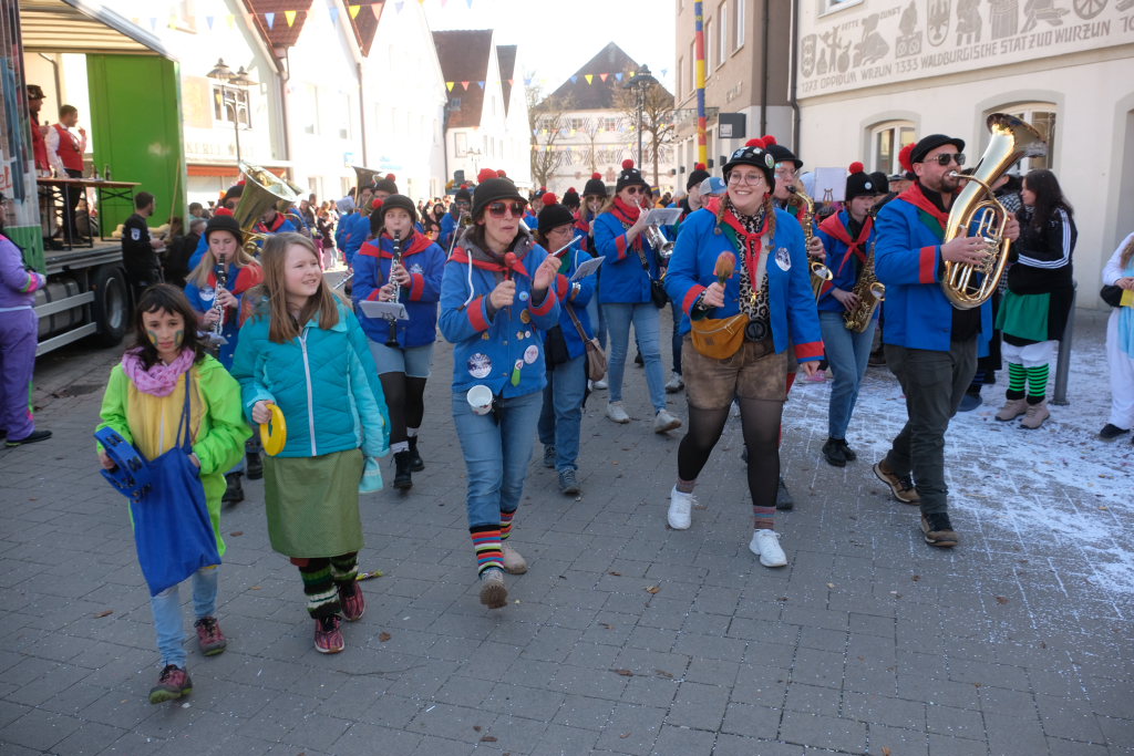 Traditionell eröffnete die Stadtkapelle in ihrem in den Stadtfarben blau, rot und gelb gehaltenen Häs den diesjährigen Narrensprung in Bad Wurzach beim Aufstellungsplatz vor dem Hotel „Rössle“, der kurz vor dem Umzugsstart von Hästrägern nur so wimmelte.