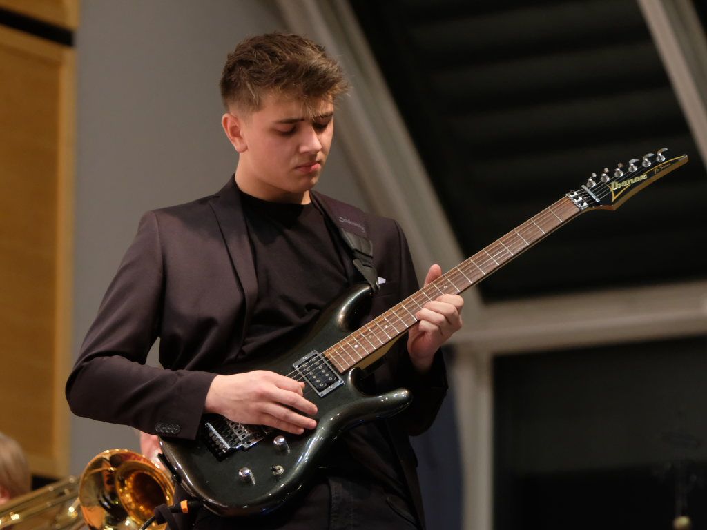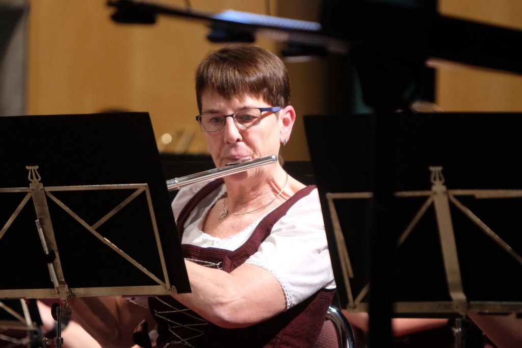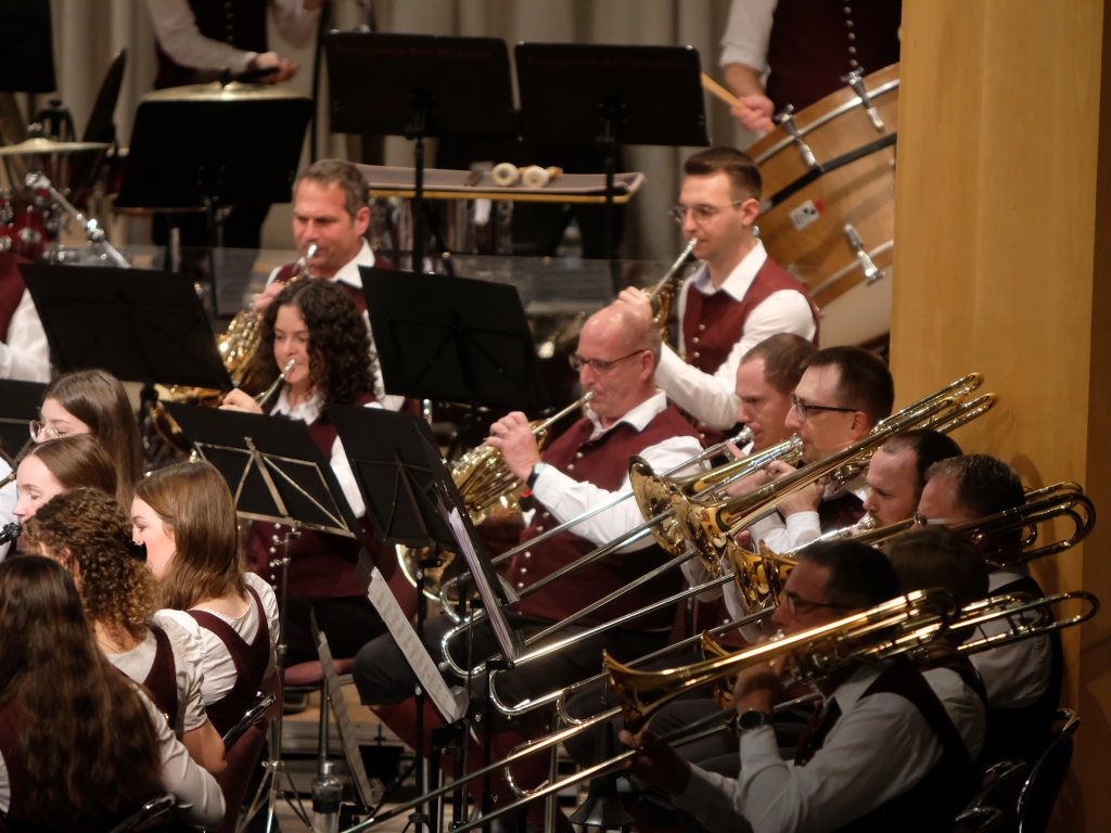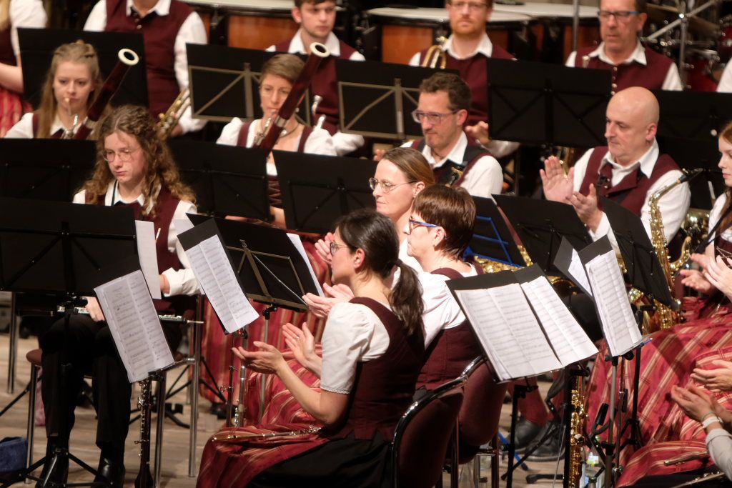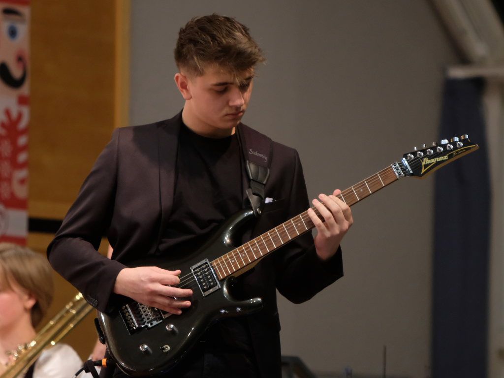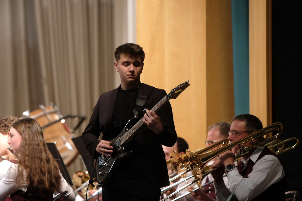 Dann wurde es laut, für manchen Zuhörer – an zartere Tonnuancen gewohnt – vielleicht sogar zu laut. „Shred Meister“, von dem amerikanischen, ehemaligen Militärmusiker James L. Hosey, zeigte die Experimentierfreude von Petra Springer und der Stadtkapelle. E-Piano, E-Bass kamen als Begleitinstrumente ja hin und wieder bei Konzerten zum Einsatz. Aber eine E-Gitarre, da rümpfen viele Blasmusikpuristen meist erstmal die Nase. Aber der erst 17-jährige Lukas Rast mit seinem meist improvisierten E-Gitarrensolo zeigte, dass Shred-Gitarre gemeinsam mit den vom Orchester spielfreudig vorangetriebenen Rockrhythmen eine fetzige Genre-Mixtur ergeben kann.