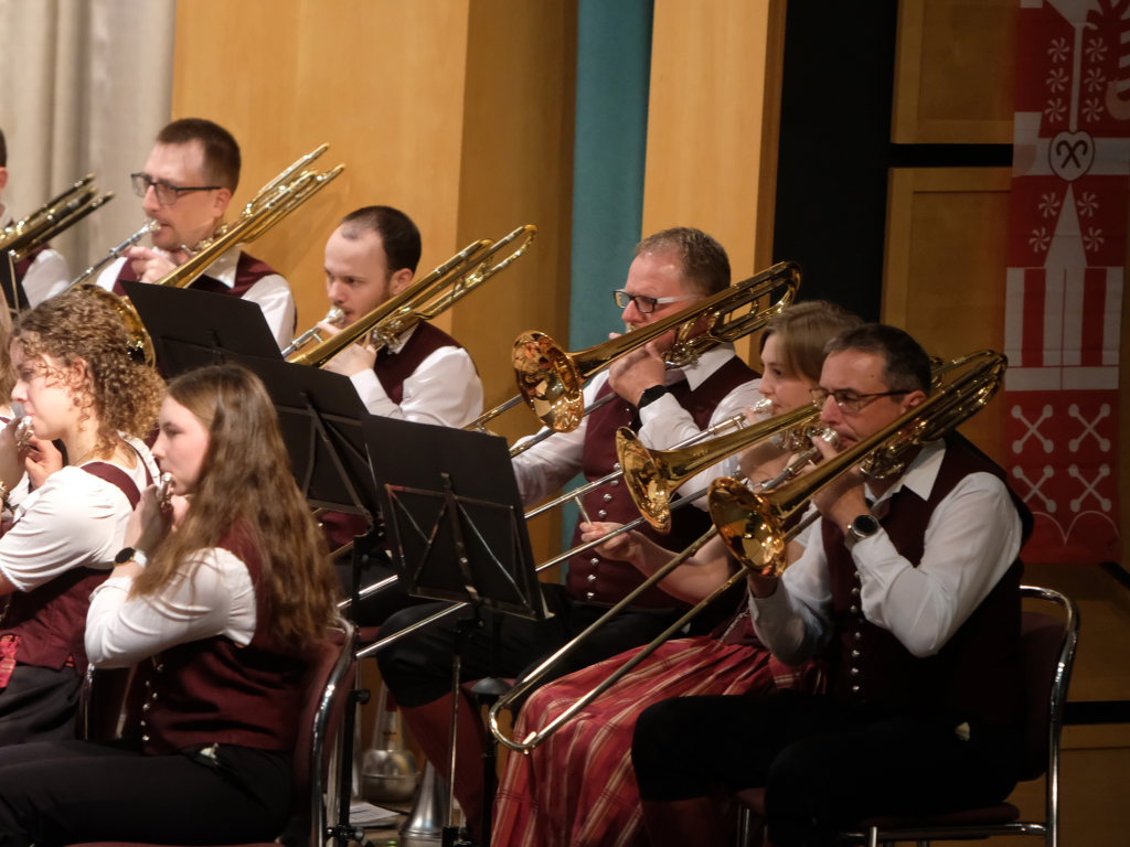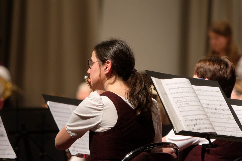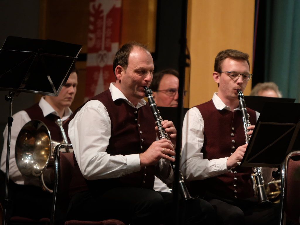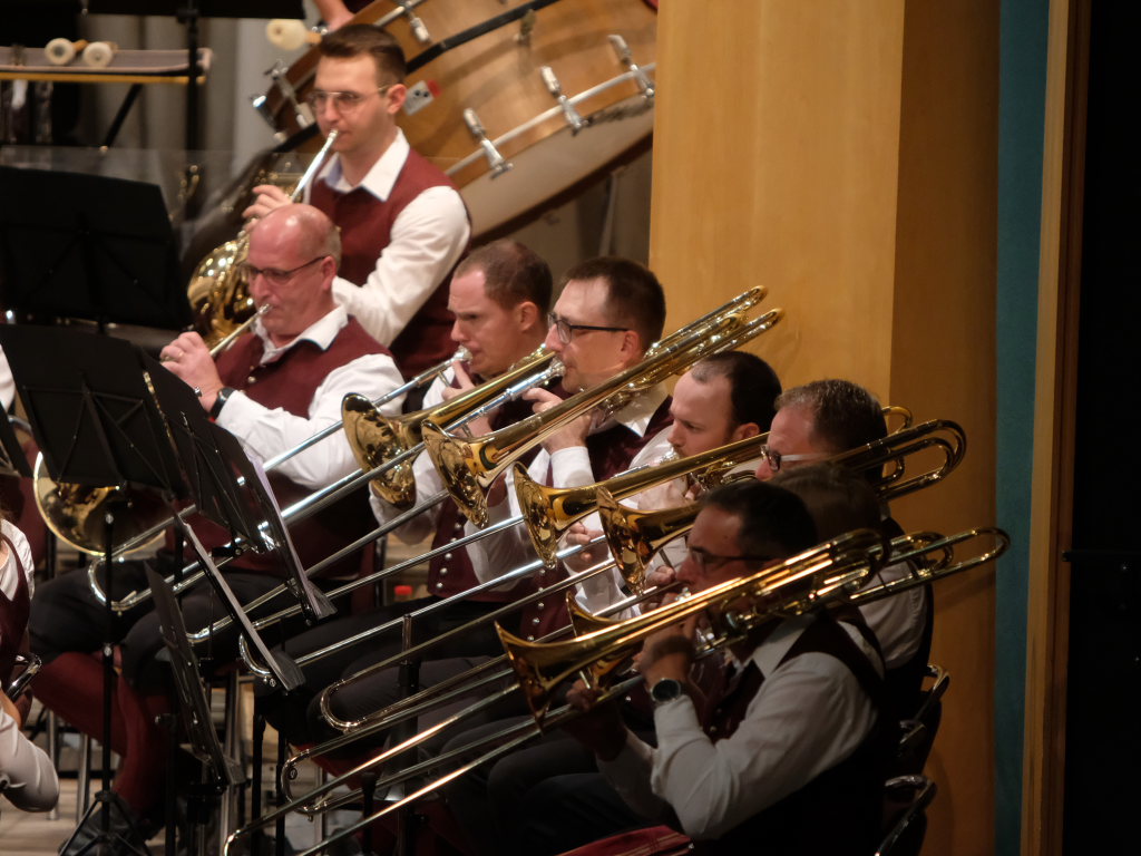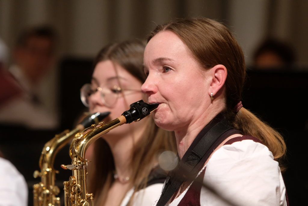 Dann wurde es laut, für manchen Zuhörer – an zartere Tonnuancen gewohnt – vielleicht sogar zu laut. „Shred Meister“, von dem amerikanischen, ehemaligen Militärmusiker James L. Hosey, zeigte die Experimentierfreude von Petra Springer und der Stadtkapelle. E-Piano, E-Bass kamen als Begleitinstrumente ja hin und wieder bei Konzerten zum Einsatz. Aber eine E-Gitarre, da rümpfen viele Blasmusikpuristen meist erstmal die Nase. Aber der erst 17-jährige Lukas Rast mit seinem meist improvisierten E-Gitarrensolo zeigte, dass Shred-Gitarre gemeinsam mit den vom Orchester spielfreudig vorangetriebenen Rockrhythmen eine fetzige Genre-Mixtur ergeben kann.