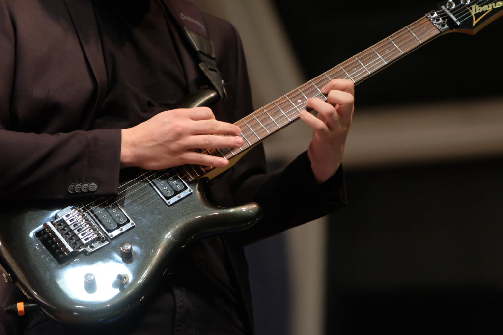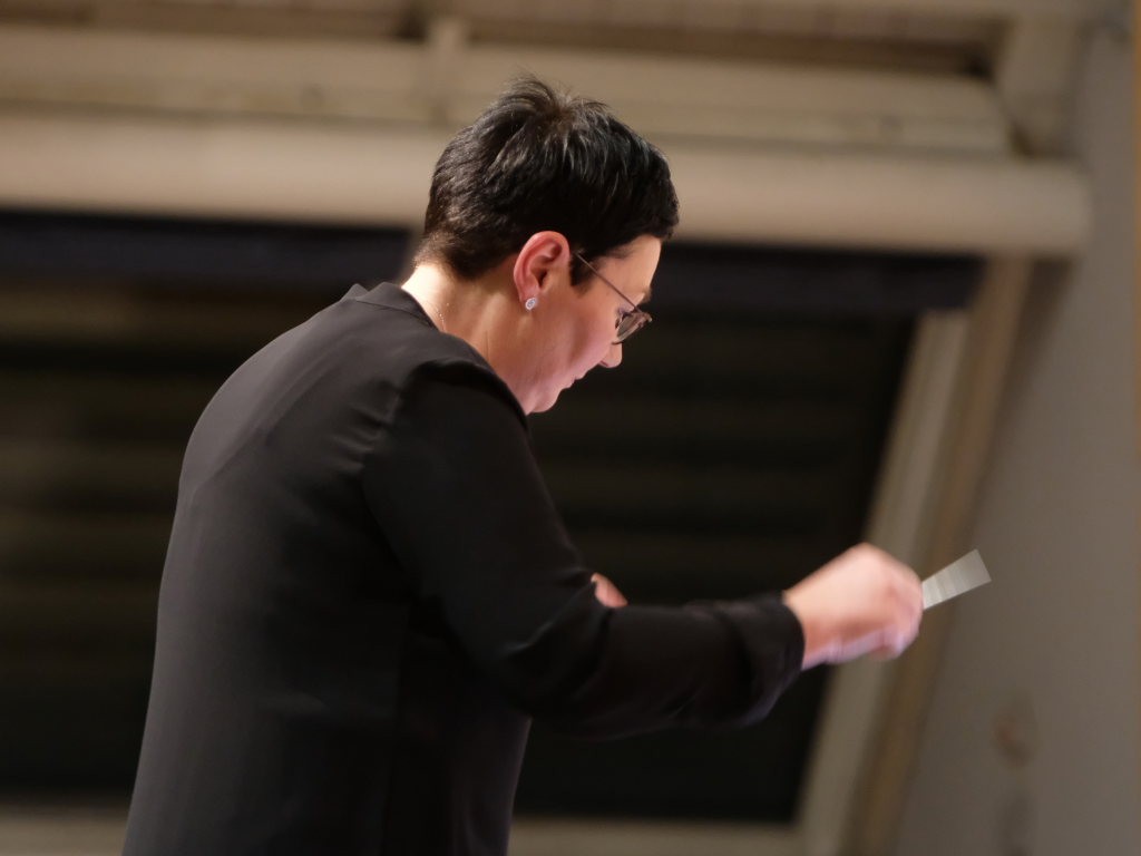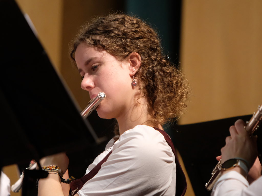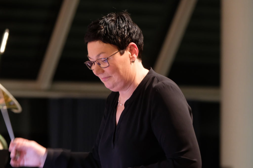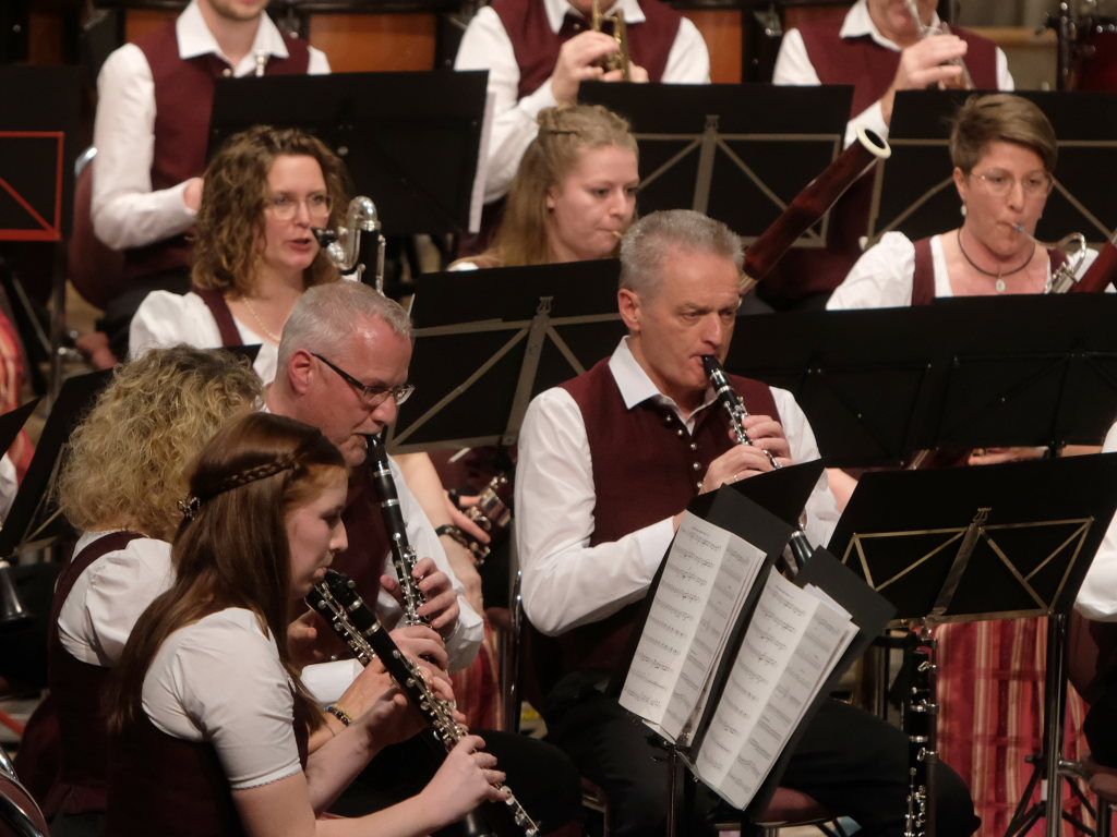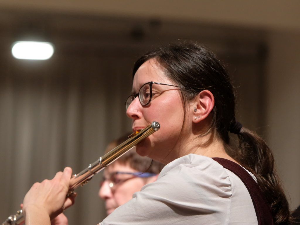 Dann wurde es laut, für manchen Zuhörer – an zartere Tonnuancen gewohnt – vielleicht sogar zu laut. „Shred Meister“, von dem amerikanischen, ehemaligen Militärmusiker James L. Hosey, zeigte die Experimentierfreude von Petra Springer und der Stadtkapelle. E-Piano, E-Bass kamen als Begleitinstrumente ja hin und wieder bei Konzerten zum Einsatz. Aber eine E-Gitarre, da rümpfen viele Blasmusikpuristen meist erstmal die Nase. Aber der erst 17-jährige Lukas Rast mit seinem meist improvisierten E-Gitarrensolo zeigte, dass Shred-Gitarre gemeinsam mit den vom Orchester spielfreudig vorangetriebenen Rockrhythmen eine fetzige Genre-Mixtur ergeben kann.