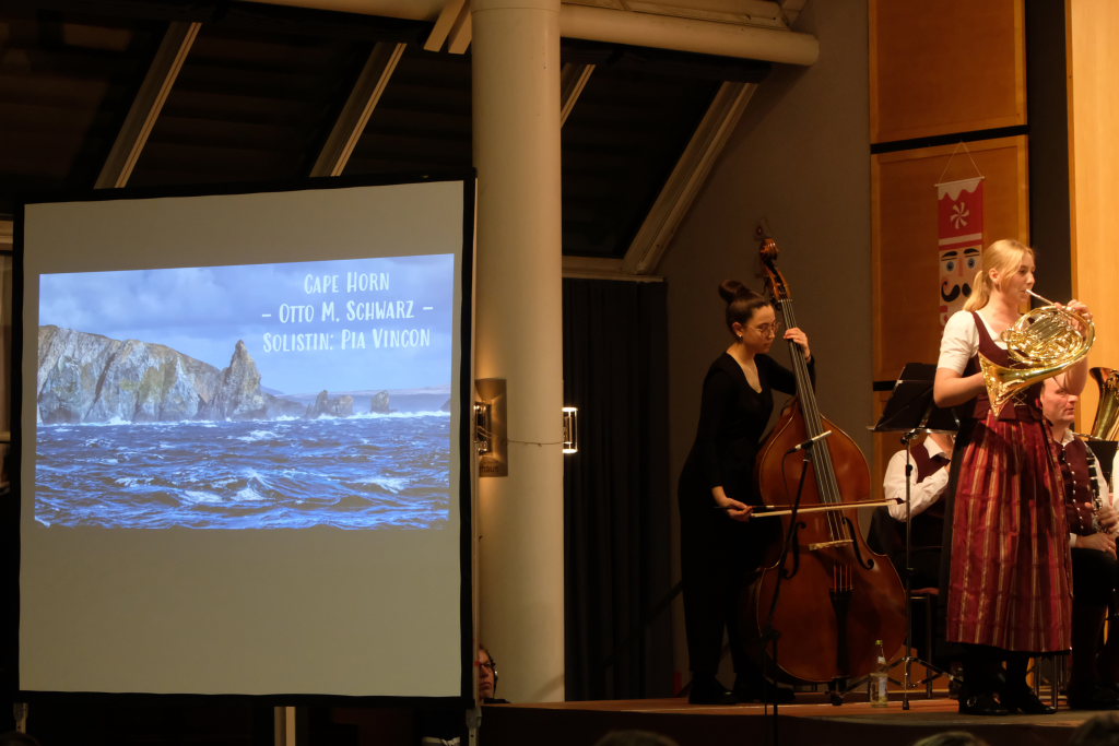 Bei „Cape Horn“ des österreichischen Komponisten Otto M. Schwarz zeichnet der Komponist ein Bild der Schönheit, aber auch der Gefährlichkeit dieses Felsens an der südlichsten Landspitze Südamerikas. Die 24-jährige Pia Vincon hatte an diesem Abend den Mut, als Solistin auf einem der am schwierigsten zu beherrschenden Blasinstrumente für das Publikum den Kapitän bei dieser musikalischen Umrundung des Cape Horn zu geben. Fast nicht enden wollender Beifall war der Lohn für sie für diese – auch musikalisch – nicht „ungefährliche“ Mission.