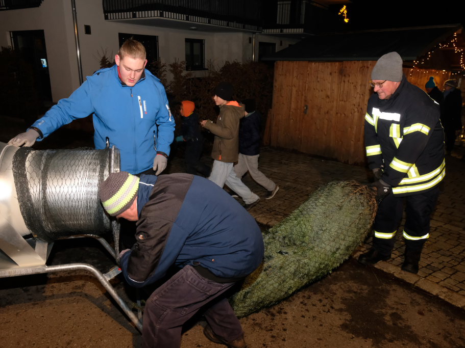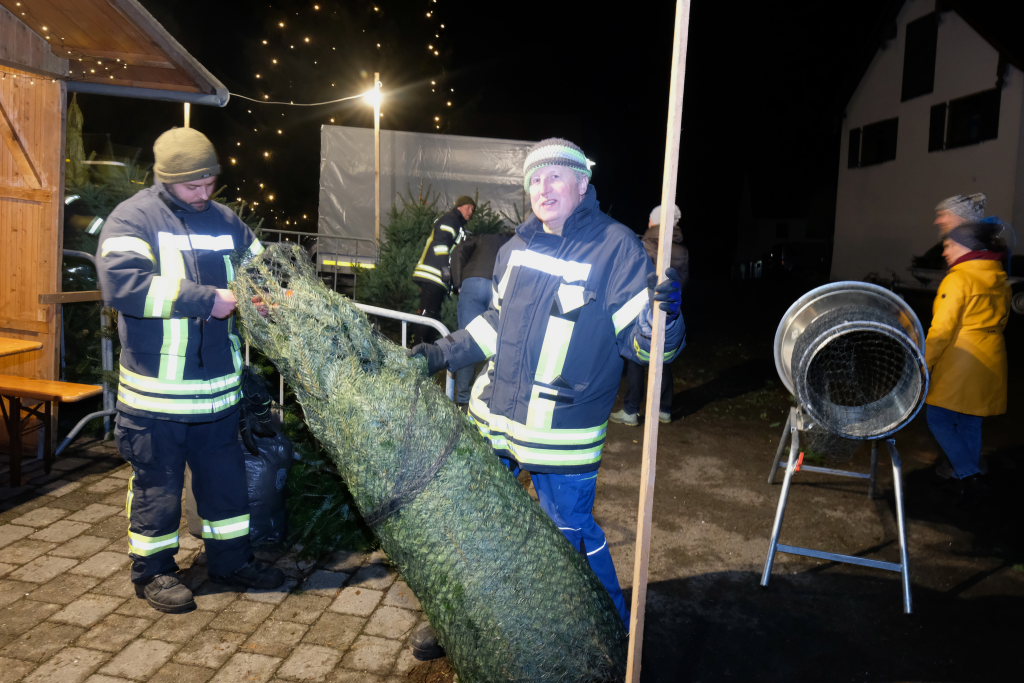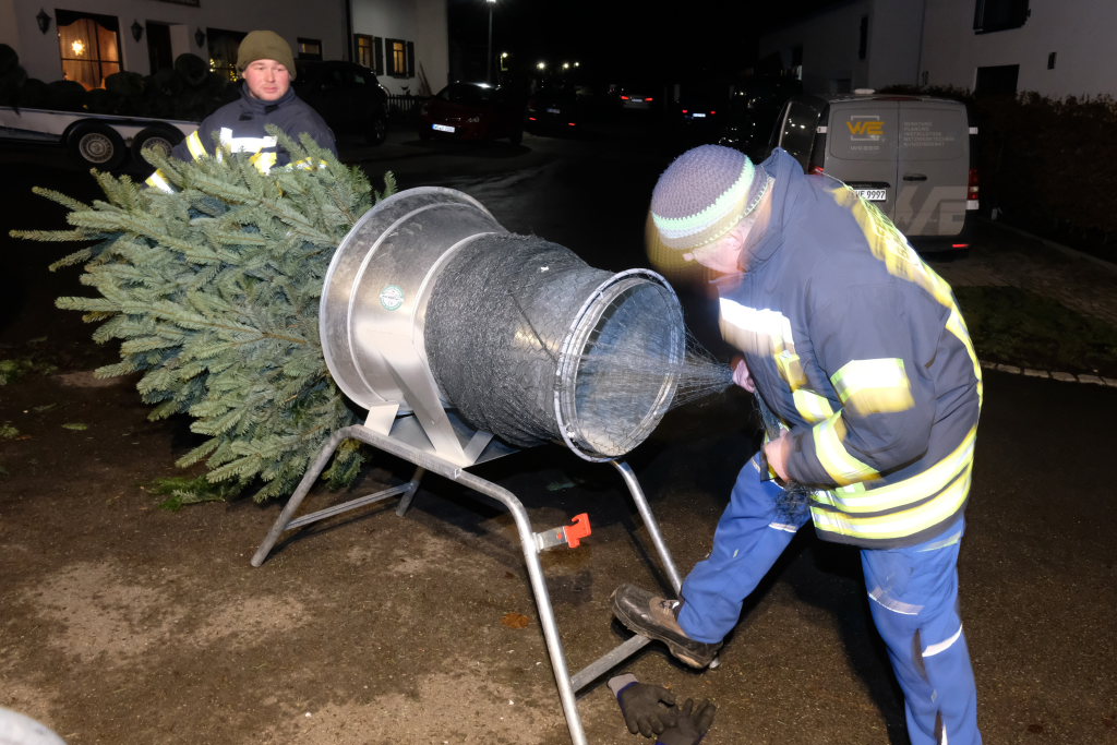 Eine Besonderheit des Arnacher Weihnachtsmarktes ist auch immer der Christbaumverkauf. Diesen übernahmen auch in diesem Jahr, weil die Arnacher Wehrleute mit der Organisation, Getränke und Essensverkauf gut beschäftigt waren, die Feuerwehrkollegen aus Eintürnen, die fleißig an den Bäumen Maß nahmen und sie mit der speziellen Netzmaschine einpackten, so dass die Bäume für die Käufer handlich zu transportieren waren. Das Geschäft lief sehr gut, hatten sie bereits nach drei Stunden Zweidrittel ihres Bestandes an die Frau und den Mann gebracht.