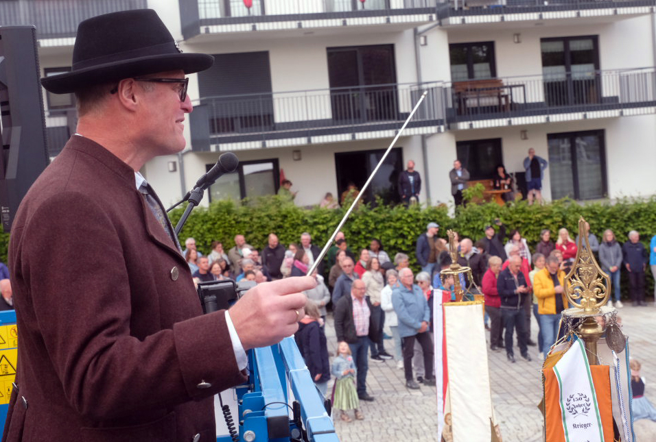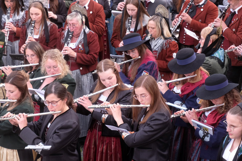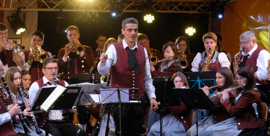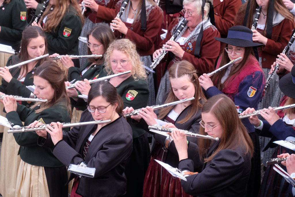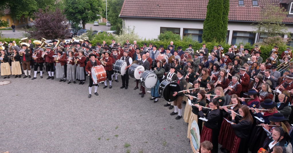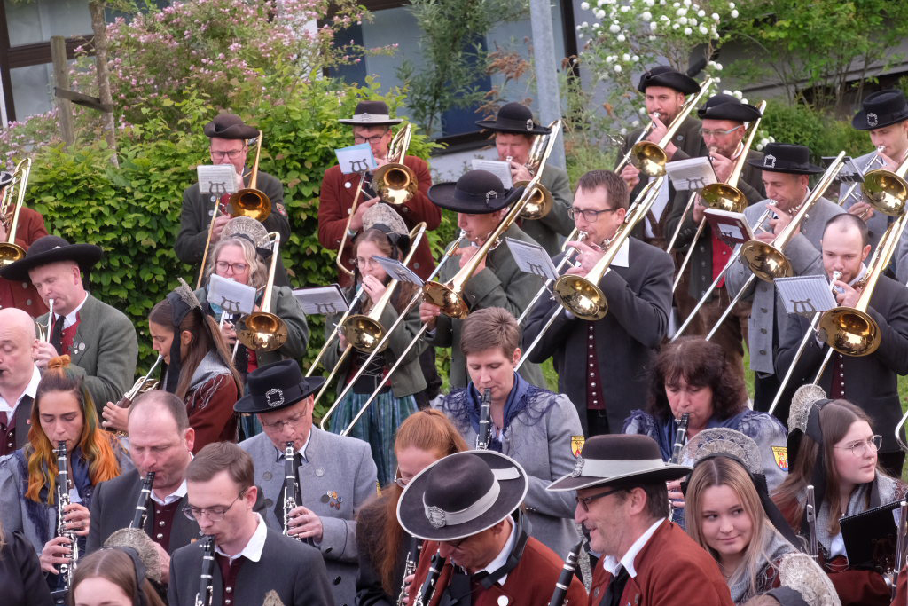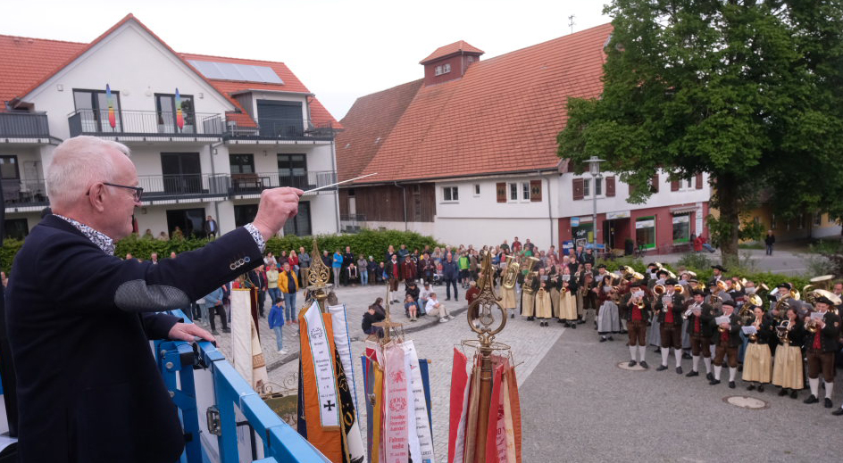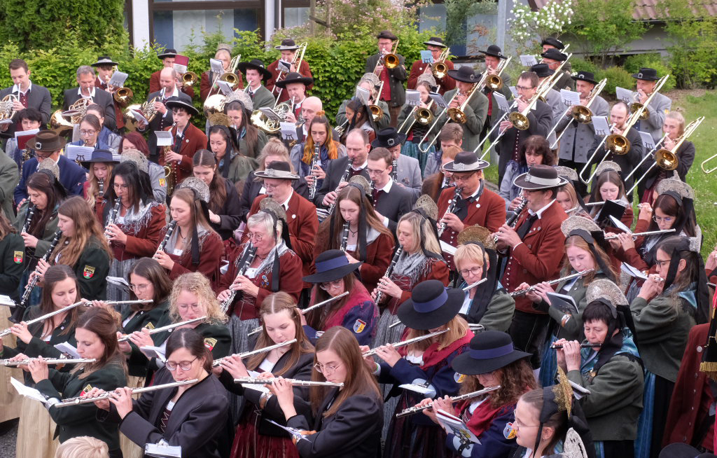Vorstandsmitglied Stefanie Jöchle, die Begrüßung und Vorstellung der einzelnen Kapellen von der Ehrentribüne aus, einer am Dorfplatz aufgestellten Hebebühne, übernommen hatte, freute sich, dass so viele Gäste den Dorfplatz am Fuße der Pfarrkirche säumten. Der Dirigent des Geburtstagskindes, Berthold Hiemer, hatte die Ehre, das erste Stück des Gesamtchores, die Polka „Böhmische Liebe“ zu dirigieren.