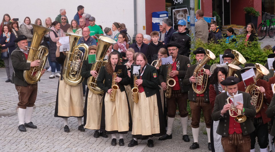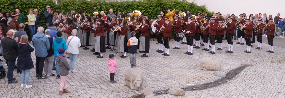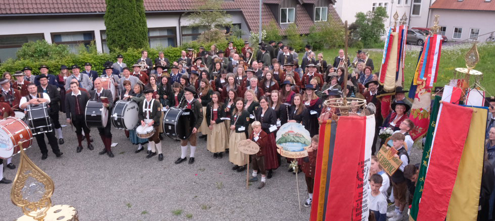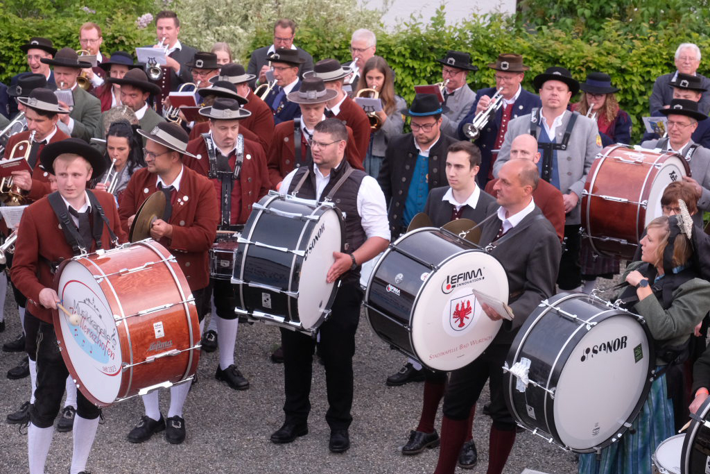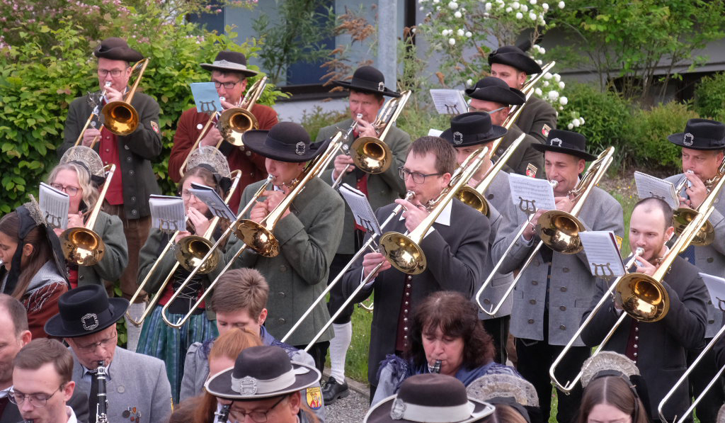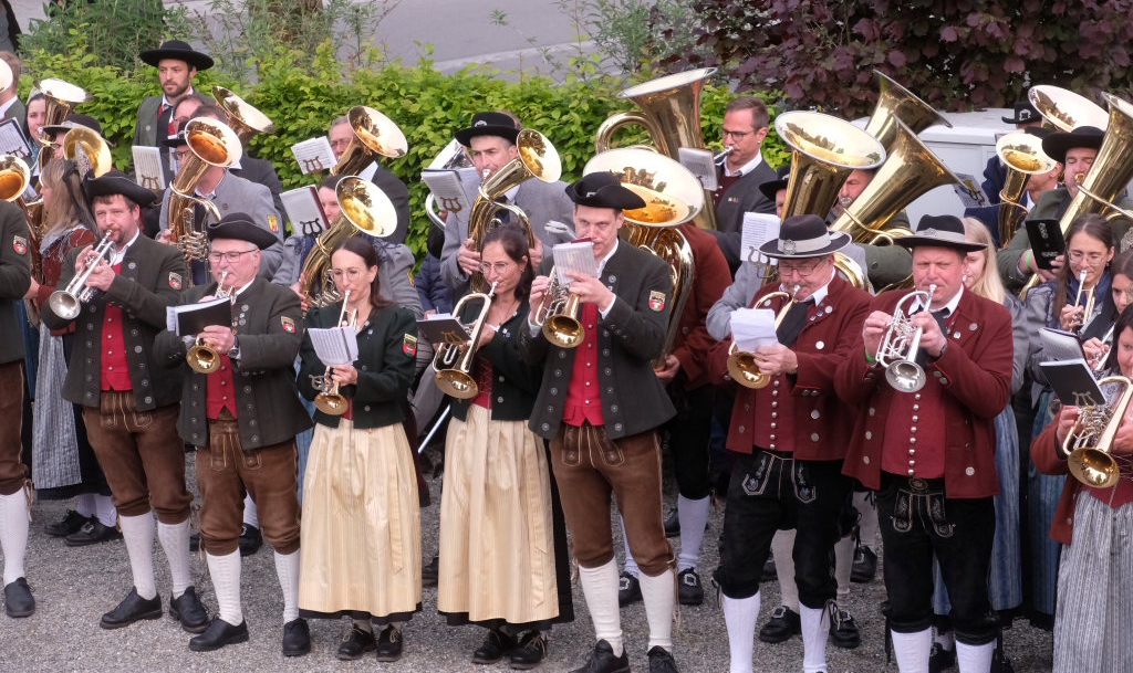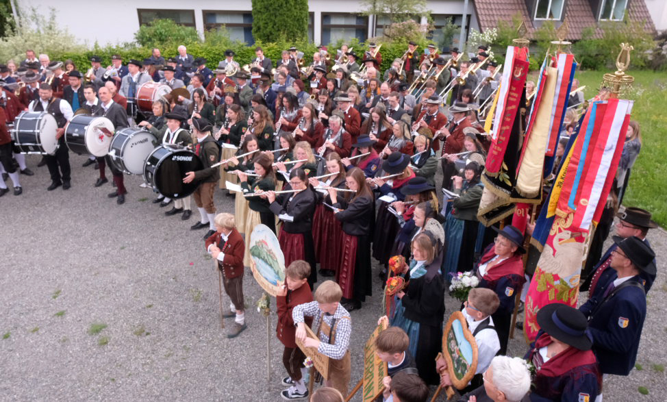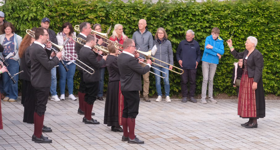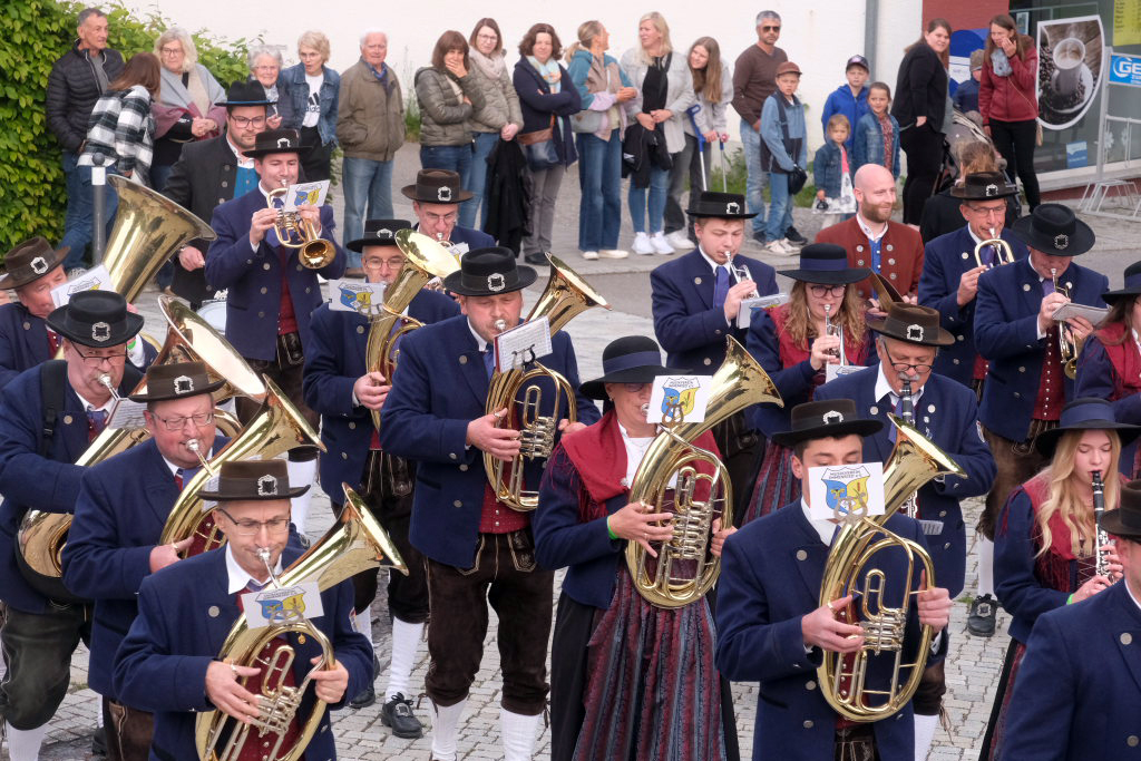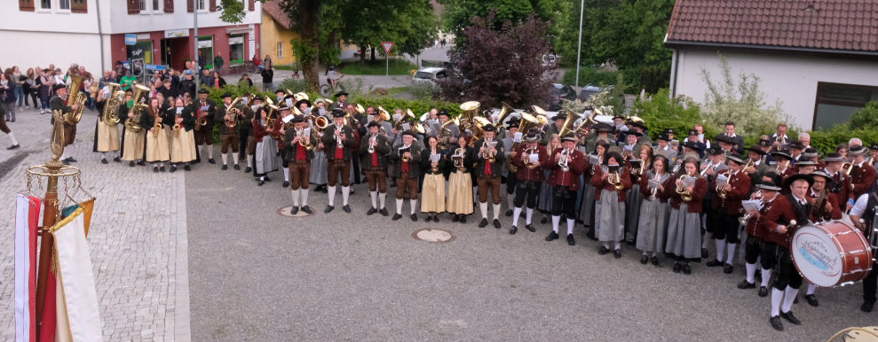 Vorstandsmitglied Stefanie Jöchle, die Begrüßung und Vorstellung der einzelnen Kapellen von der Ehrentribüne aus, einer am Dorfplatz aufgestellten Hebebühne, übernommen hatte, freute sich, dass so viele Gäste den Dorfplatz am Fuße der Pfarrkirche säumten. Der Dirigent des Geburtstagskindes, Berthold Hiemer, hatte die Ehre, das erste Stück des Gesamtchores, die Polka „Böhmische Liebe“ zu dirigieren.