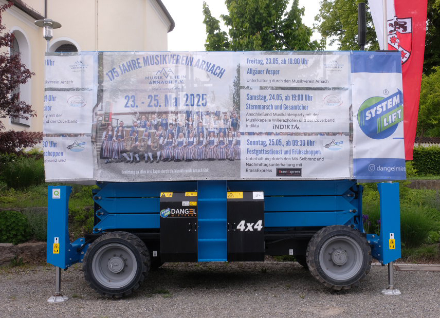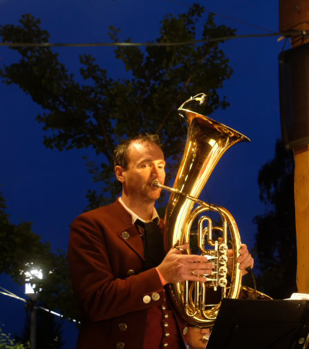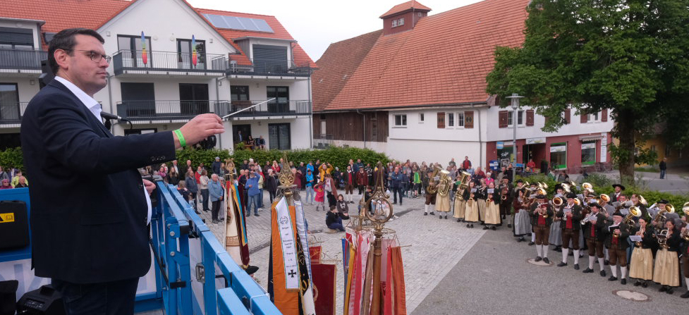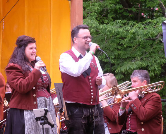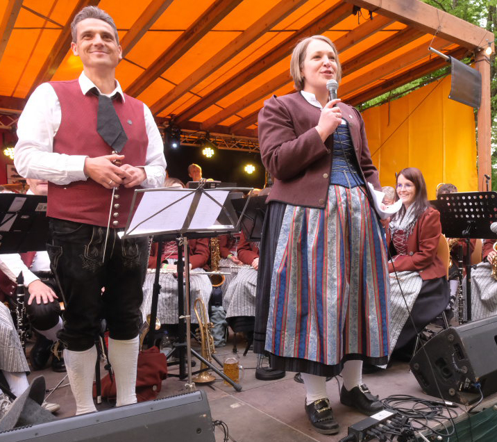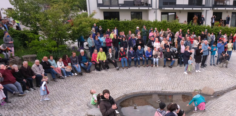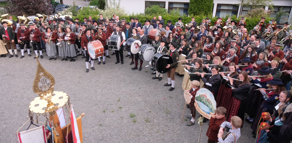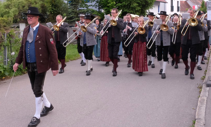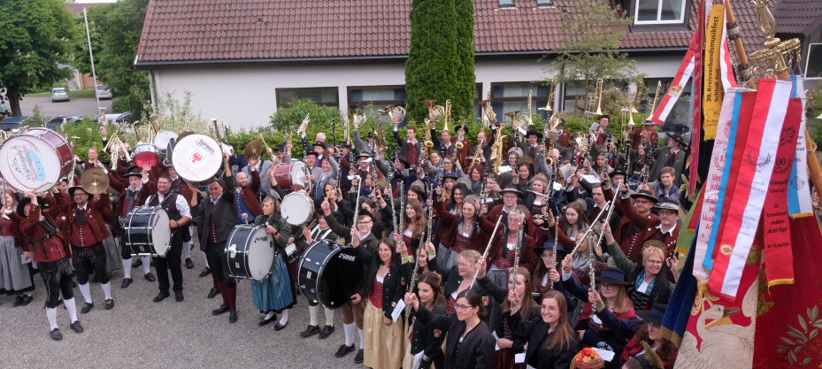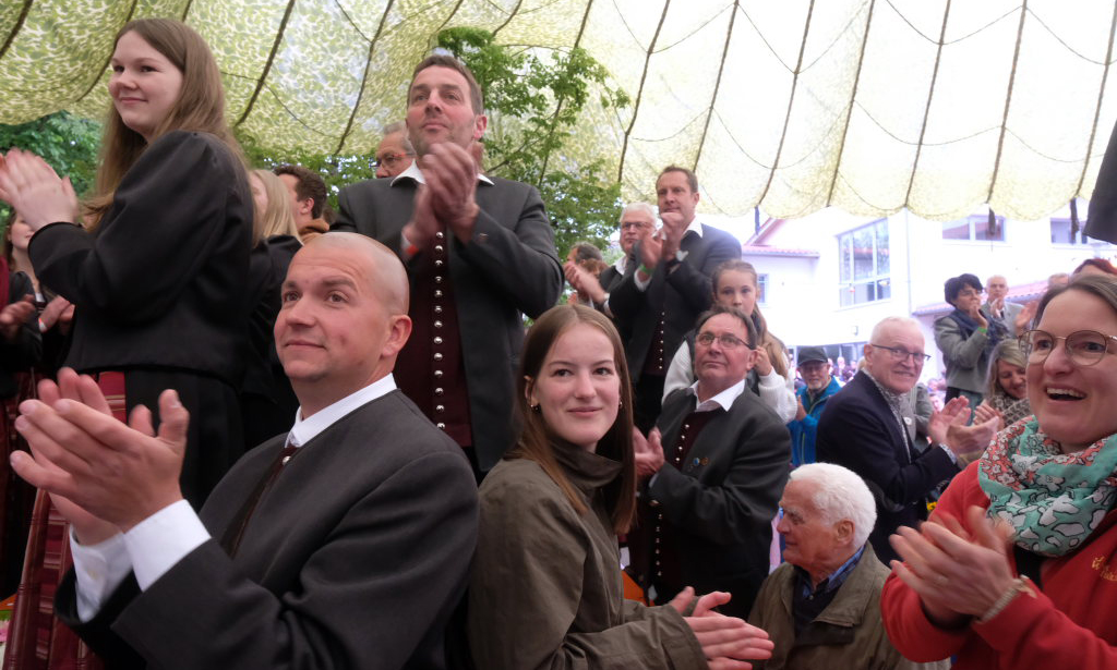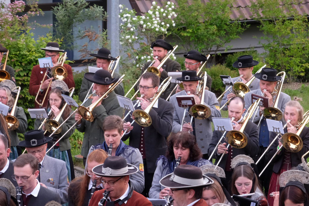 Vorstandsmitglied Stefanie Jöchle, die Begrüßung und Vorstellung der einzelnen Kapellen von der Ehrentribüne aus, einer am Dorfplatz aufgestellten Hebebühne, übernommen hatte, freute sich, dass so viele Gäste den Dorfplatz am Fuße der Pfarrkirche säumten. Der Dirigent des Geburtstagskindes, Berthold Hiemer, hatte die Ehre, das erste Stück des Gesamtchores, die Polka „Böhmische Liebe“ zu dirigieren.