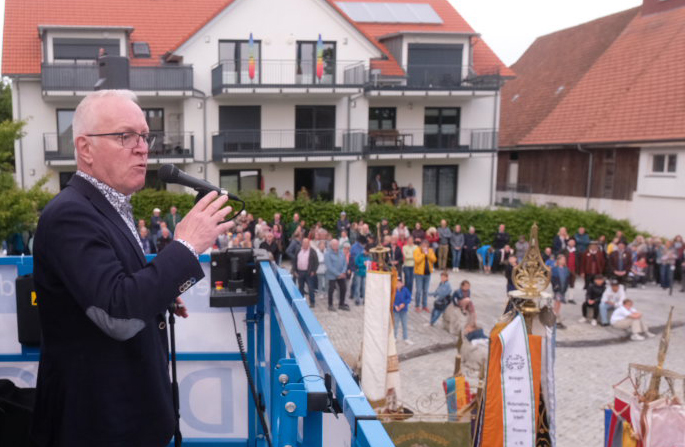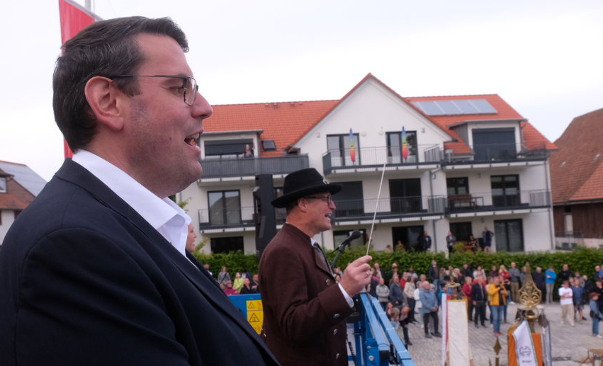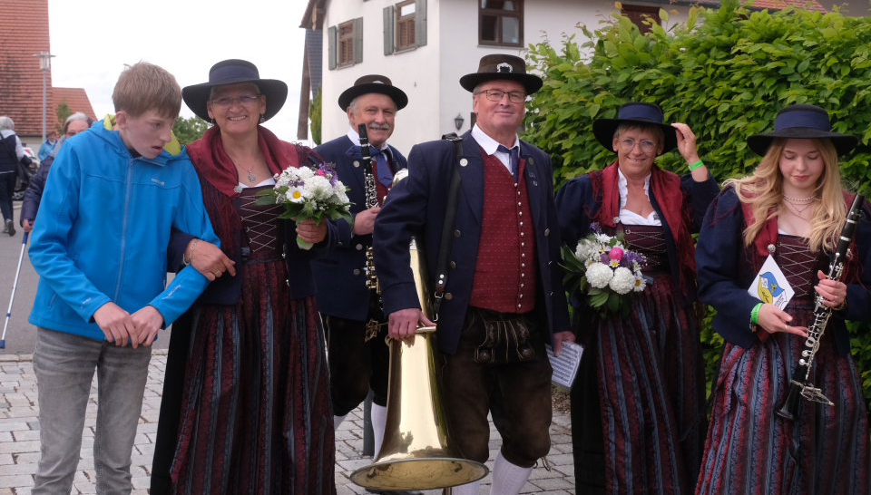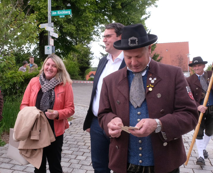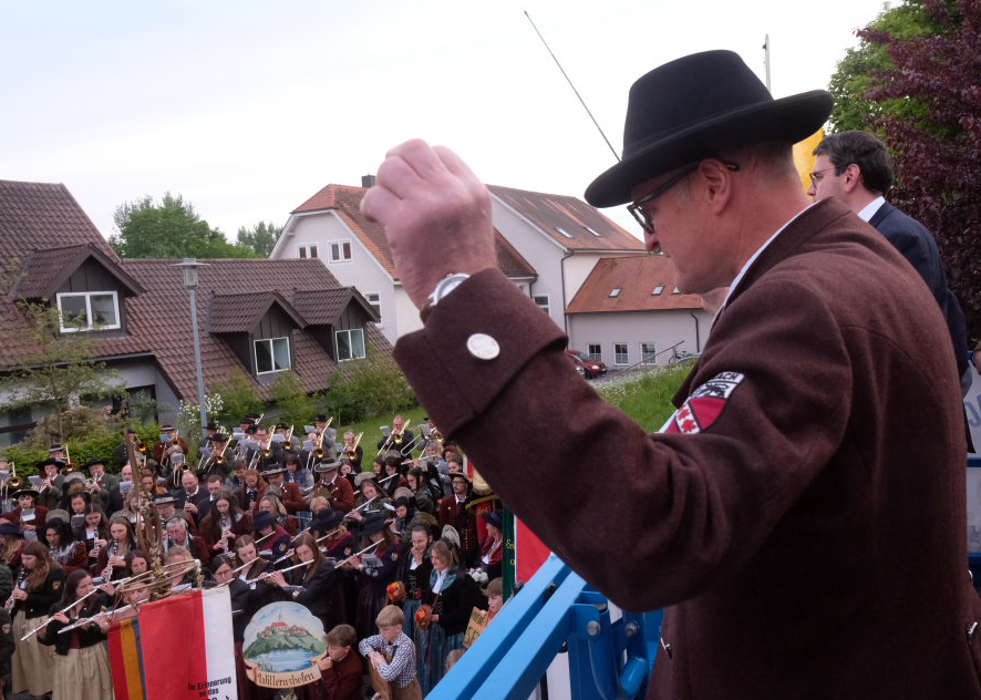 Ortsvorsteher Manfred Braun konnte dies bestätigen. Ihm fiel, als Vertreter des Landtagsabgeordneten Raimund Haser, der im Wochenendverkehr gestrandet war (aber dann am Sonntag zum Fest-Frühschoppen erschien), die Ehre zu, das nächste der drei gemeinsam gespielten Stücke, den „Bozener Bergsteiger-Marsch“ zu dirigieren. Was ihm aber angesichts seiner eigenen Musikerkarriere als Schlagzeuger nicht allzu schwergefallen sein dürfte. Dem dritten im Bunde, Klaus Wachter, als Vertreter des Blasmusikkreisverbandes und langjährigem Dirigenten des Musikvereines Haidgau (akteill: Dirigent in Haisterkirch) sowieso nicht. Wachter durfte das festliche „Musica Gloriosa“ von Alfred Bösendorfer dirigieren und die Musikanten danach zum Musikantengruß auffordern mit dem die Mission Gesamtchor am Dorfplatz endete.