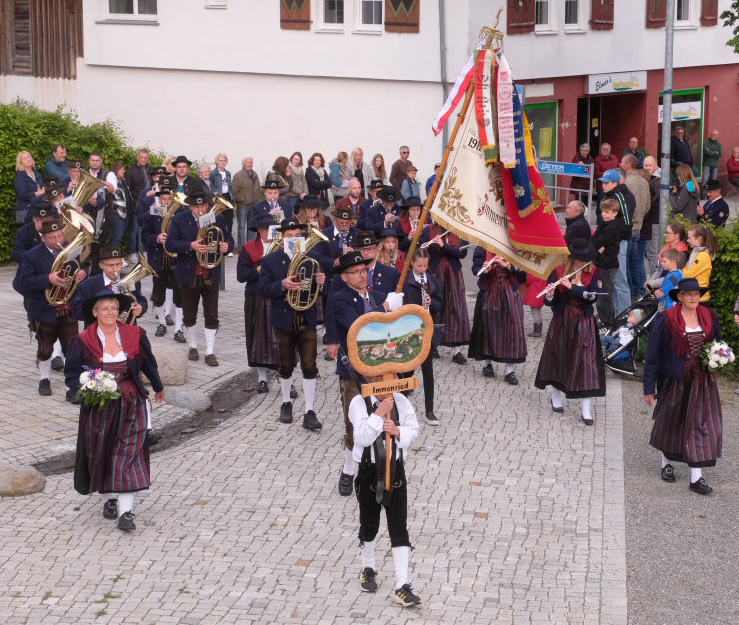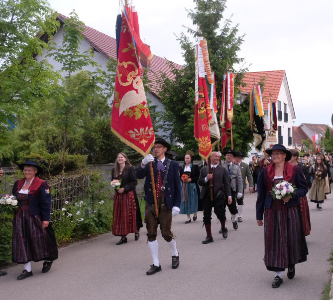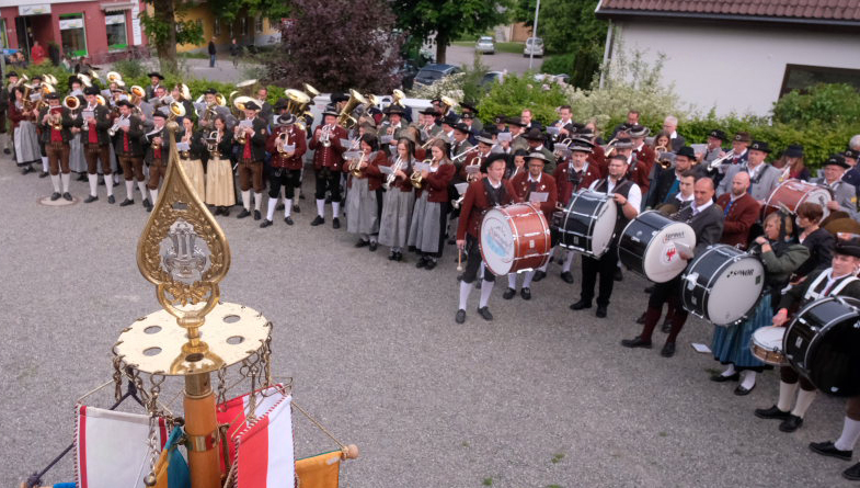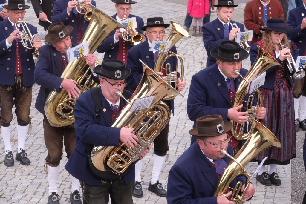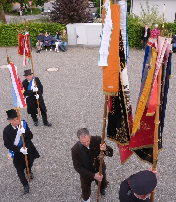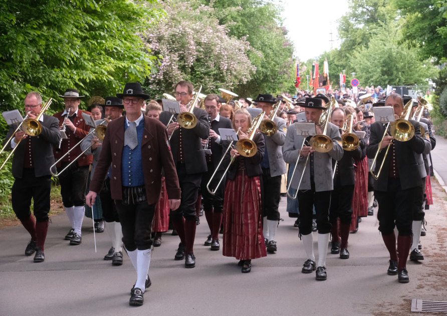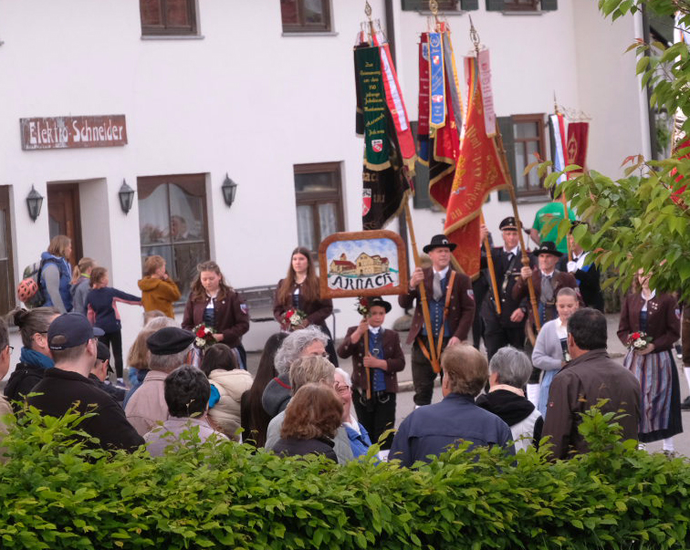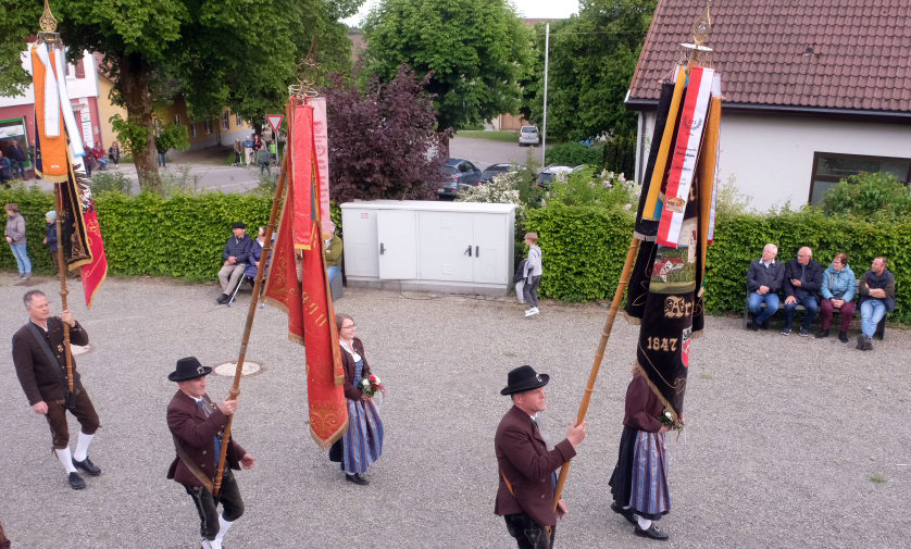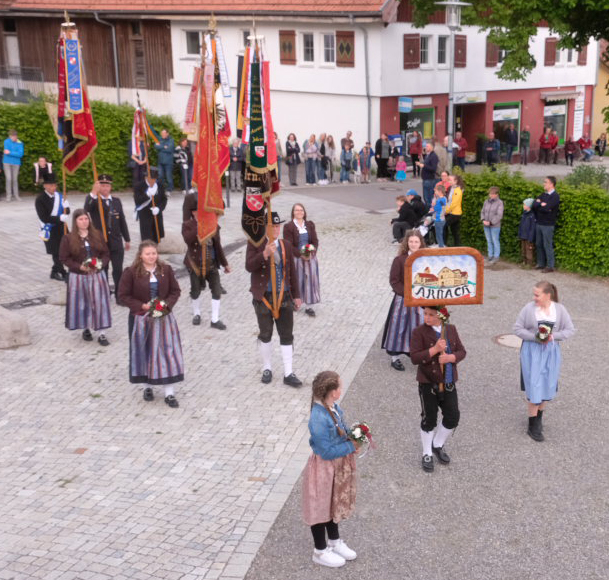 Den Auftakt zum Aufmarsch des Gesamtchores machte das Geburtstagskind, der gastgebende Musikverein Arnach, der gleich mit seinen beiden Vereinsfahnen samt Fahnenbegleitung vom Festgelände beim Bildungshaus her zum Dorfplatz marschierte. Extra für dieses Jubiläum wurde die alte Vereinsfahne von 1890 aus der Vitrine geholt, um sie gemeinsam mit ihrer Nachfolgerin von 1981 zu präsentieren. Dazu gesellten sich noch die Vereinsfahnen von Kriegerverein und Feuerwehr sowie die Standarten der Blutreitergruppe Arnach, die in diesem Jahr ihr 100-jähriges Bestehen feiert, das beim Festgottesdienst tags darauf entsprechend gewürdigt werden sollte.