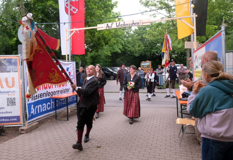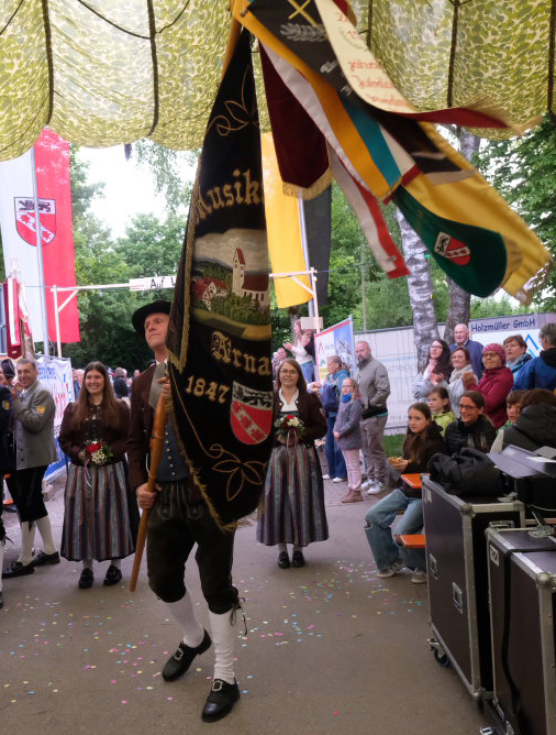 Arnach – Drei Tage lang feierte der Musikverein Arnach sein 175-jähriges Bestehen. Der Samstagabend (24.5.) begann mit dem traditionellen Sternmarsch der sechs anwesenden Musikkapellen, um sich auf dem Dorfplatz zu einem Gesamtchor zu vereinen, ehe man  danach als eine große Kapelle zum Festgelände an der Schule zog. Höhepunkt jedes Musikfestes ist natürlich der Fahneneinzug und so wurde dieser auch in Arnach auf dem Festgelände bei der Festhalle frenetisch gefeiert.