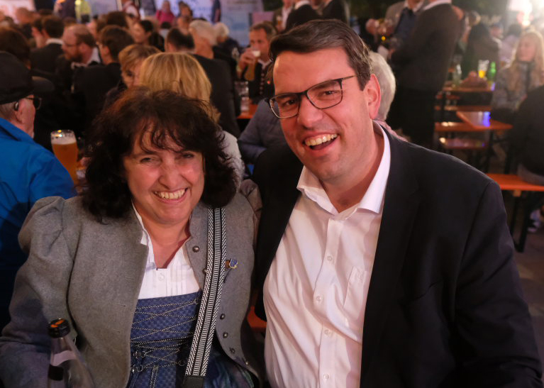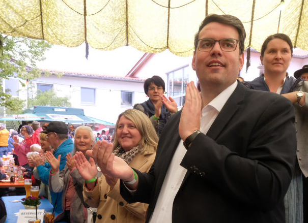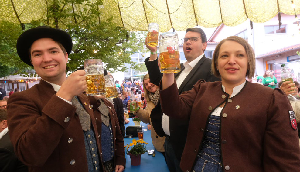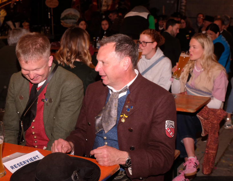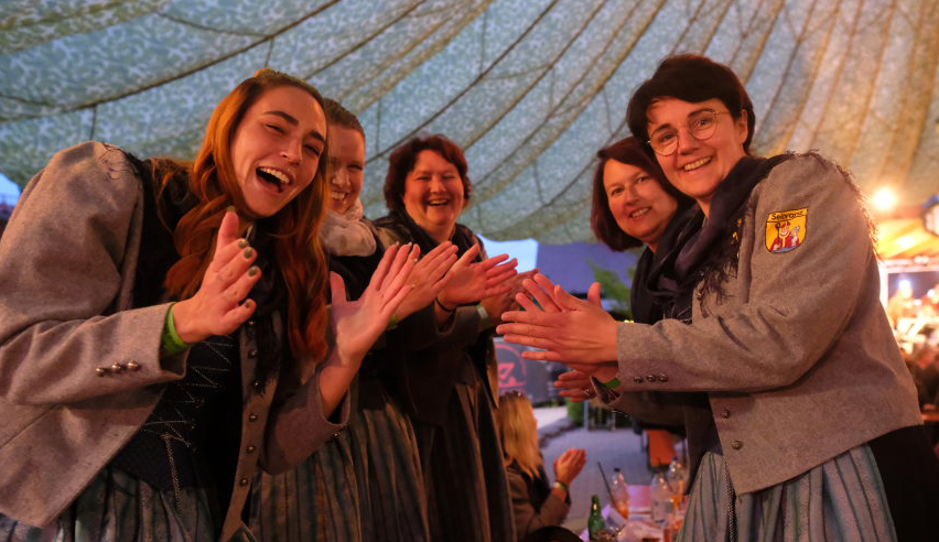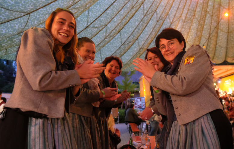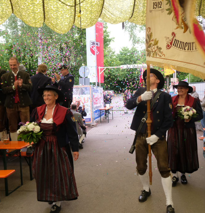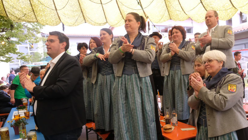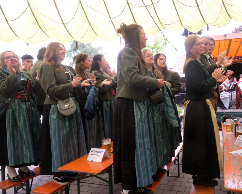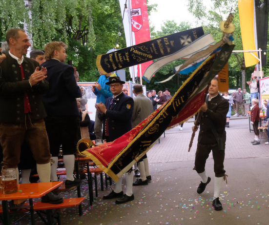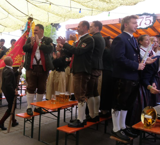 Ganz so hart traf es Steffie Jöchle nicht, aber dennoch kam Gänsehautfeeling auf, als die Musiker, auf den Bierbänken stehend, dem jeweilig einmarschierenden Fähnrich begeistert zujubelten.