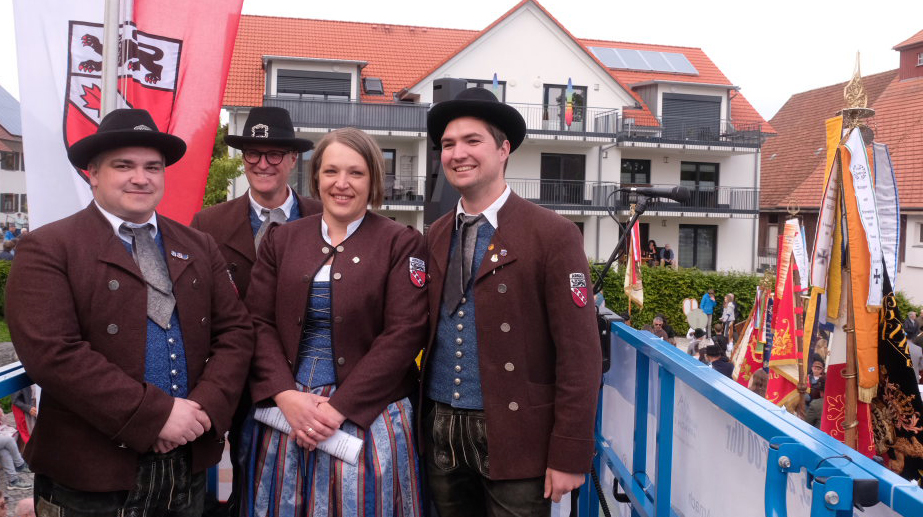 Die Führungsriege des Musikvereins Arnach: Alexander Müller, Berthold Hiemer (Dirigent), Stefanie Jöchle (Vorstandssprecherin), Martin Fimpel.