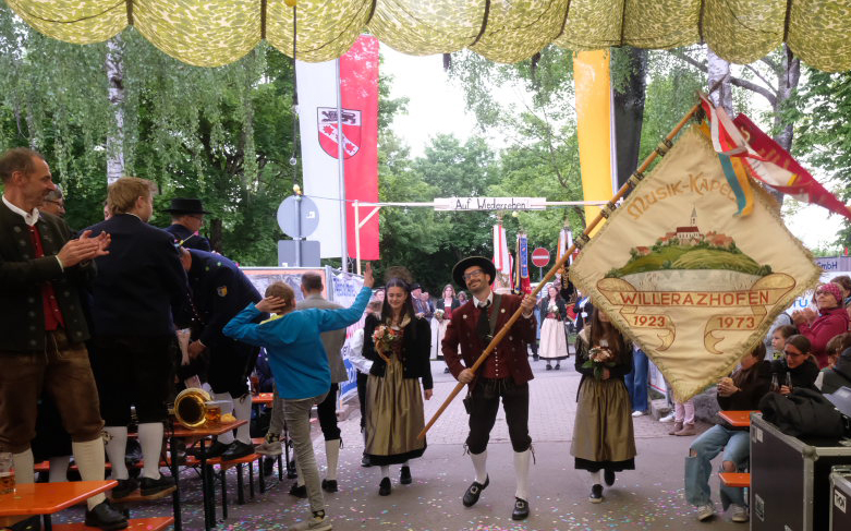 Nachdem die Musikkapelle Willerazhofen auf der Bühne Platz genommen hatte, kam der nächste Höhepunkt eines jeden Musikfestes: der Fahneneinzug, der bei 70 und mehr Kapellen und Vereinen schon manchen Ansager am Ende des Tages nur noch flüstern ließ.