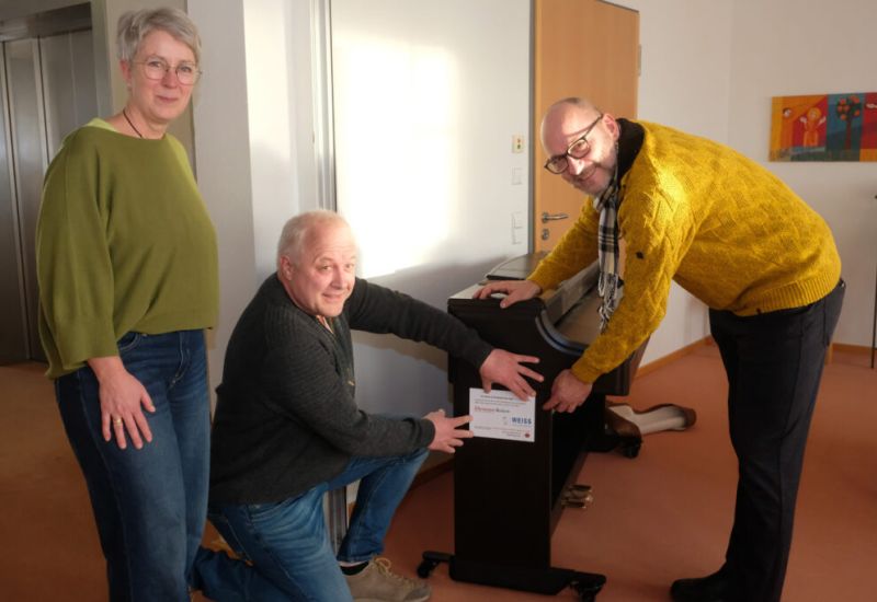 Matthias Winstel, der schon viele Gottesdienste in dem Seniorenheim mitgestaltet hat, freute sich bei einer Feierstunde gemeinsam mit der Heimleitung sowie den Stiftern in Person von Jo Weiss (Geschäftsführer Metallbau Weiss) und Ute Ehrmann (Geschäftsführerin Ehrmann Reisen) über das mobile E-Piano. Denn – da es auf Rollen steht – kann es auch für andere Feiern wie etwa Geburtstage auf jedem Stockwerk des Seniorenheimes eingesetzt werden.