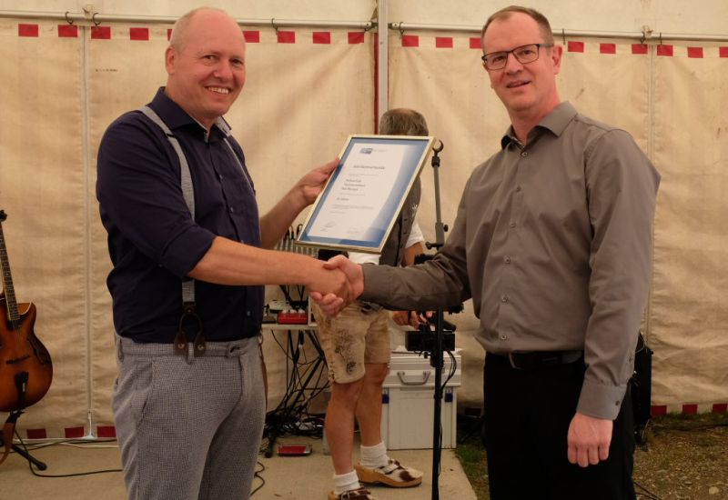 Bad Wurzach – Richard Volk, Inhaber des Taxiunternehmens Taxi Volk feierte sein Jubiläum als Unternehmer mit einem großen Fest im Hof seines Unternehmens und wurde von Ralf Thiedmann, dem Vorsitzenden des Verkehrsausschusses der IHK, für sein außergewöhnliches Engagement gewürdigt. Die Narrenzunft Hauerz hatte die Bewirtung übernommen.