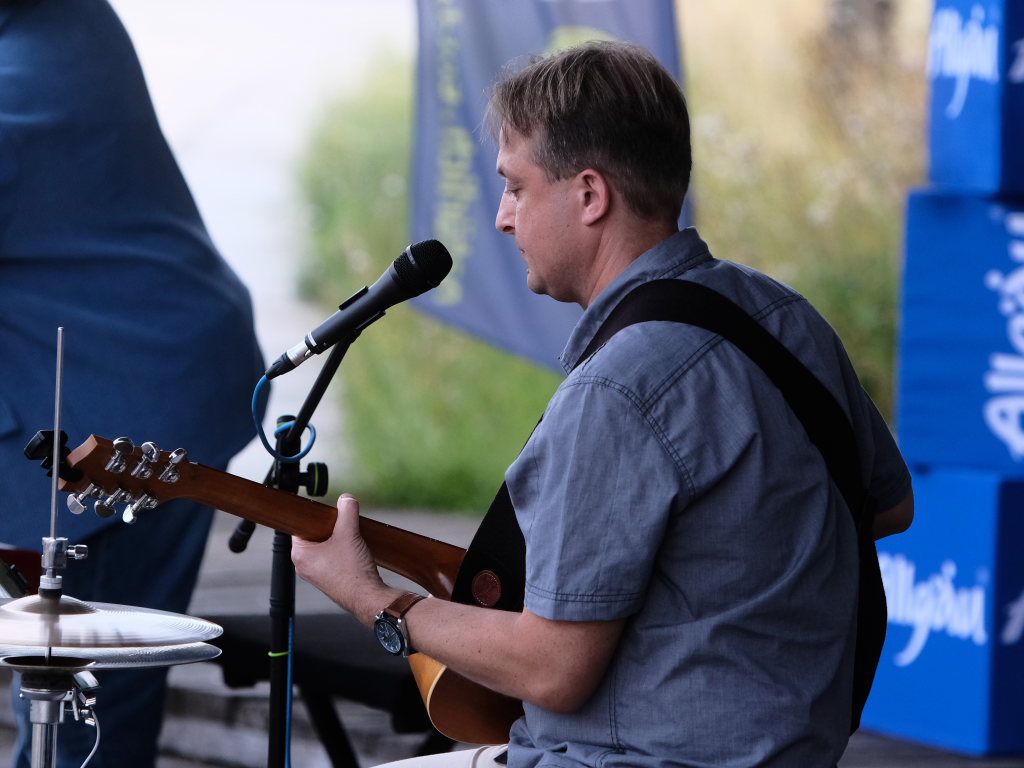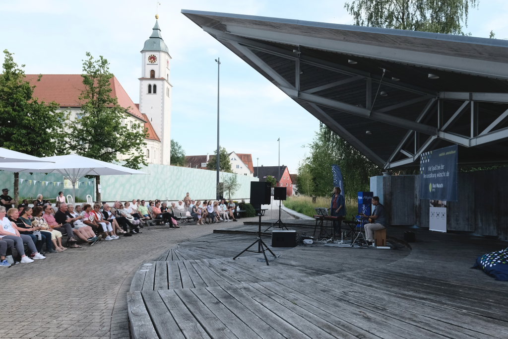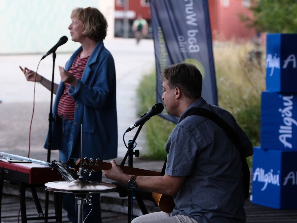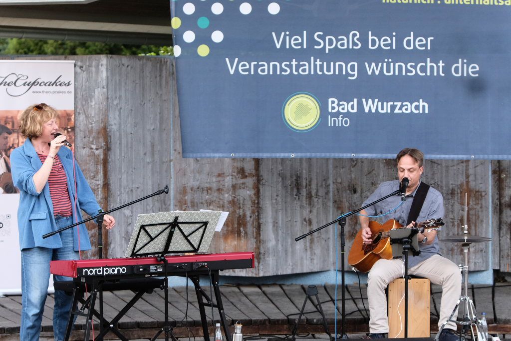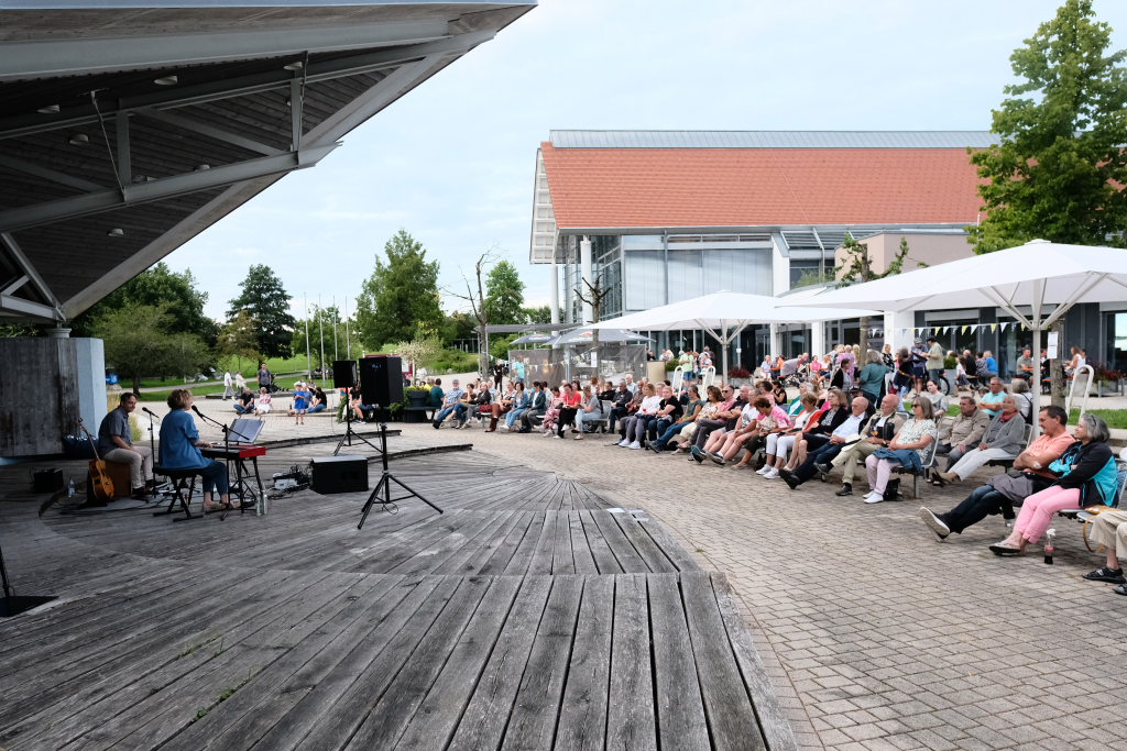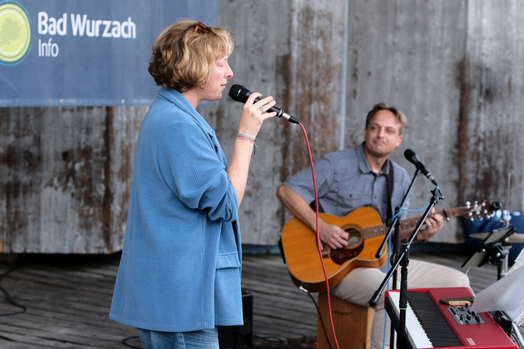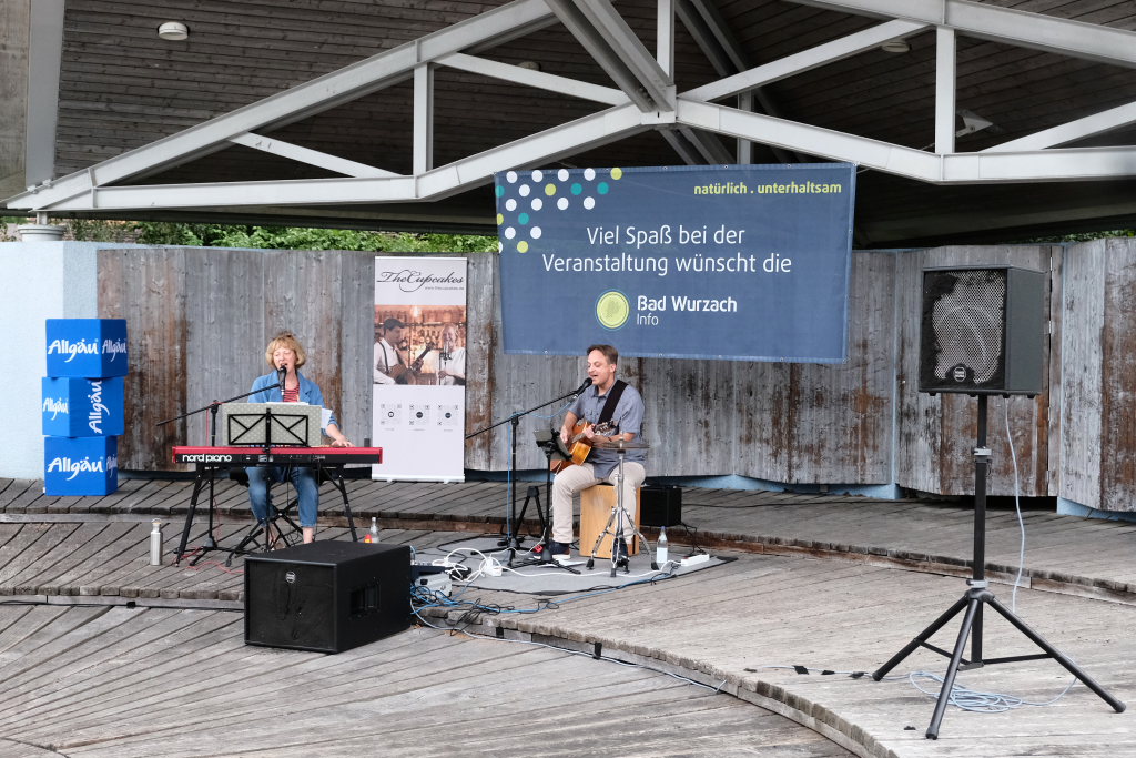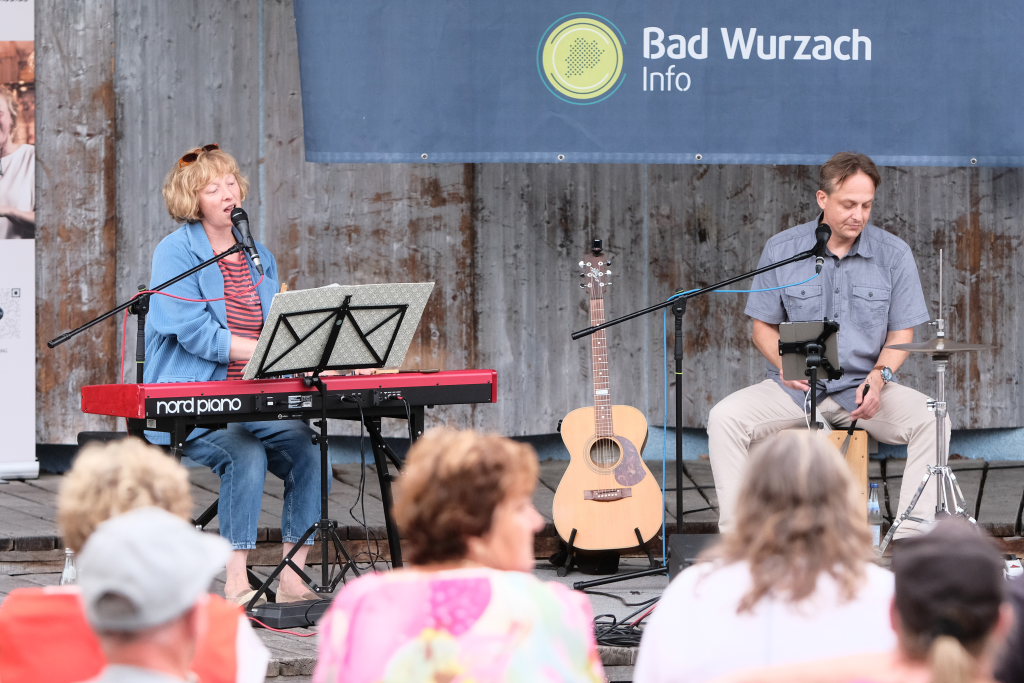 Ob sie nun ihre wunderbar zurückgenommene Version von Simon & Garfunkels „Mrs Robinson“ performten, oder aber ihre Akustik-Version von „Proud Mary“, mit der die vor kurzem verstorbene Tina Turner oft ihre rasanten Bühnenshows beendete. Und wenn dann Anna Holzhauser am E-Piano ins Improvisieren verfiel, konnten sich auch die Jazzfreunde im Publikum freuen. Und auch die Italien-Freunde konnten sich so kurz vor dem langersehnten Urlaub über einige „Einstimmungs“- Songs freuen, etwa „Via con me“ von Paolo Conte oder „Azzuro“ von Reibeisen-Stimme Adriano Celentano. Als dann die Sonne so langsam am Untergehen war und das Konzert sich seinem Ende entgegenneigte, war klar, dass die Bad Wurzacher die beiden Musiker nicht ohne Zugabe von der Bühne lassen würden.