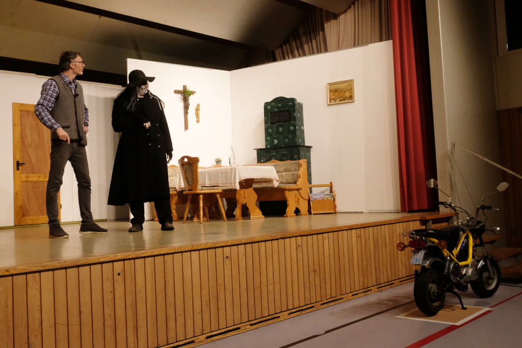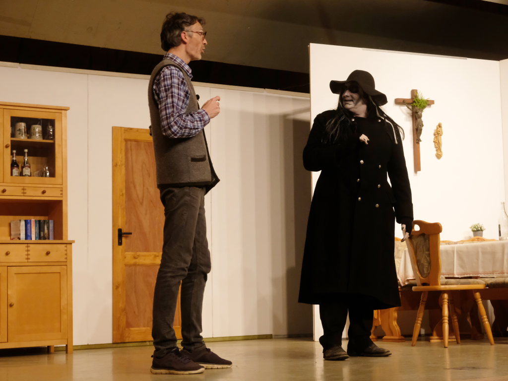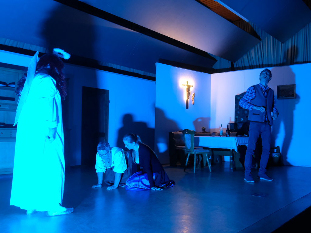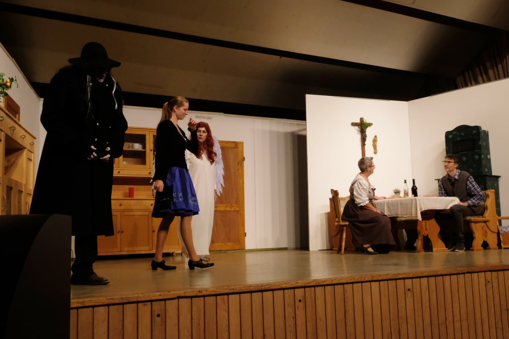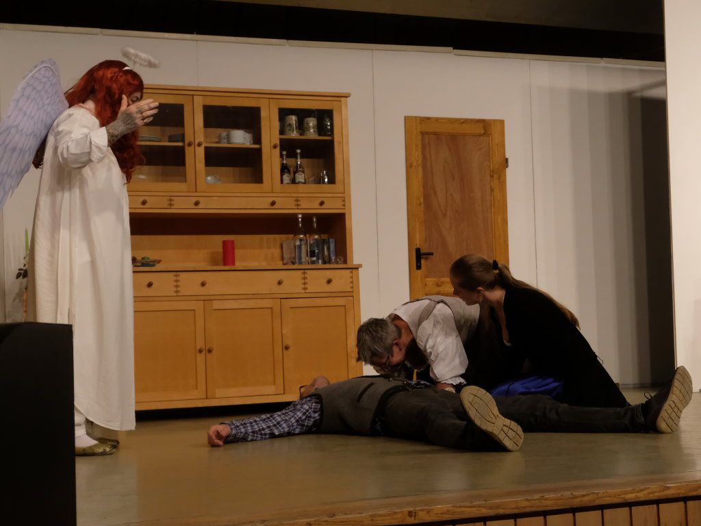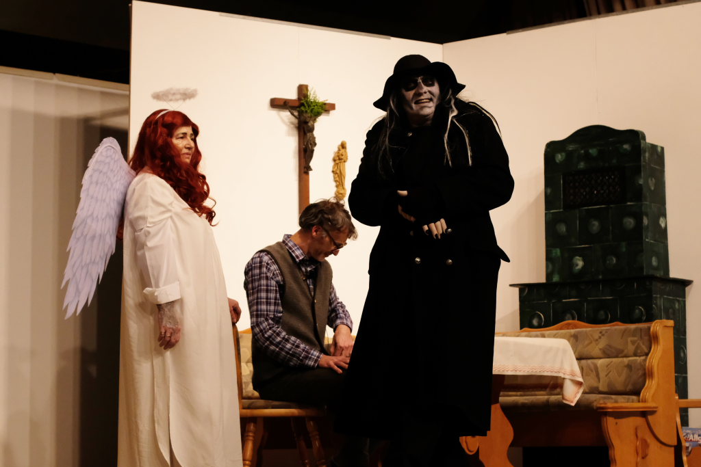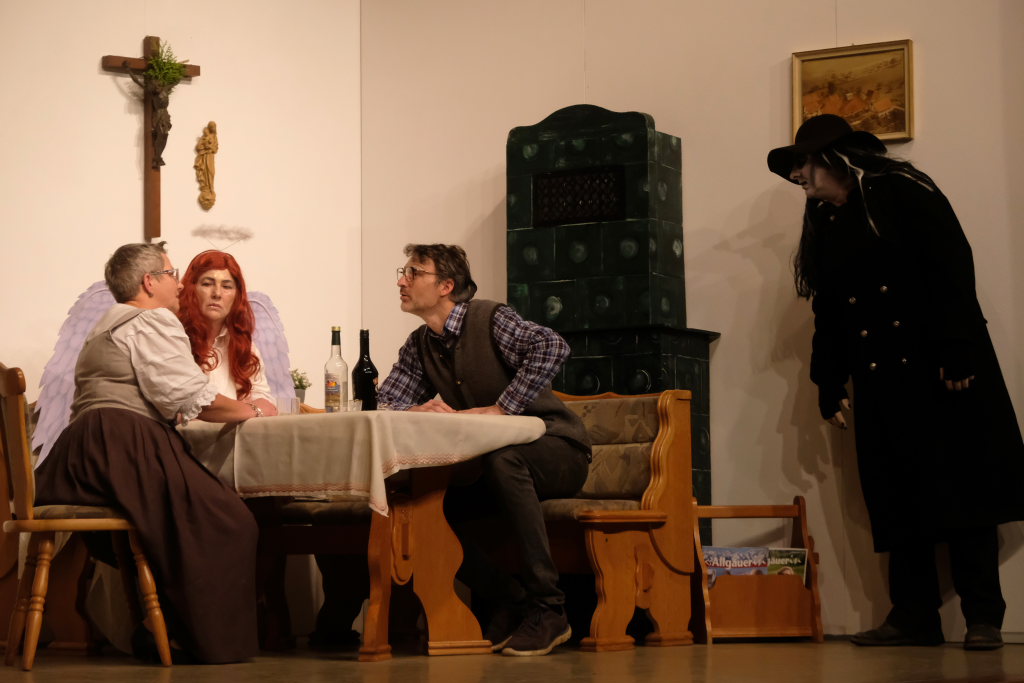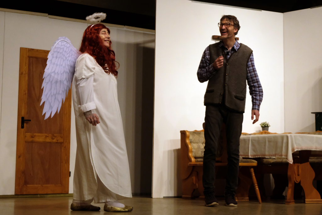 Da war etwa der Erzengel Michael, der – deutlich emanzipiert in Zeiten des Genderns – eine Michaela war, welcher Gudrun Weiss Stimme und himmlische Gestalt verlieh. Die Erzengelin Michaela war auch „Disponentin“ für den mit dem Moped zwischen den Welten herumgeisternden Boandlkramer, dessen Rolle seinem Darsteller Markus Brauchle auf den Leib geschneidert zu sein schien und in der er sich so richtig austoben durfte. Wie bei Don Camillo meldete sich auch hier hin und wieder der liebe Gott persönlich zu Wort, dem Karl Schöllhorn Stimme und göttliches Gewicht verlieh und dessen „Auftritte“ von einem Disco-ähnlichen Blinken des Kreuzes an der Stubenwand begleitet wurden.