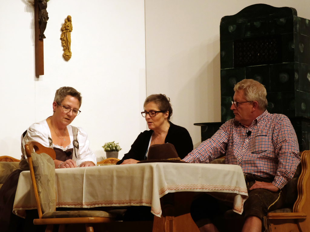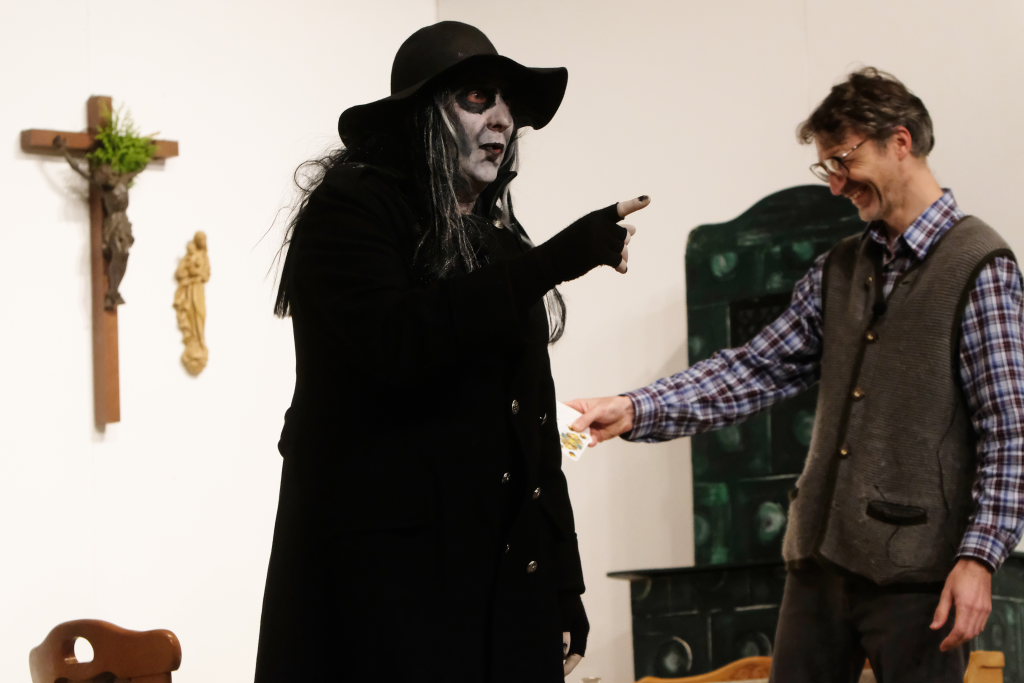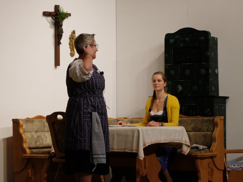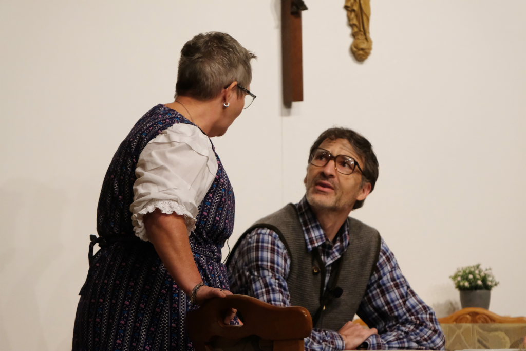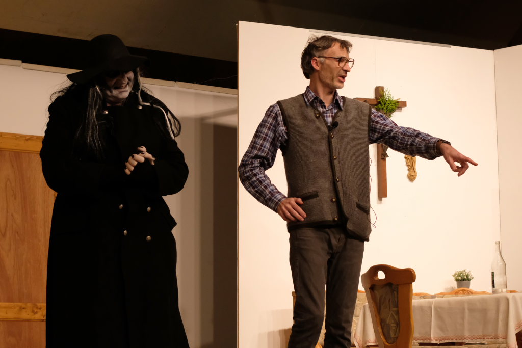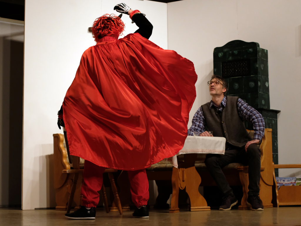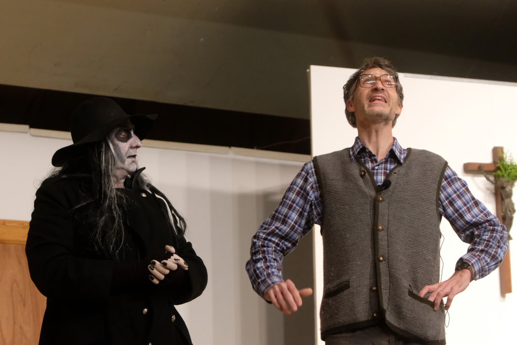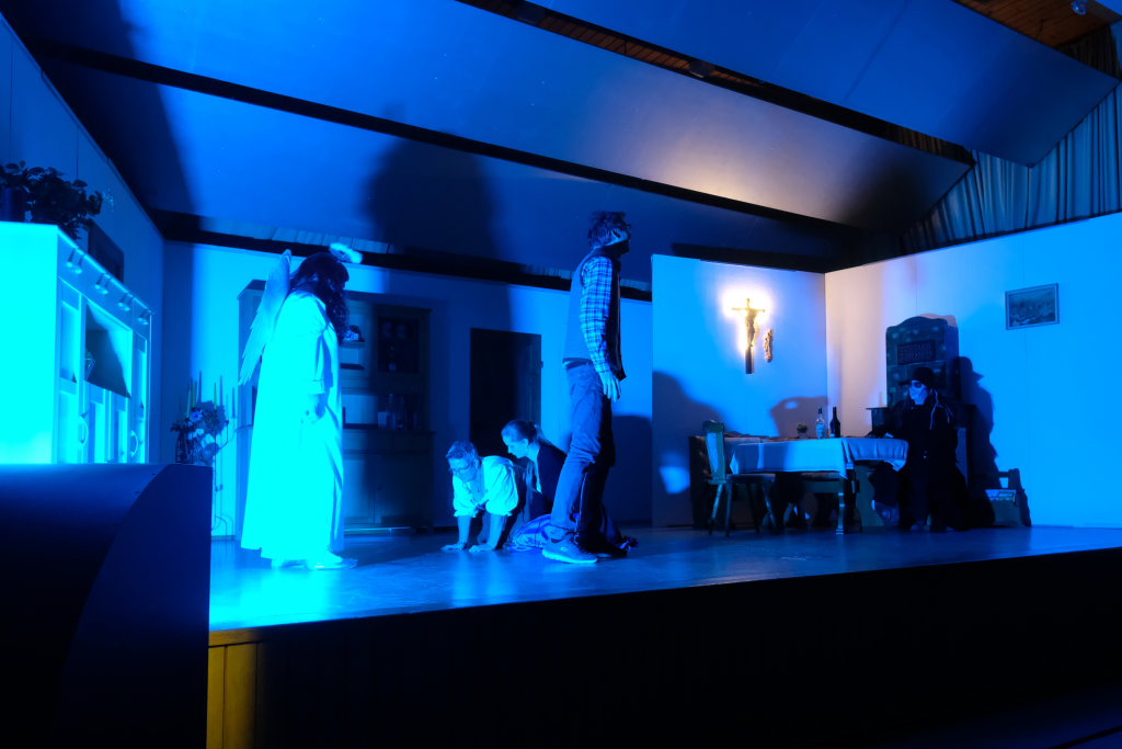 Da war etwa der Erzengel Michael, der – deutlich emanzipiert in Zeiten des Genderns – eine Michaela war, welcher Gudrun Weiss Stimme und himmlische Gestalt verlieh. Die Erzengelin Michaela war auch „Disponentin“ für den mit dem Moped zwischen den Welten herumgeisternden Boandlkramer, dessen Rolle seinem Darsteller Markus Brauchle auf den Leib geschneidert zu sein schien und in der er sich so richtig austoben durfte. Wie bei Don Camillo meldete sich auch hier hin und wieder der liebe Gott persönlich zu Wort, dem Karl Schöllhorn Stimme und göttliches Gewicht verlieh und dessen „Auftritte“ von einem Disco-ähnlichen Blinken des Kreuzes an der Stubenwand begleitet wurden.