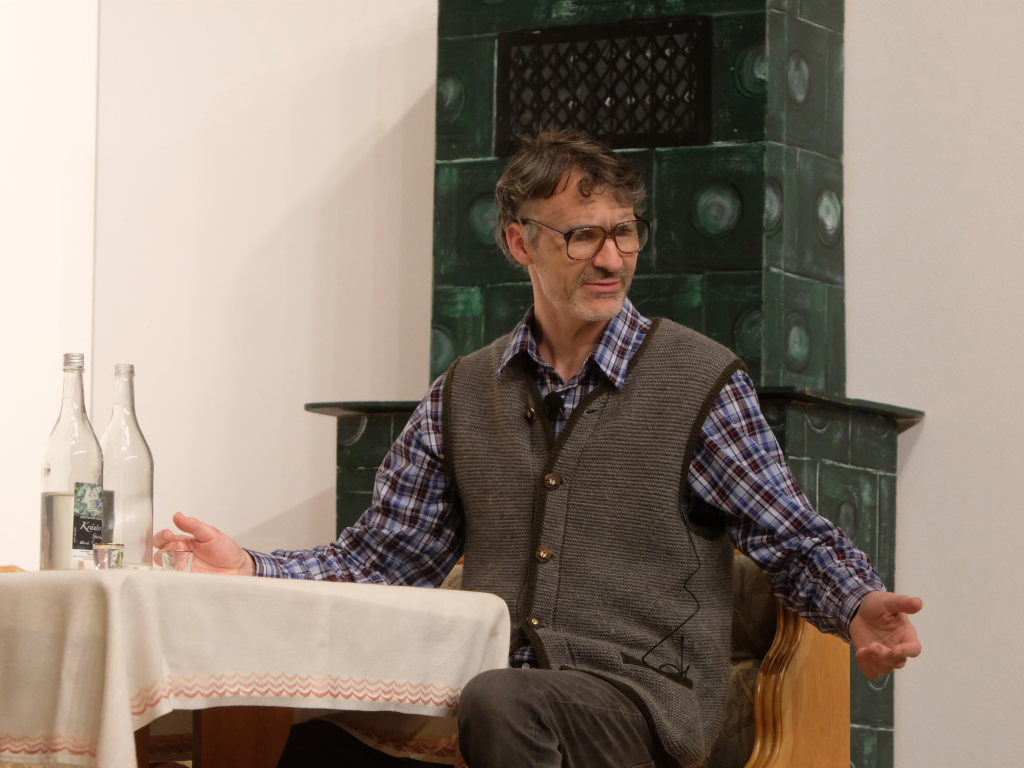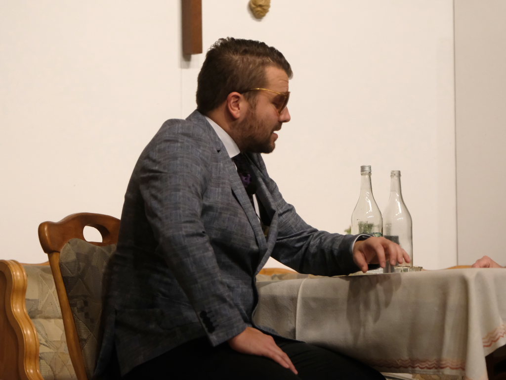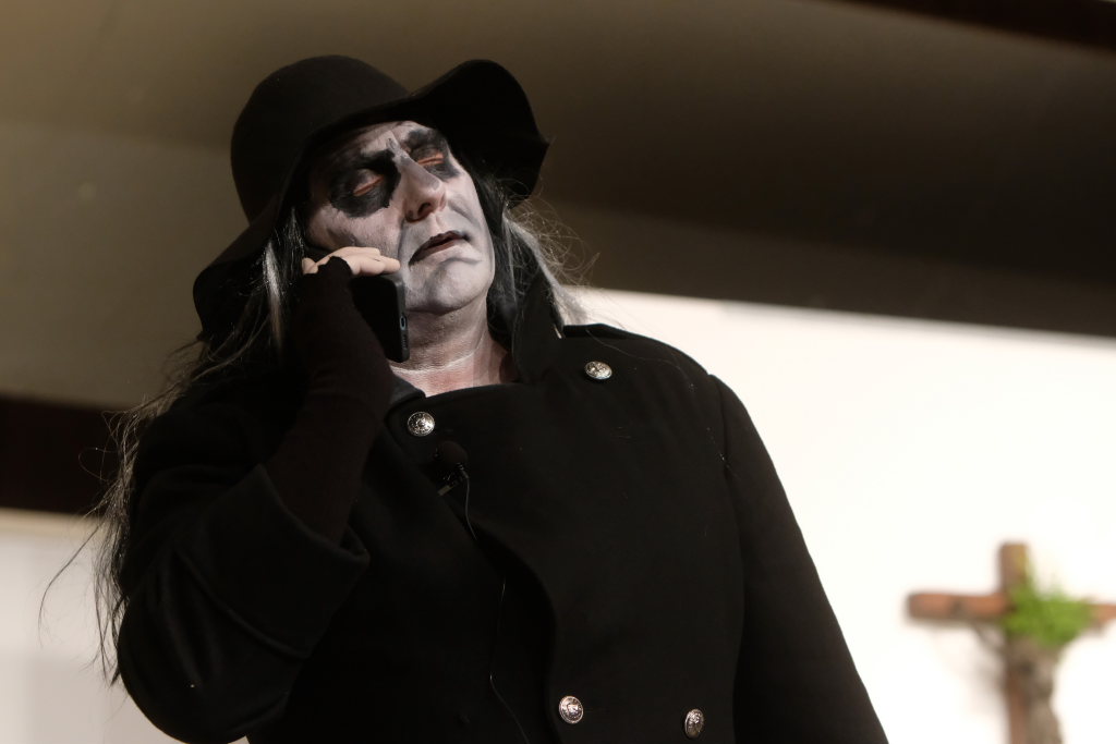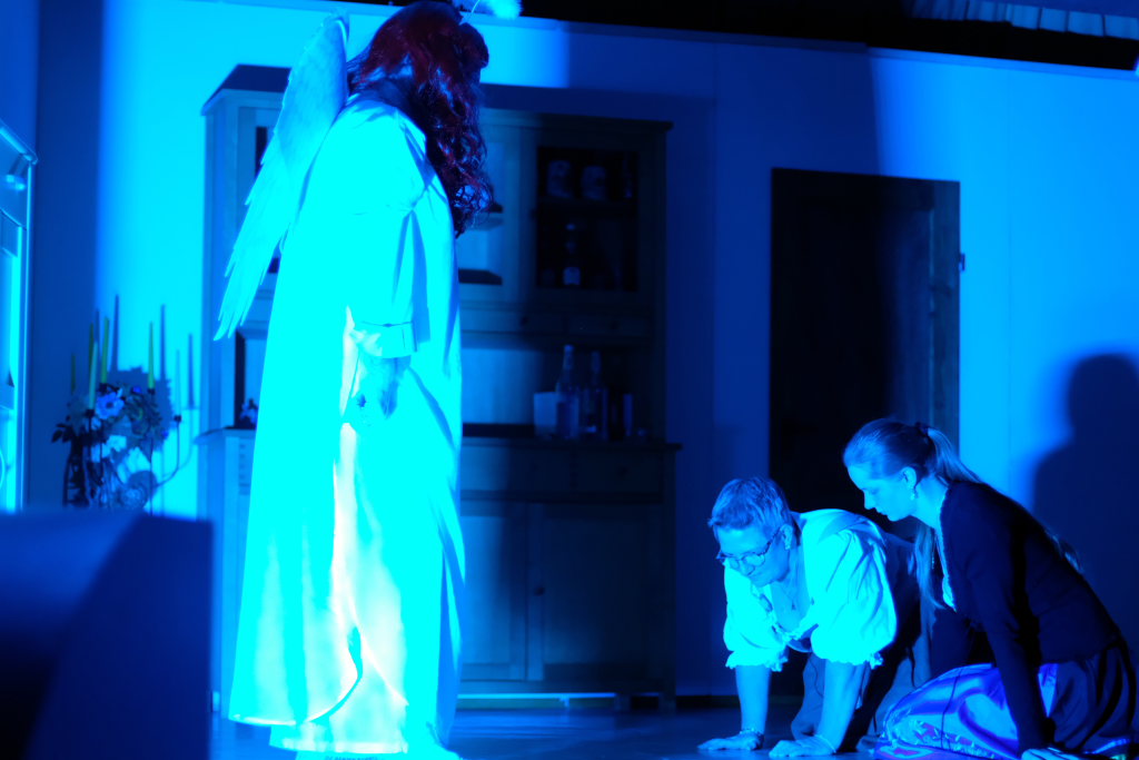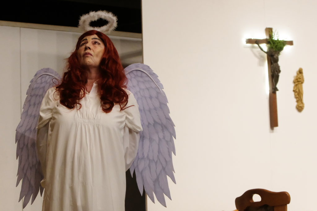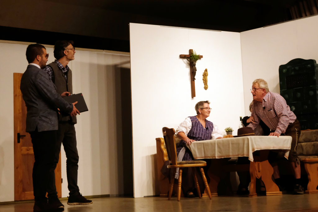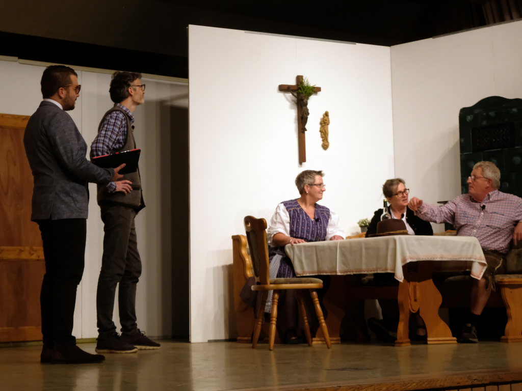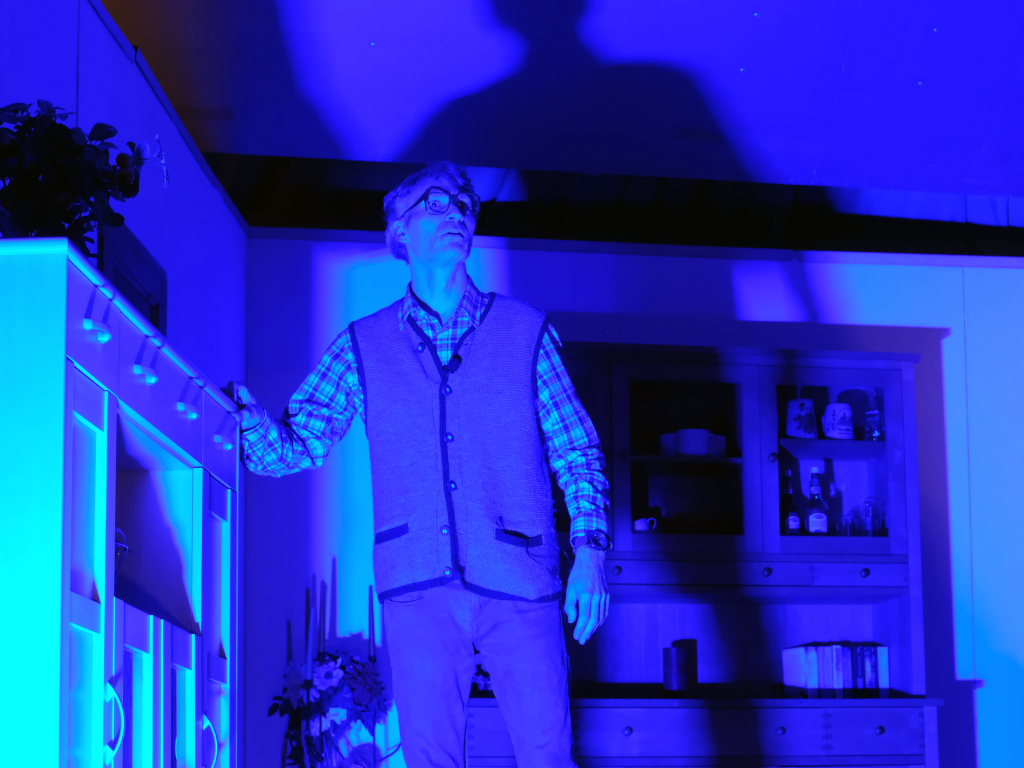 Da war etwa der Erzengel Michael, der – deutlich emanzipiert in Zeiten des Genderns – eine Michaela war, welcher Gudrun Weiss Stimme und himmlische Gestalt verlieh. Die Erzengelin Michaela war auch „Disponentin“ für den mit dem Moped zwischen den Welten herumgeisternden Boandlkramer, dessen Rolle seinem Darsteller Markus Brauchle auf den Leib geschneidert zu sein schien und in der er sich so richtig austoben durfte. Wie bei Don Camillo meldete sich auch hier hin und wieder der liebe Gott persönlich zu Wort, dem Karl Schöllhorn Stimme und göttliches Gewicht verlieh und dessen „Auftritte“ von einem Disco-ähnlichen Blinken des Kreuzes an der Stubenwand begleitet wurden.