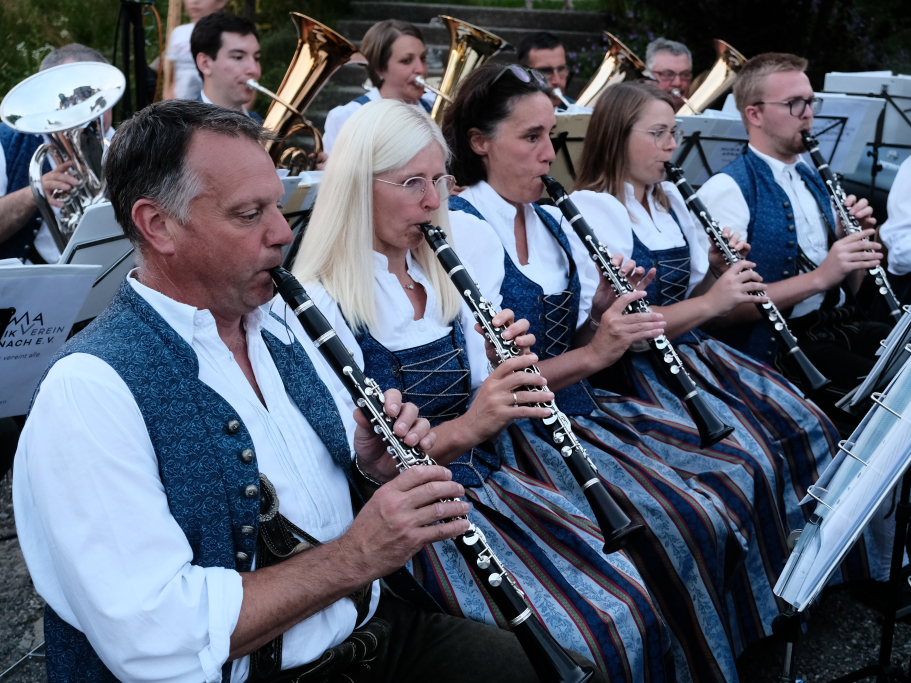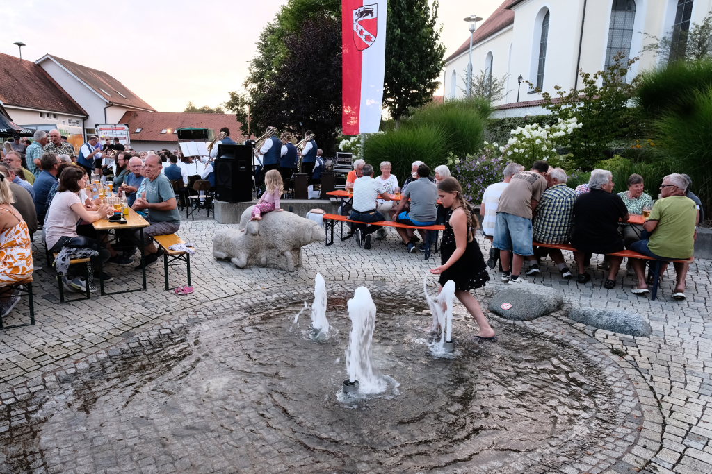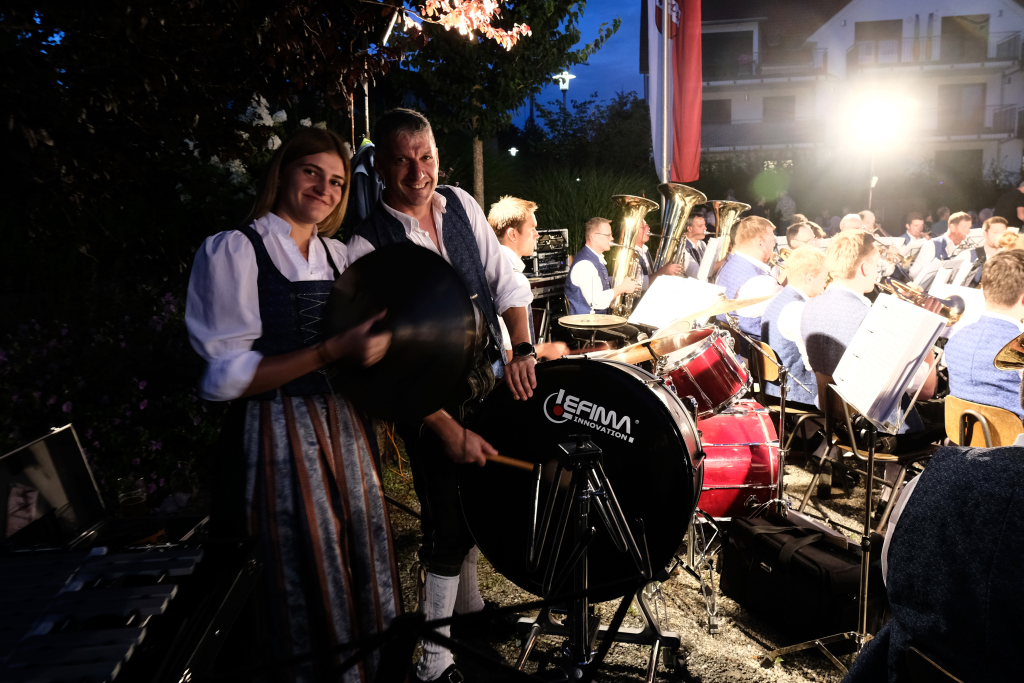 Als dann die Dämmerung dann an Leuchtkraft verlor und die Baustrahler ihr hartes Licht über die Musiker verteilte, war es an der Zeit Abschied zu nehmen, denn wo Licht ist gibt es auch Schatten, so dass es für die Musiker immer schwieriger wurde, ihre Notenblätter zu erkennen. Sie verabschiedeten sich jedoch nicht, ohne vorher noch auf ihren letzten Auftritt vor der Sommerpause, nämlich am 4. August beim Frühschoppen in Friesenhofen hinzuweisen. Nach zwei Zugaben war dann musikalisch wirklich Schluss, wer jedoch noch Durst und Hunger verspürte, bekam noch einige Zeit lang das Gewünschte.