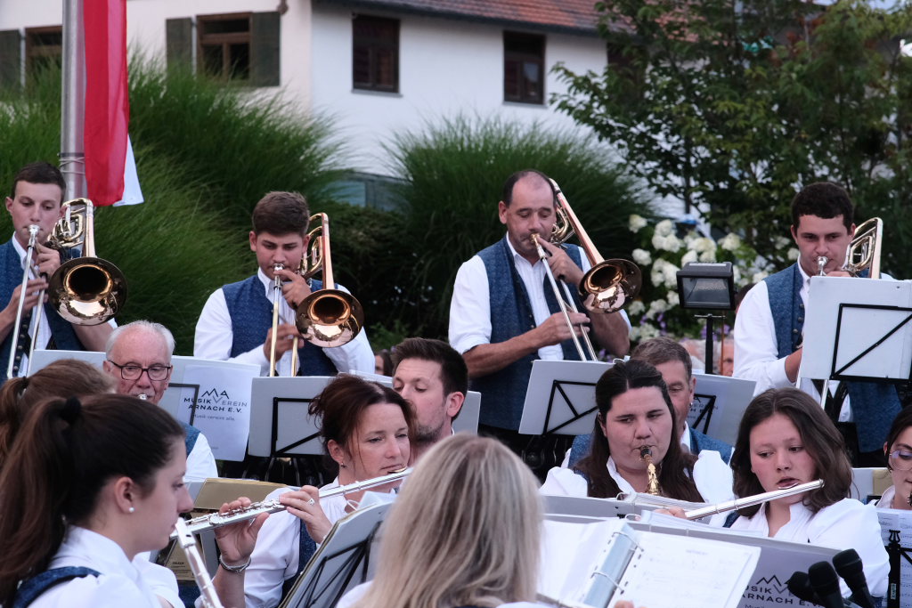 Traditionell zum Ferienbeginn spielte der Musikverein Arnach beim Dämmerschoppen am Dorfplatz auf