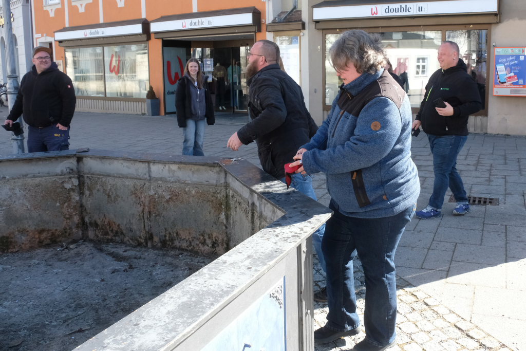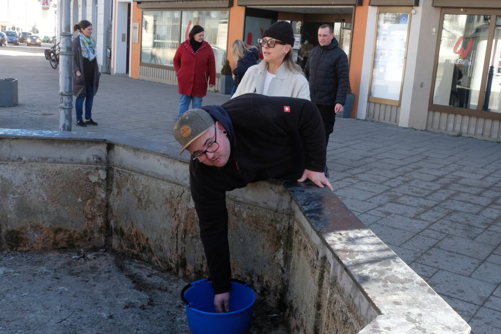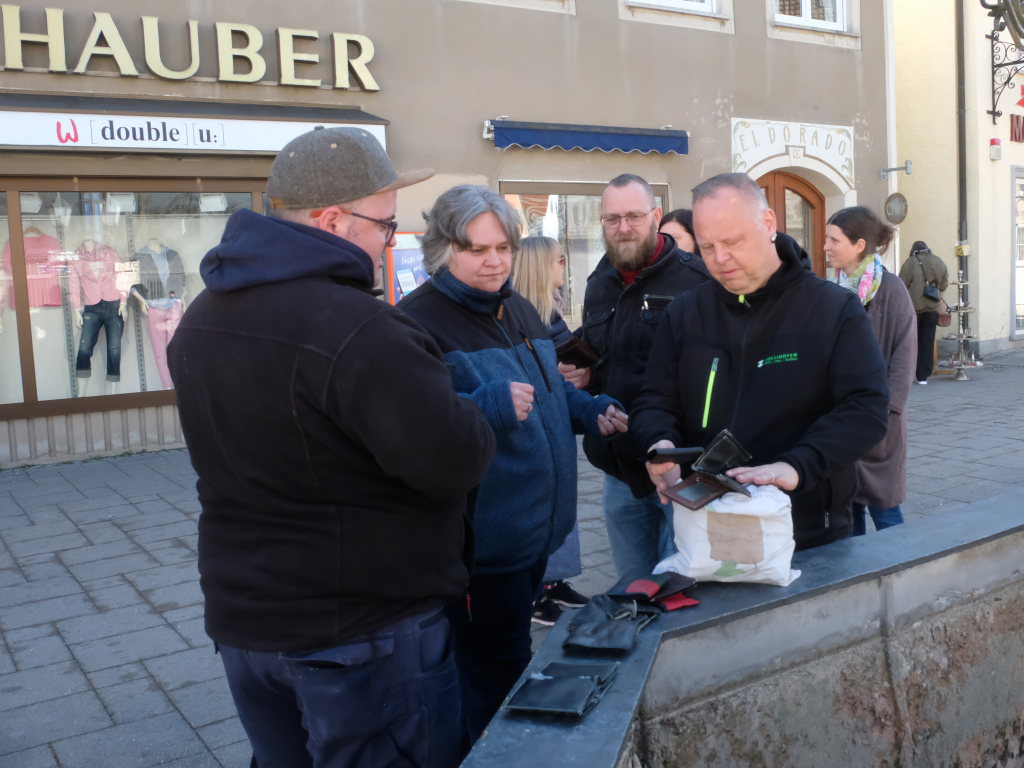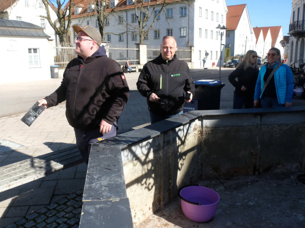 Wie immer am Aschermittwoch um 11.11 Uhr trafen sich auch dieses Jahr wieder die Mitglieder der Riedmeckelerzunft Bad Wurzach am Stadtbrunnen zur traditionellen „Geldbeutelwäsche“. Um dort mit warmen Wasser aus Plastikeimern – der Stadtbrunnen war noch trockengelegt – ihre vom vielen Feiern leeren Geldbeutel zu reinigen.
