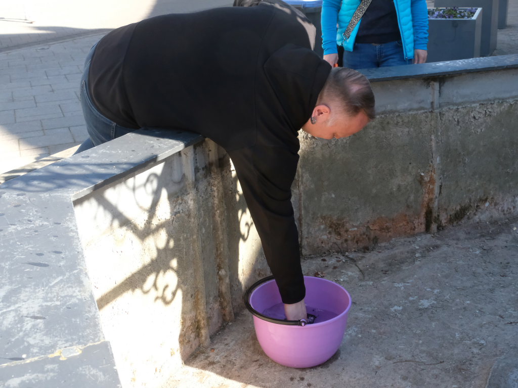 Weil die Temperaturen an diesem Aschermittwoch, der wohl endgültig den Frühling einläutete, schon sehr angenehm waren, verzichteten die Zunfträte und Schaffer nicht auf ihre Wasserspiele. Und so kam es, dass der Verfasser dieser Zeilen, weil als Fotograf in vorderster Linie tätig – unbeabsichtigt – beim Ausschütten eines Eimers in den Genuss einer unfreiwilligen Dusche kam.