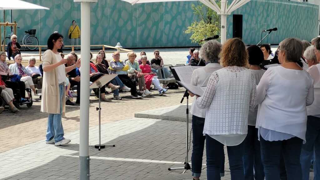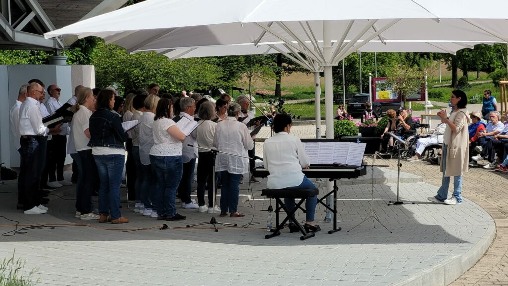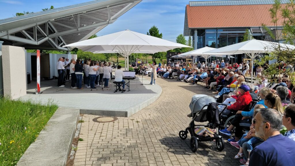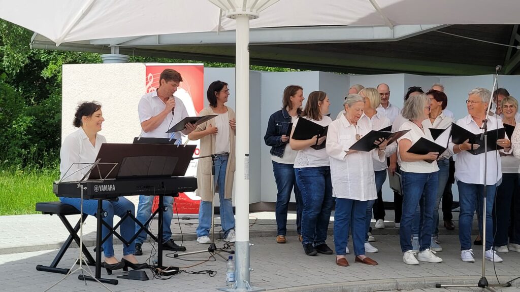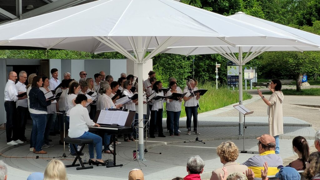 Bad Wurzach – Noch eine Stunde vor Beginn, zitternde Blicke zum Himmel, ob das Wetter hält. Aber dann riss der Himmel auf und bei strahlendem Sonnenschein gelang es dem CHORioso Liederkranz Bad Wurzach, ein rundum gelungenes Frühschoppenkonzert in der Konzertmuschel beim Torfstecher (ehemals Kurhaus) zu präsentieren. Zahlreiche Besucher nutzten das schöne Wetter, um der musikalischen Darbietung unter freiem Himmel beizuwohnen.