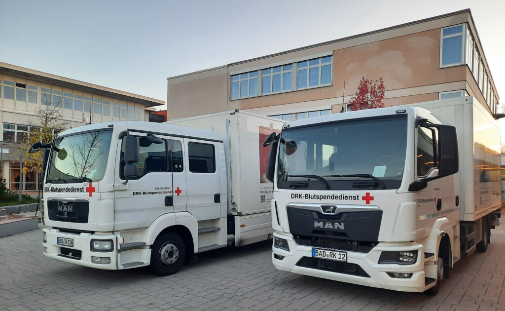 Die Fahrzeuge des Blutspendedienstes im Schulhof des Schulzentrums. Foto: DRK