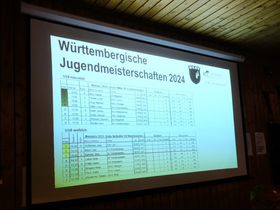 Bei den U 18 männlich fehlten Manuel Stölzle von der TSG nach dem Vorkampf – ausgetragen auf den Bahnen der SF Friedrichshafen – 14 Kegel um den Sprung ins Finale der letzten Acht zu schaffen. Hier siegte Levin Fälchle vom EKC Lonsee mit 1181 Kegeln vor Raphael Krog vom SKC Vilsingen 1148) und Jonas Willer von den SF Friedrichshafen (1126), der den letzten Podiumsplatz vor Tobias Merz (SV Magstadt) um zwei Kegel rettete, der wiederum weitere zwei Kegel vor Noel Seidler (SF Friedrichshafen) lag.