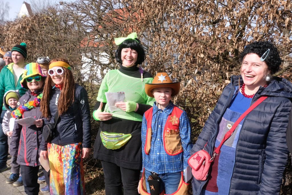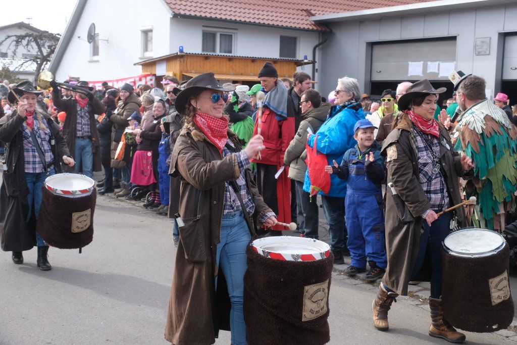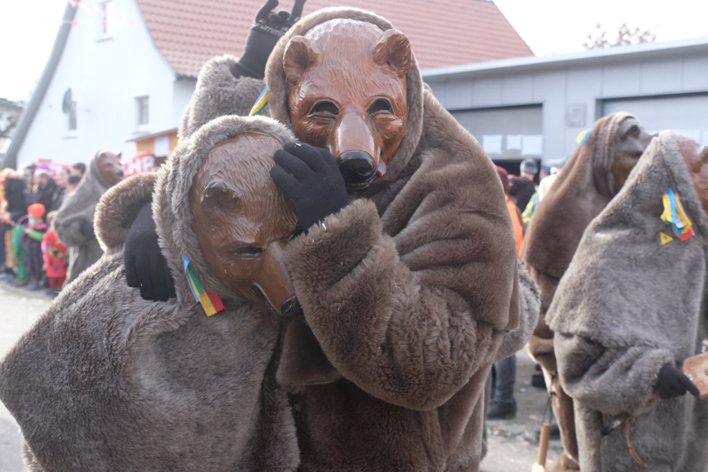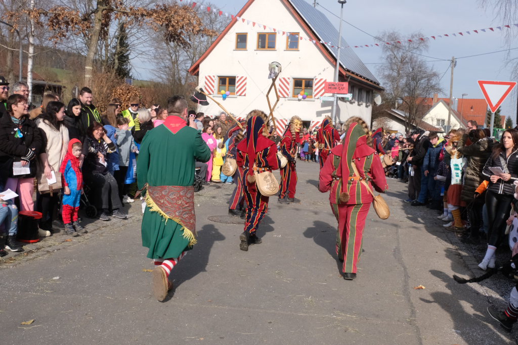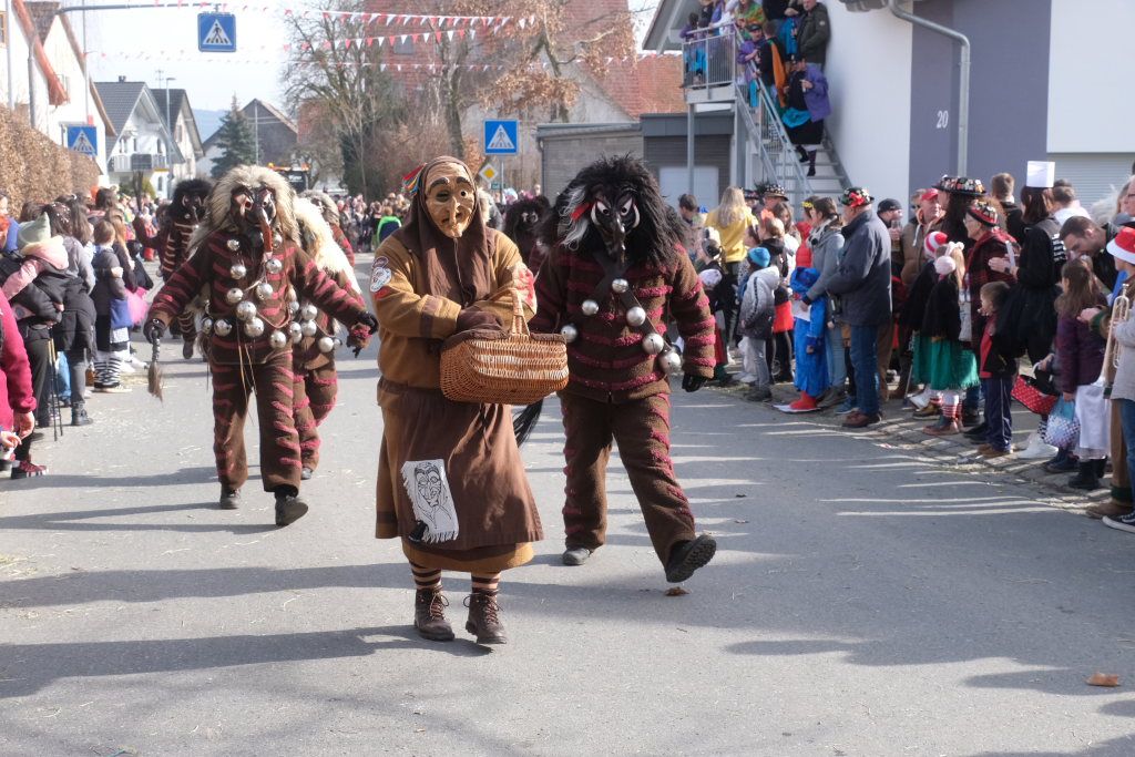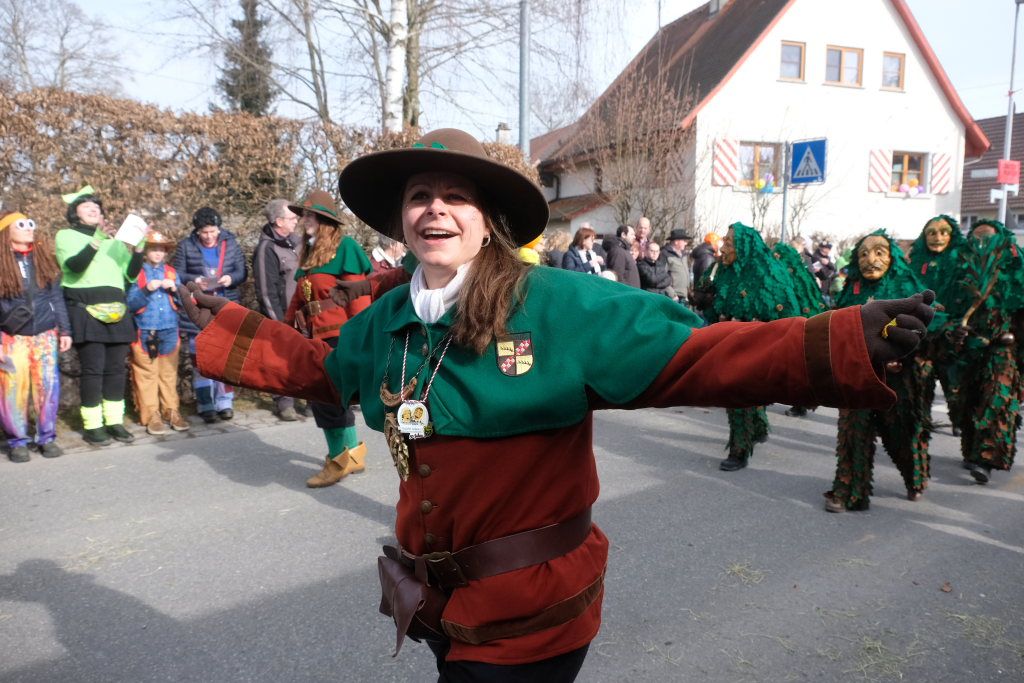 Als die Musikkapelle Haidgau, die traditionell den Umzug anführt, pünktlich um 13.33 Uhr beim Ehrengastwagen vorbeidefilierte, musste sie sich ihren Weg durch ein Spalier von Zuschauern bahnen. Nach der Zunftfahne, die gemeinsam mit Wachtmeister und Fasnetslader die kleine Haidgauer Abordnung mit dem Narrensomen von Chadaloh, Hugibold und Co. anführte, folgte in diesem Jahr erstmals die närrische Abordnung des Kindergartens St. Nikolaus, die ihrem Narrenruf „Vogel-Wild“ durchaus gerecht wurde.