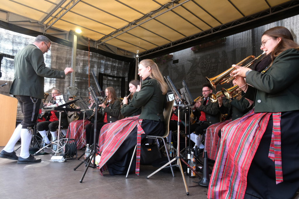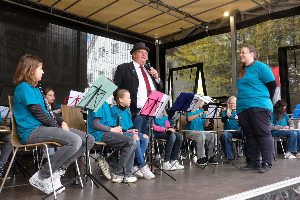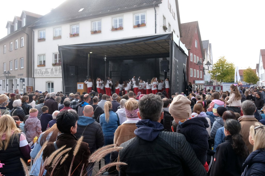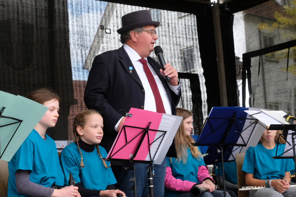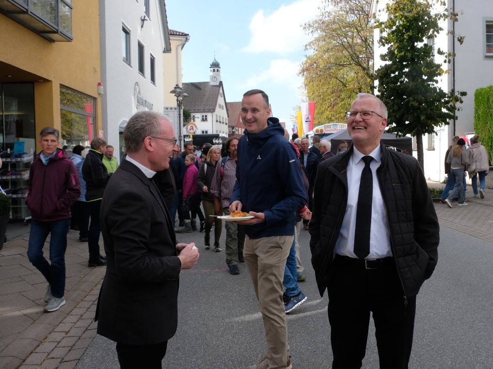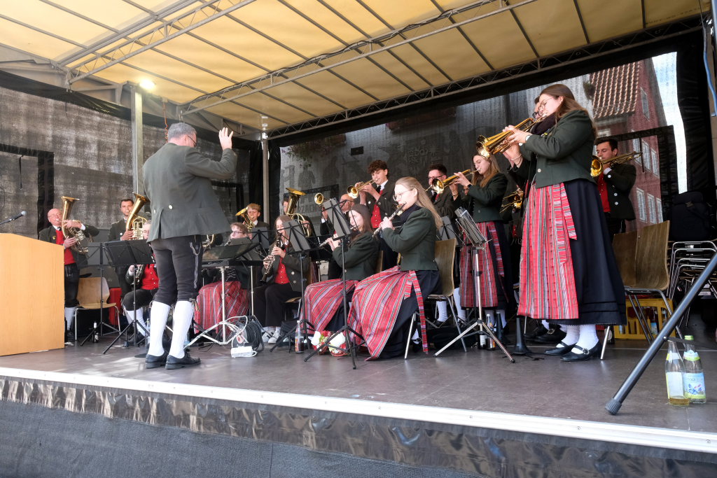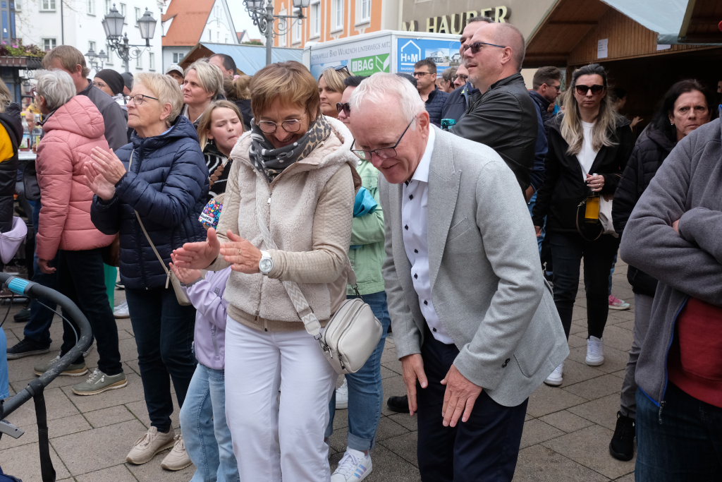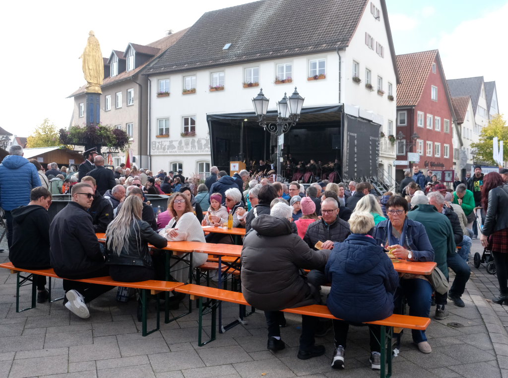 Nach den offiziellen Feierlichkeiten am Vormittag mit dem großen Fahnenzug vom Rathaus zur Kirche und zurück und der sich daran anschließenden Festrede von Bürgermeisterin Alexandra Scherer (siehe Bericht des “Wurzachers”) startete mit dem Frühschoppenkonzert der Musikkapelle Eggmannsried ab 12.00 Uhr auf der Bühne am Rathaus das Festprogramm und die Geschäfte der Innenstadt öffneten ihre Türen.
