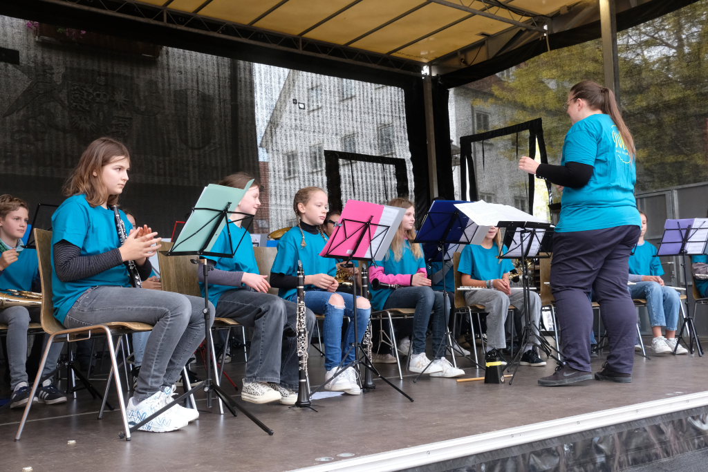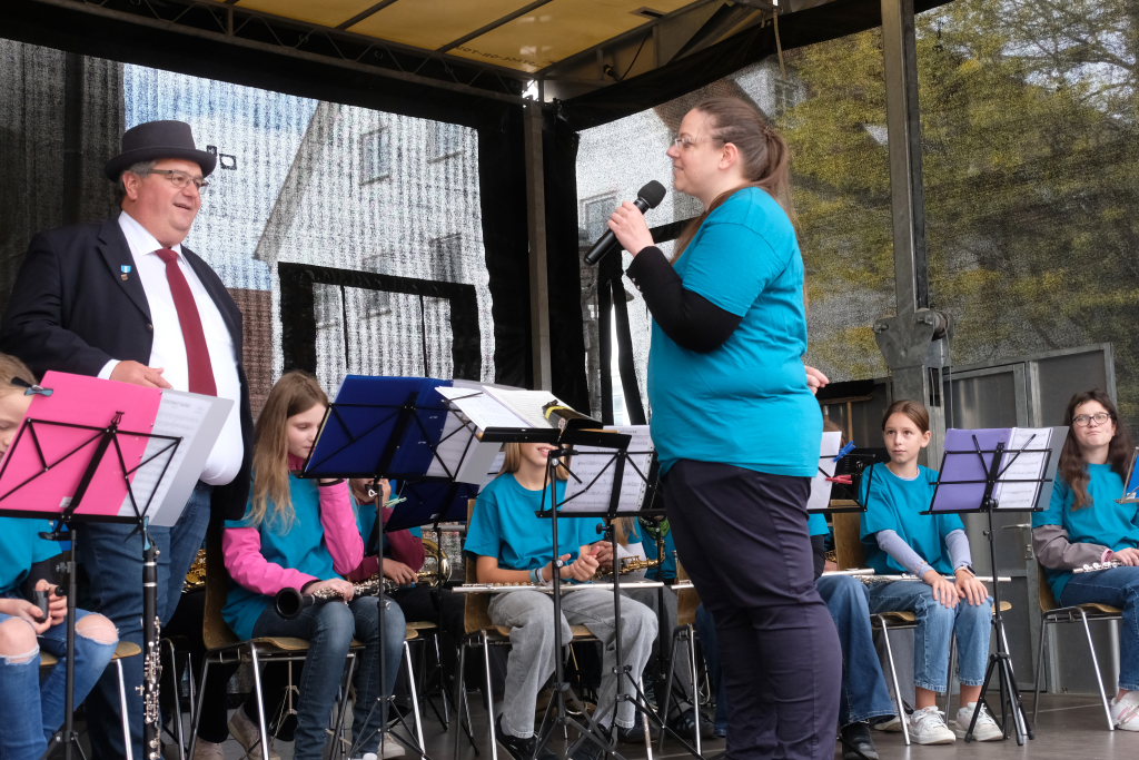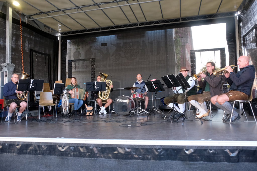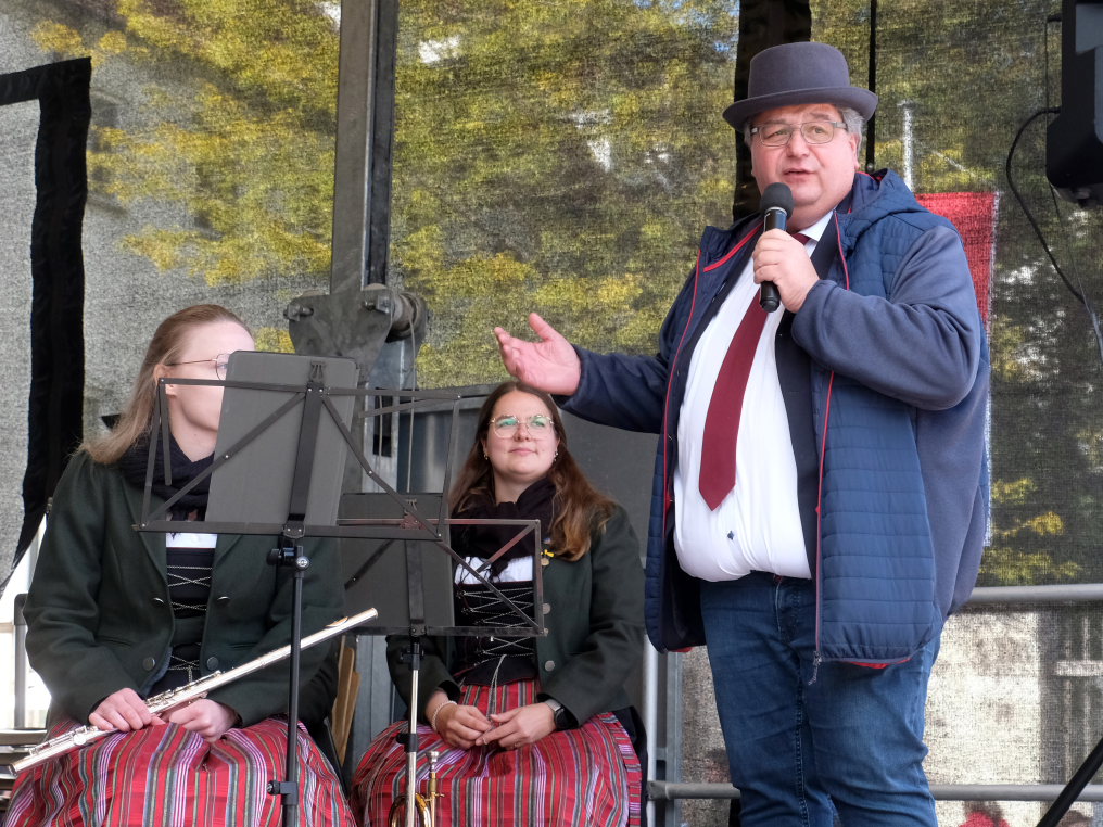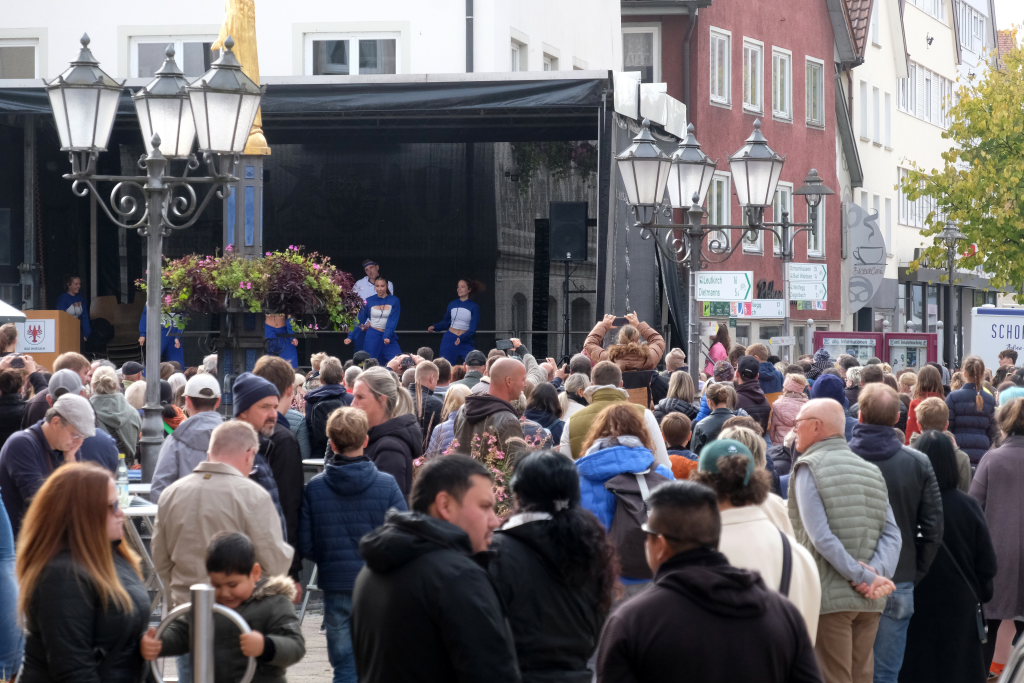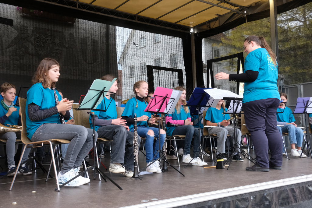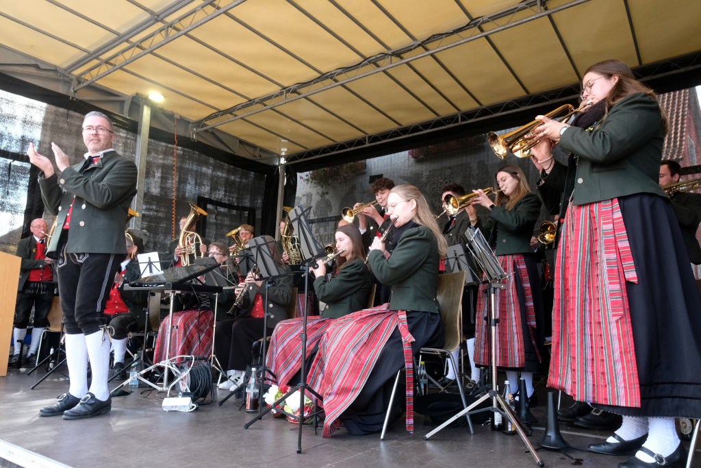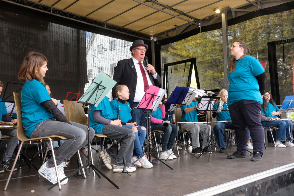 Nach den offiziellen Feierlichkeiten am Vormittag mit dem großen Fahnenzug vom Rathaus zur Kirche und zurück und der sich daran anschließenden Festrede von Bürgermeisterin Alexandra Scherer (siehe Bericht des “Wurzachers”) startete mit dem Frühschoppenkonzert der Musikkapelle Eggmannsried ab 12.00 Uhr auf der Bühne am Rathaus das Festprogramm und die Geschäfte der Innenstadt öffneten ihre Türen.